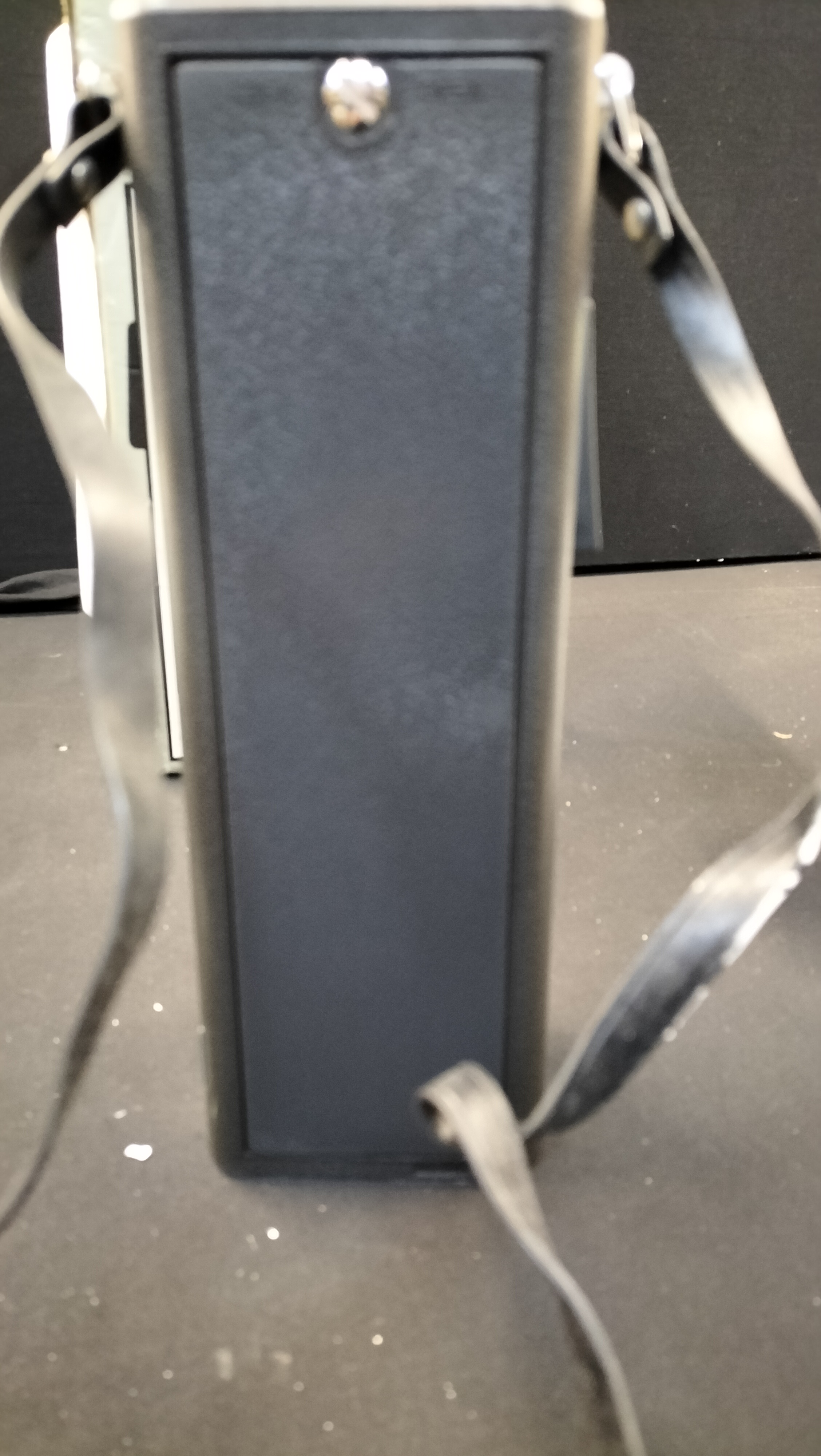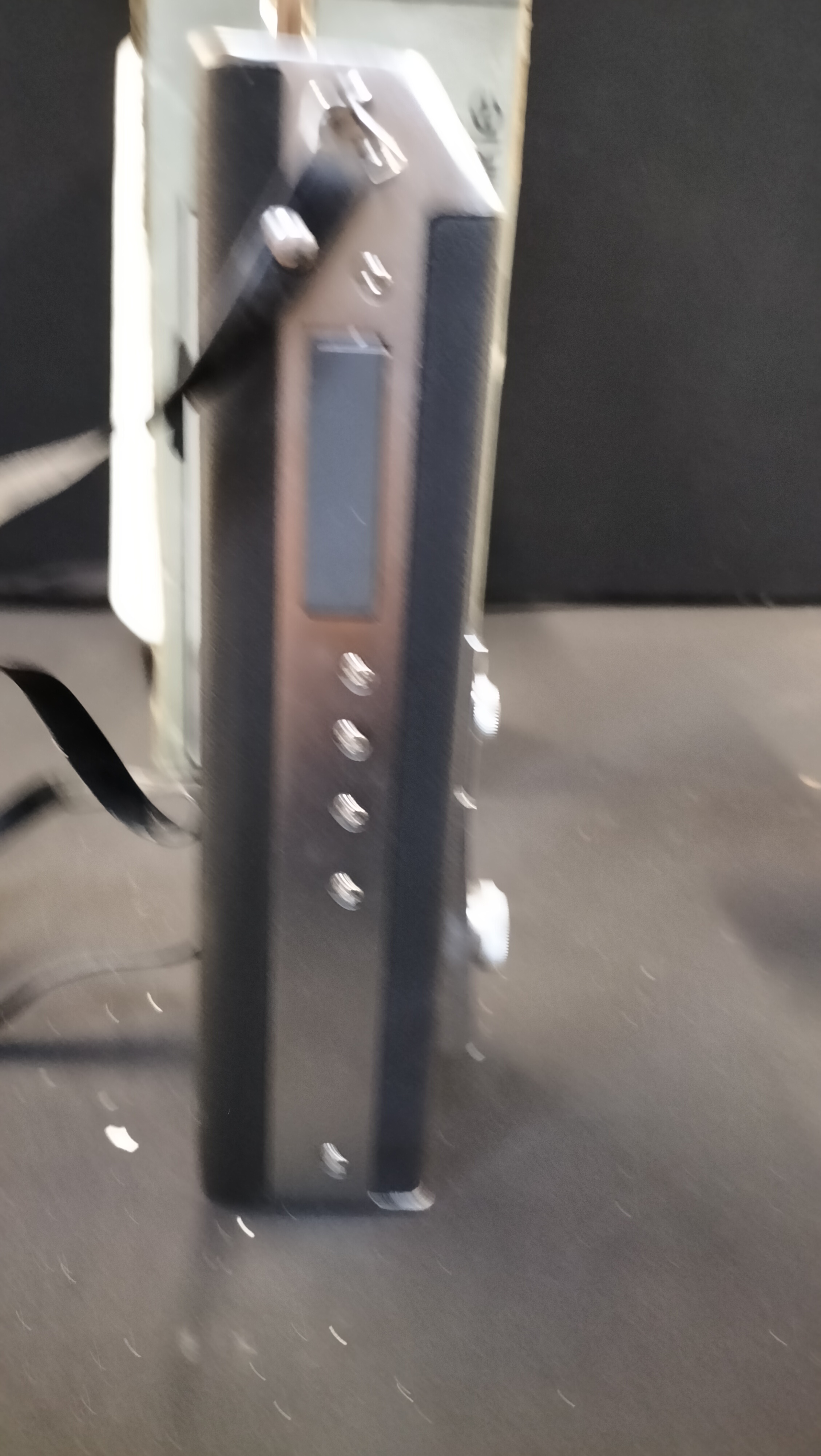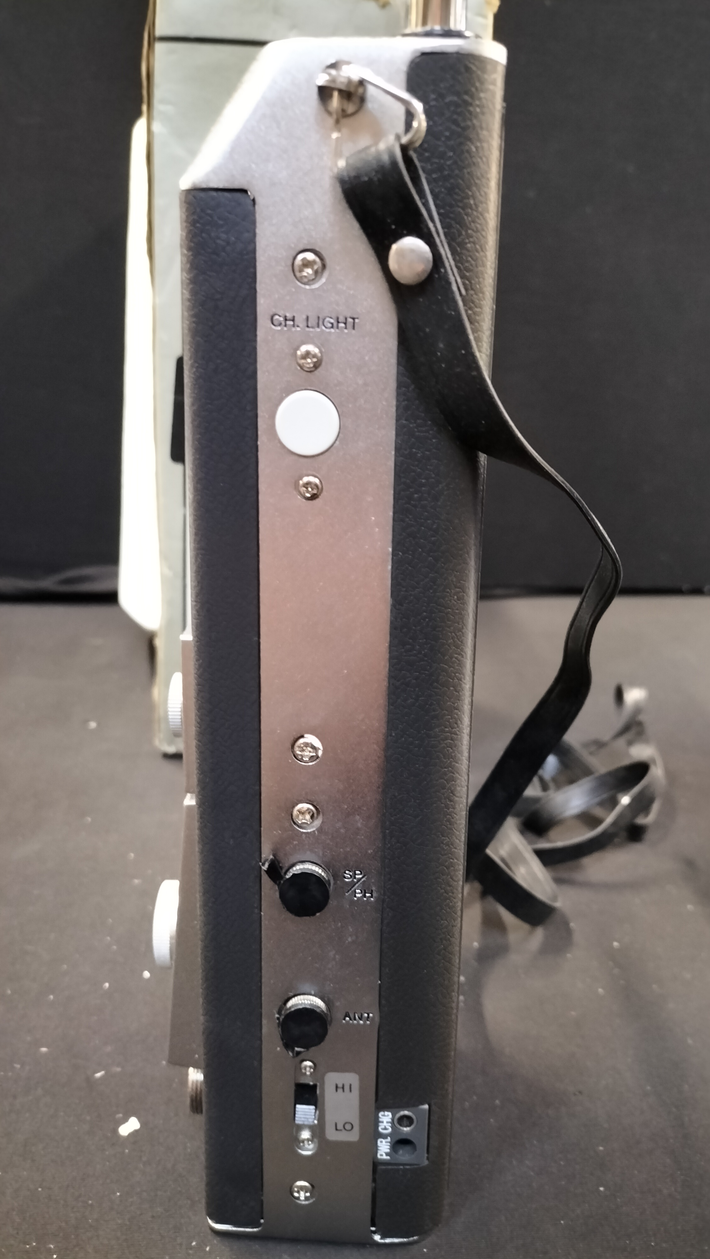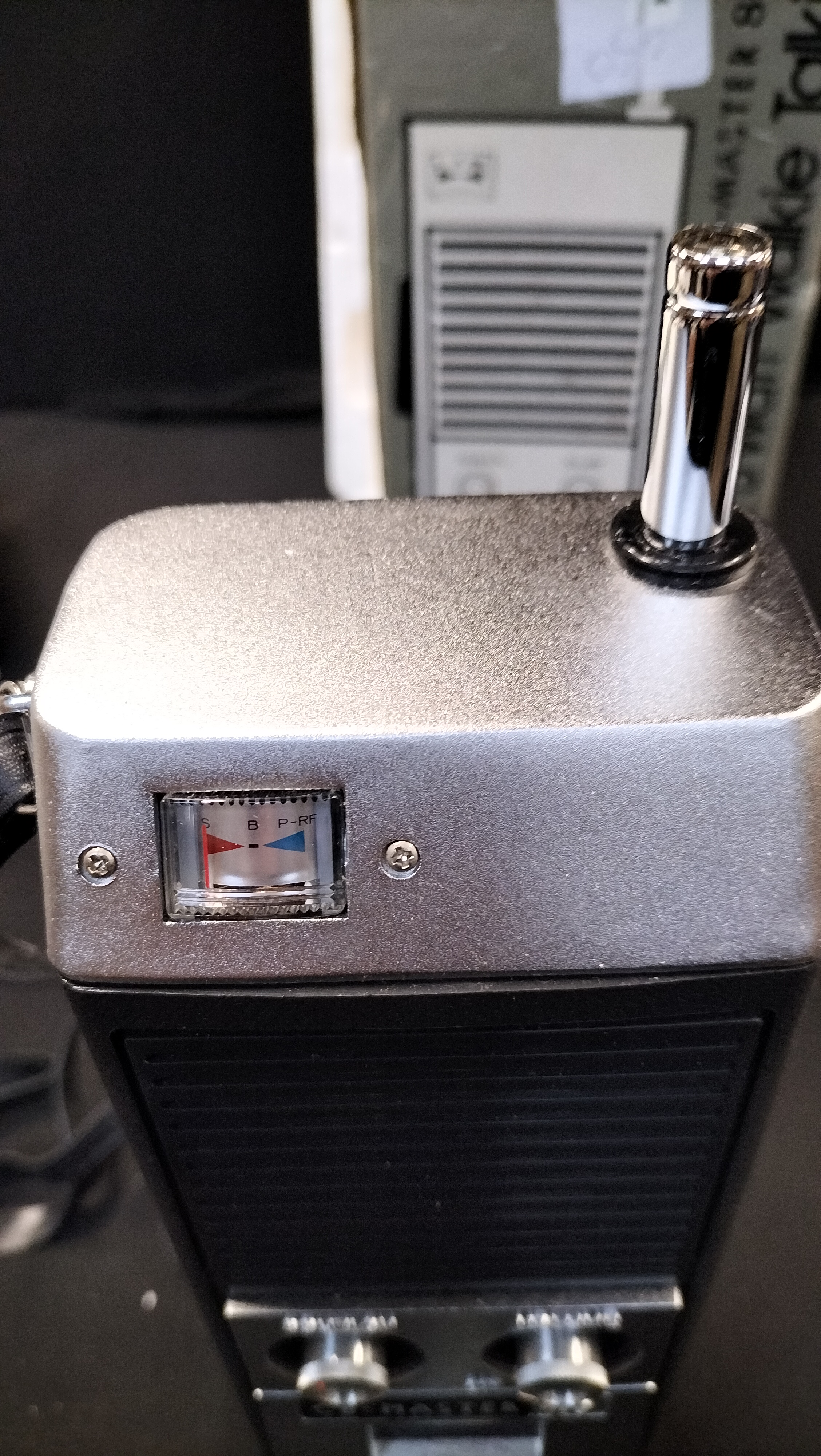 A black and silver handheld CB-Master walkie-talkie featuring squelch and volume controls, complete with a telescopic antenna and original box.