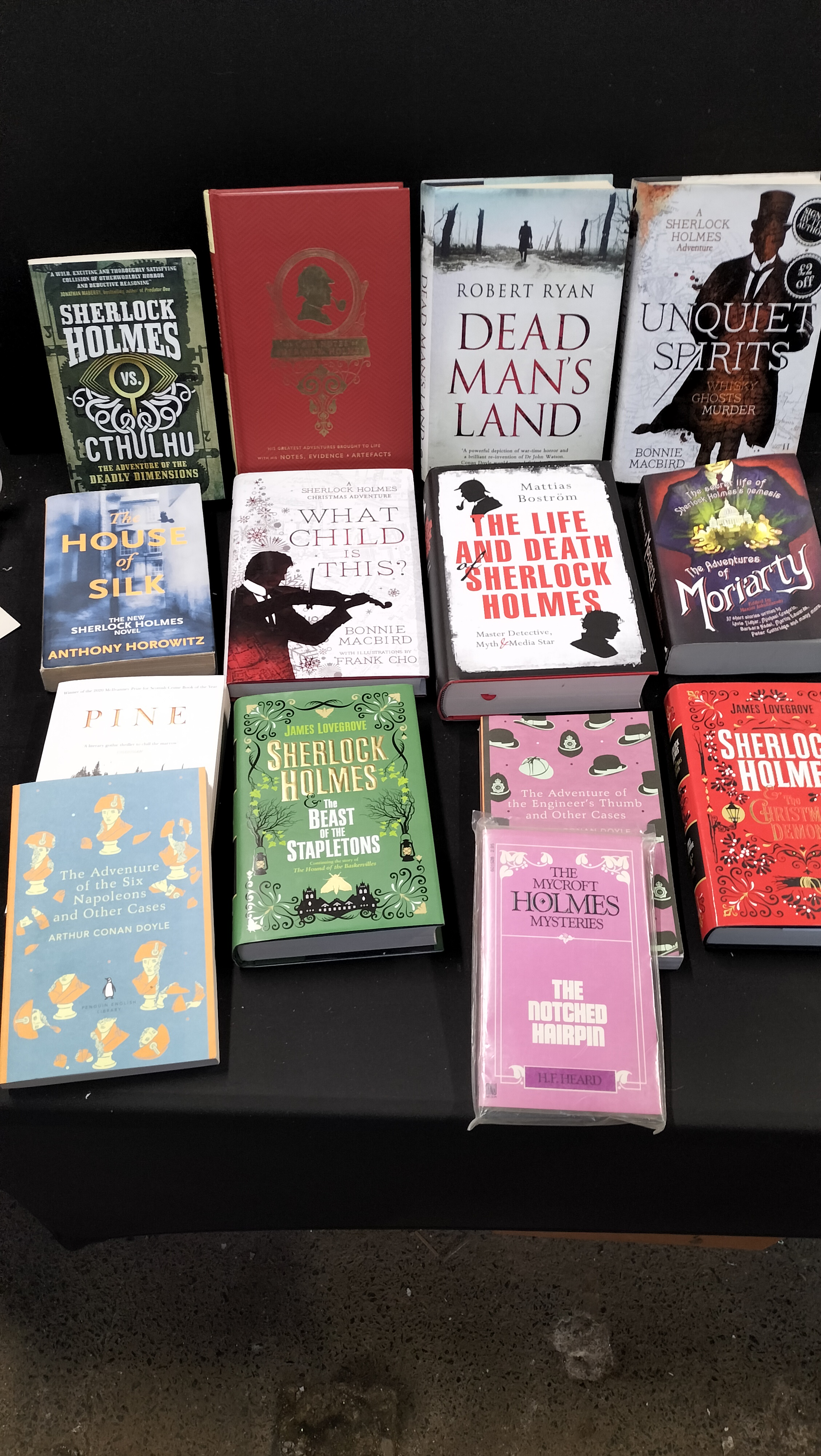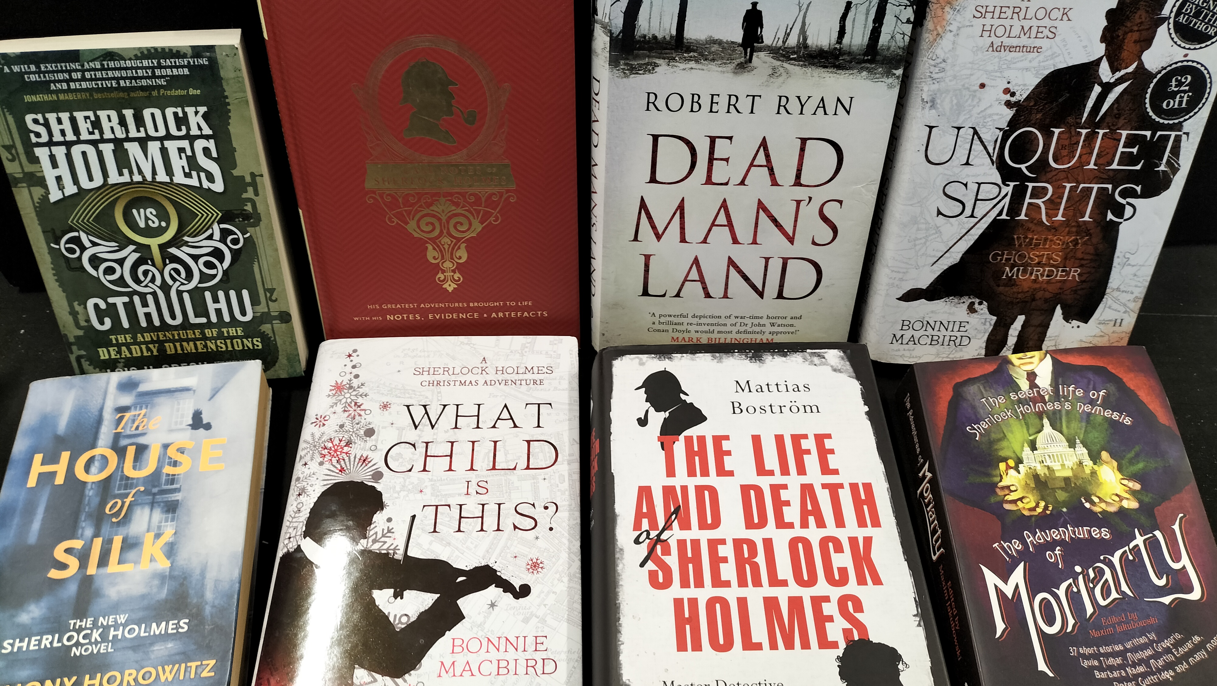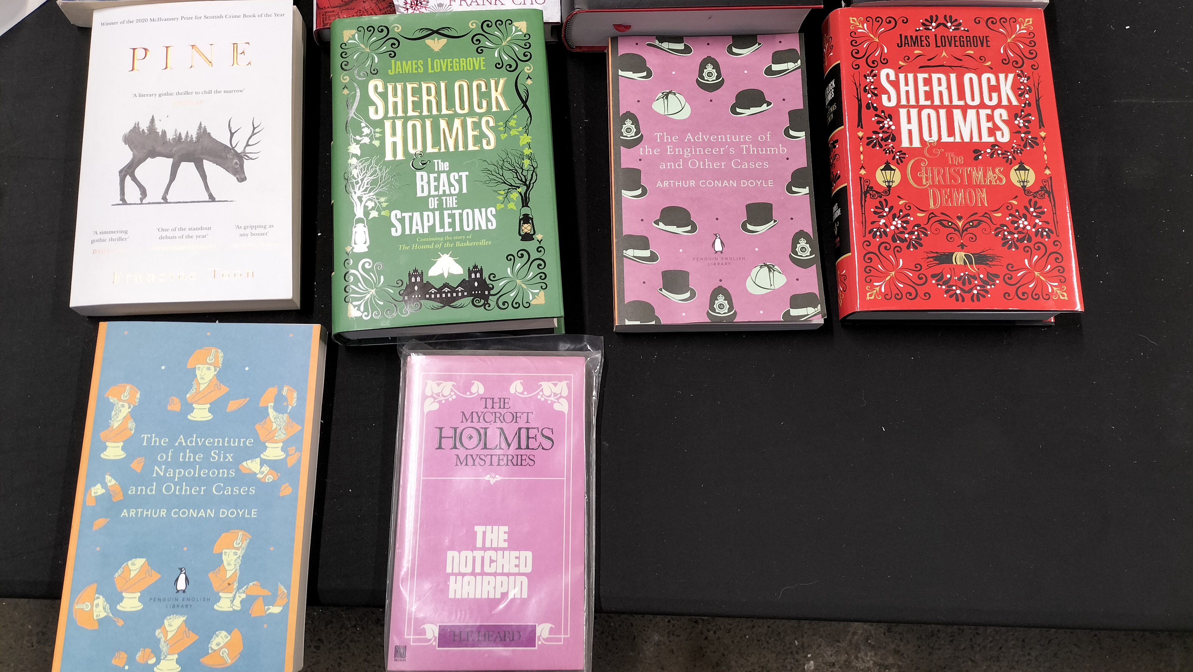 A collection of 14 books primarily featuring Sherlock Holmes literature, including titles by Arthur Conan Doyle, James Lovegrove, and Bonnie MacBird.