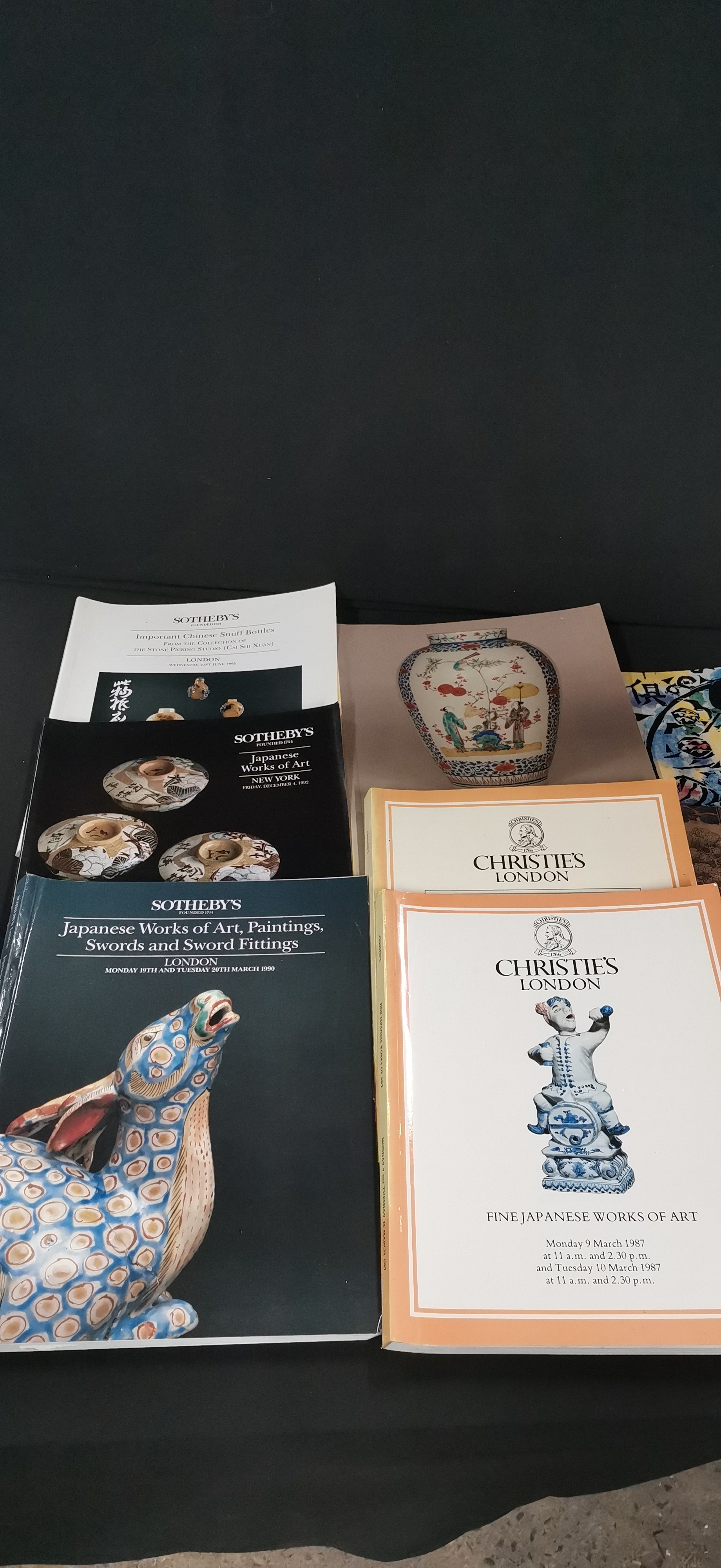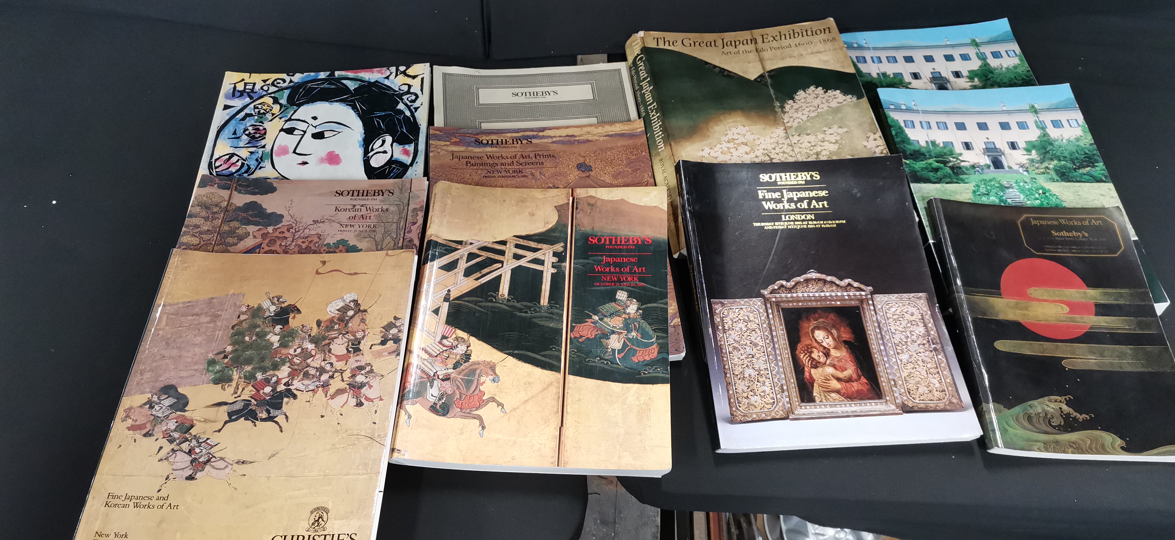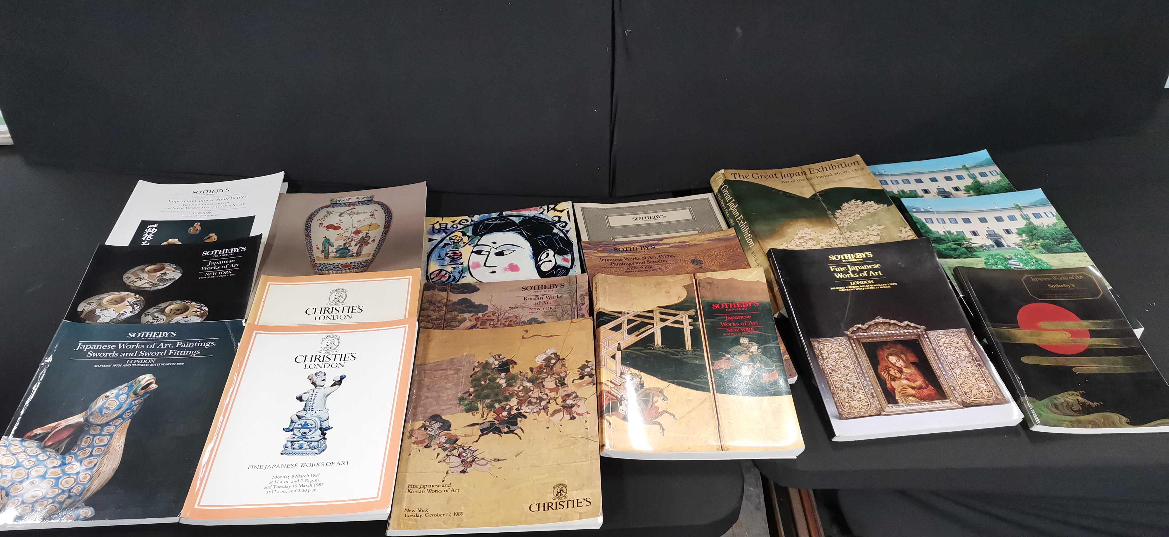 A collection of auction catalogues and art books primarily focused on Japanese, Korean, and Chinese works of art from Sotheby’s and Christie’s London and New York.