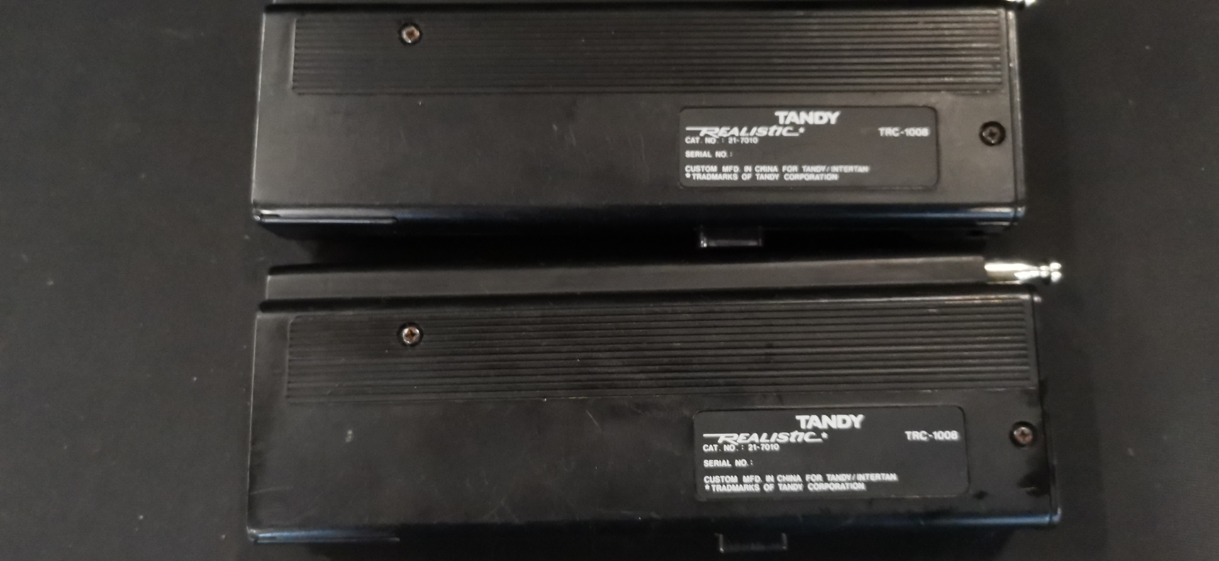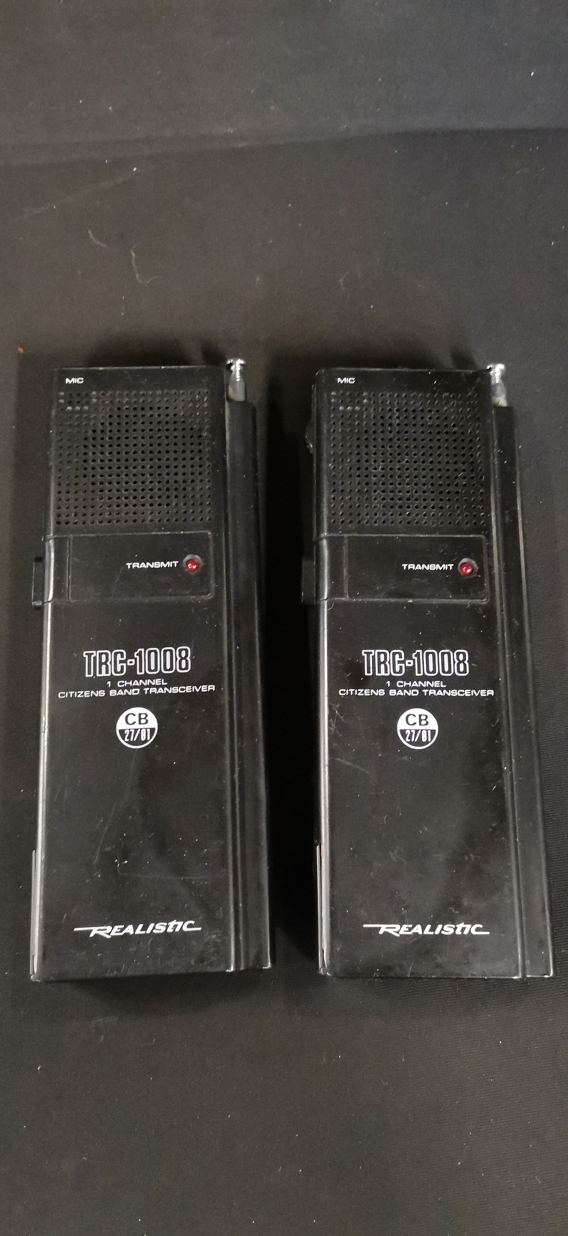 A pair of black Realistic TRC-1008 1-channel Citizens Band transceivers manufactured for Tandy Corporation with catalogue number 21-7010.