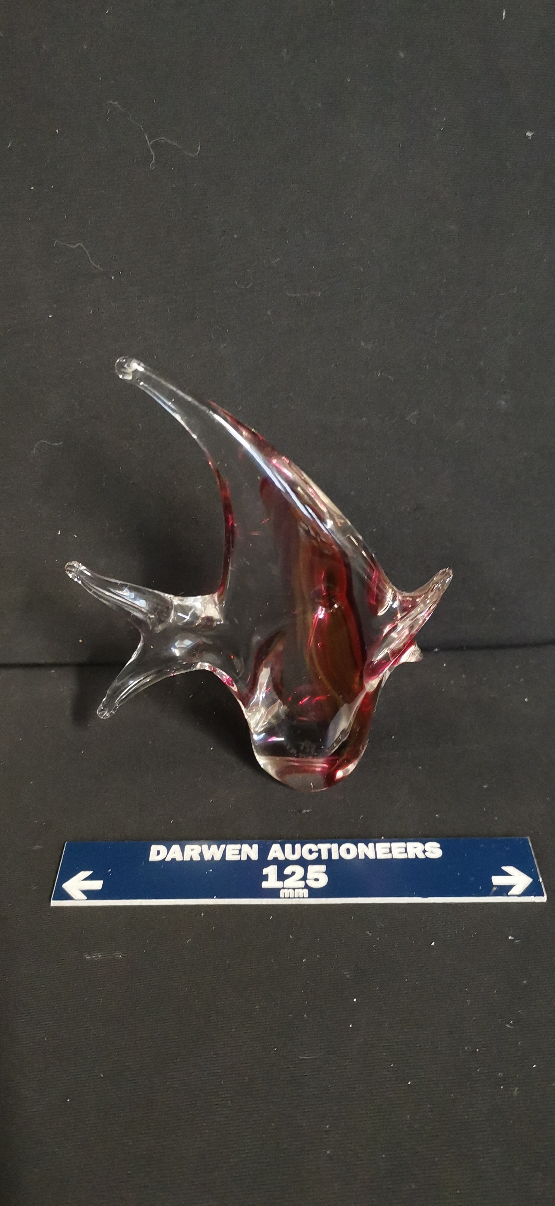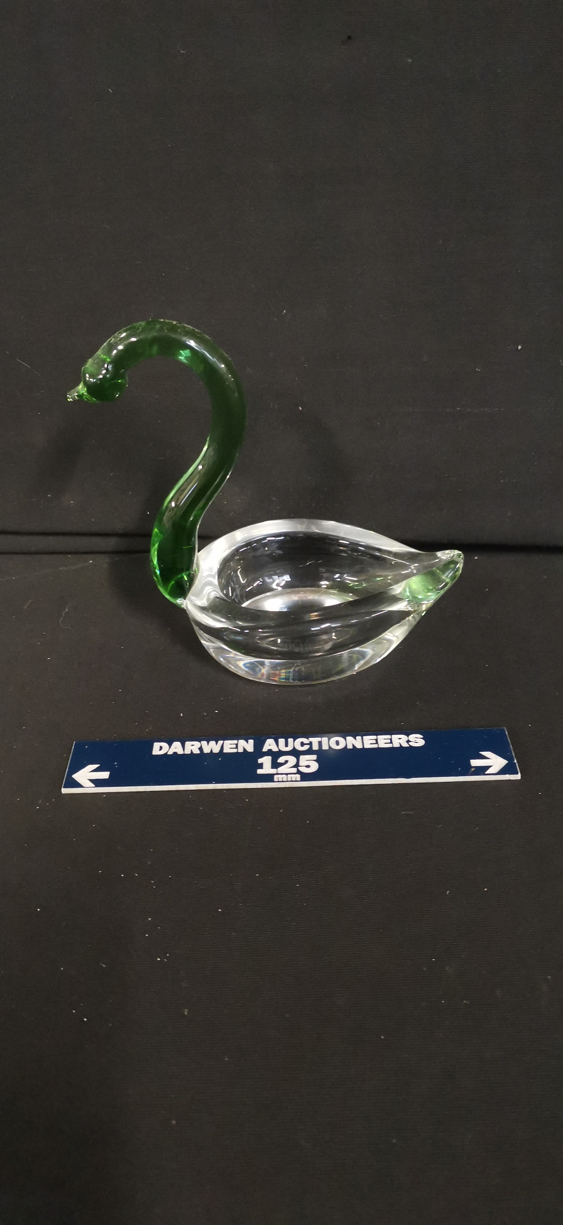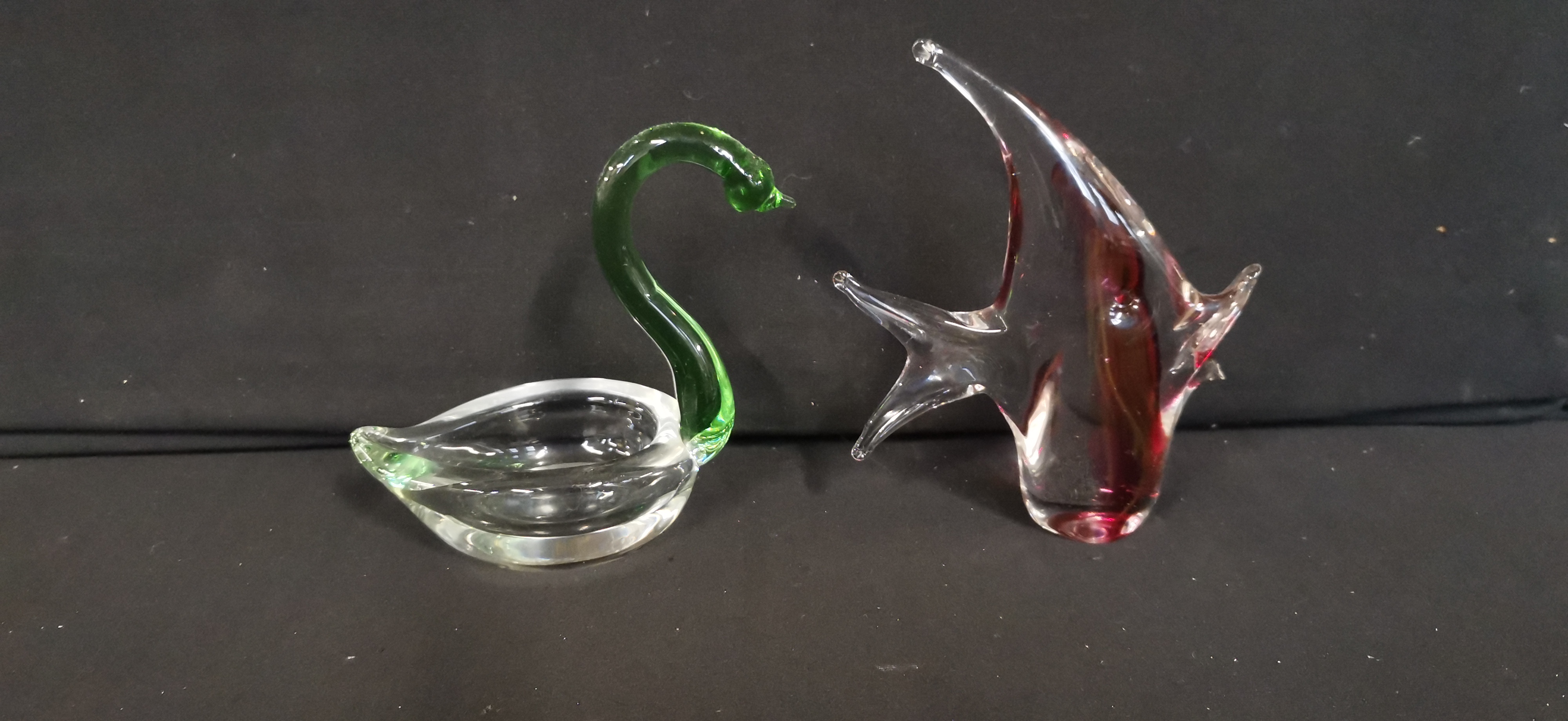 Two glass figurines comprising a green and clear swan and a clear fish with internal reddish-purple colouring, measuring approximately 125mm in length.