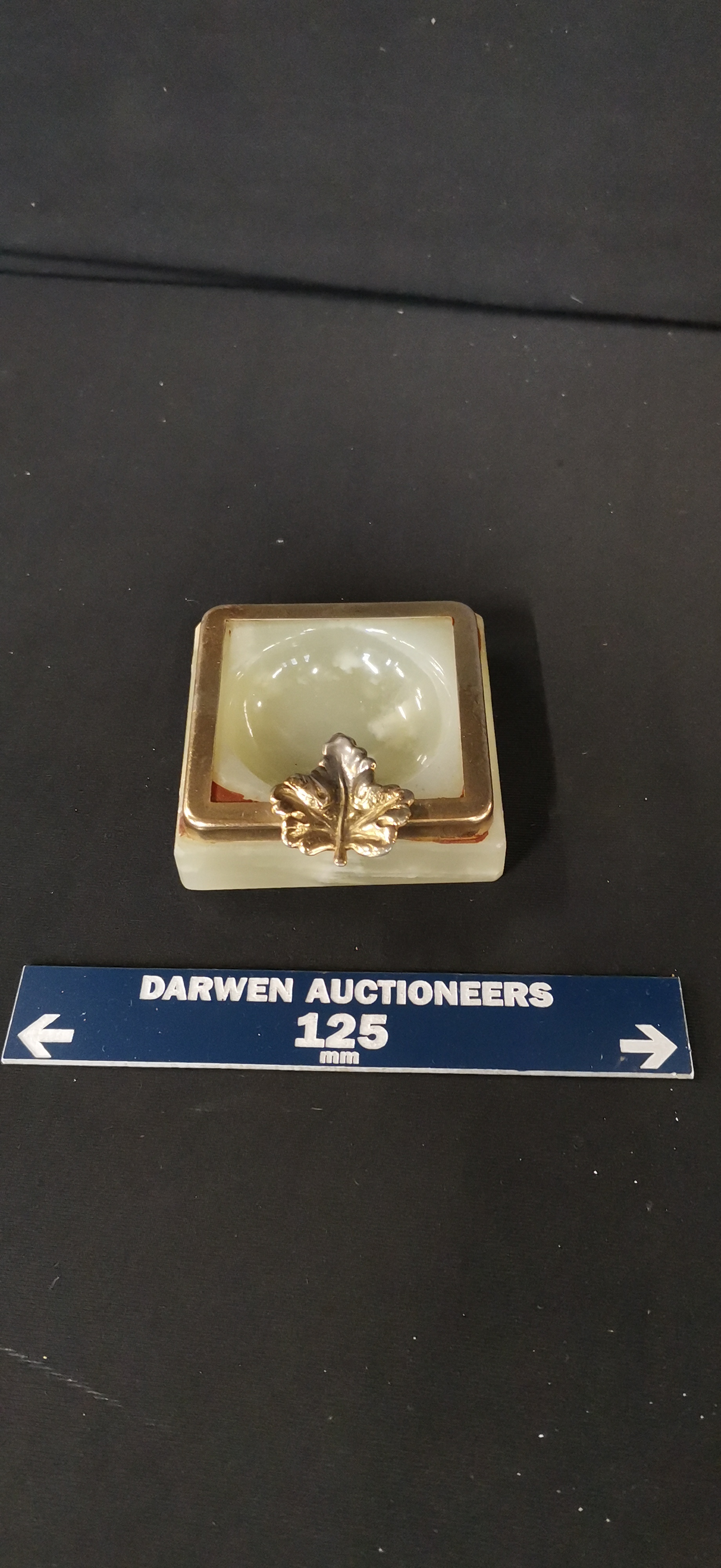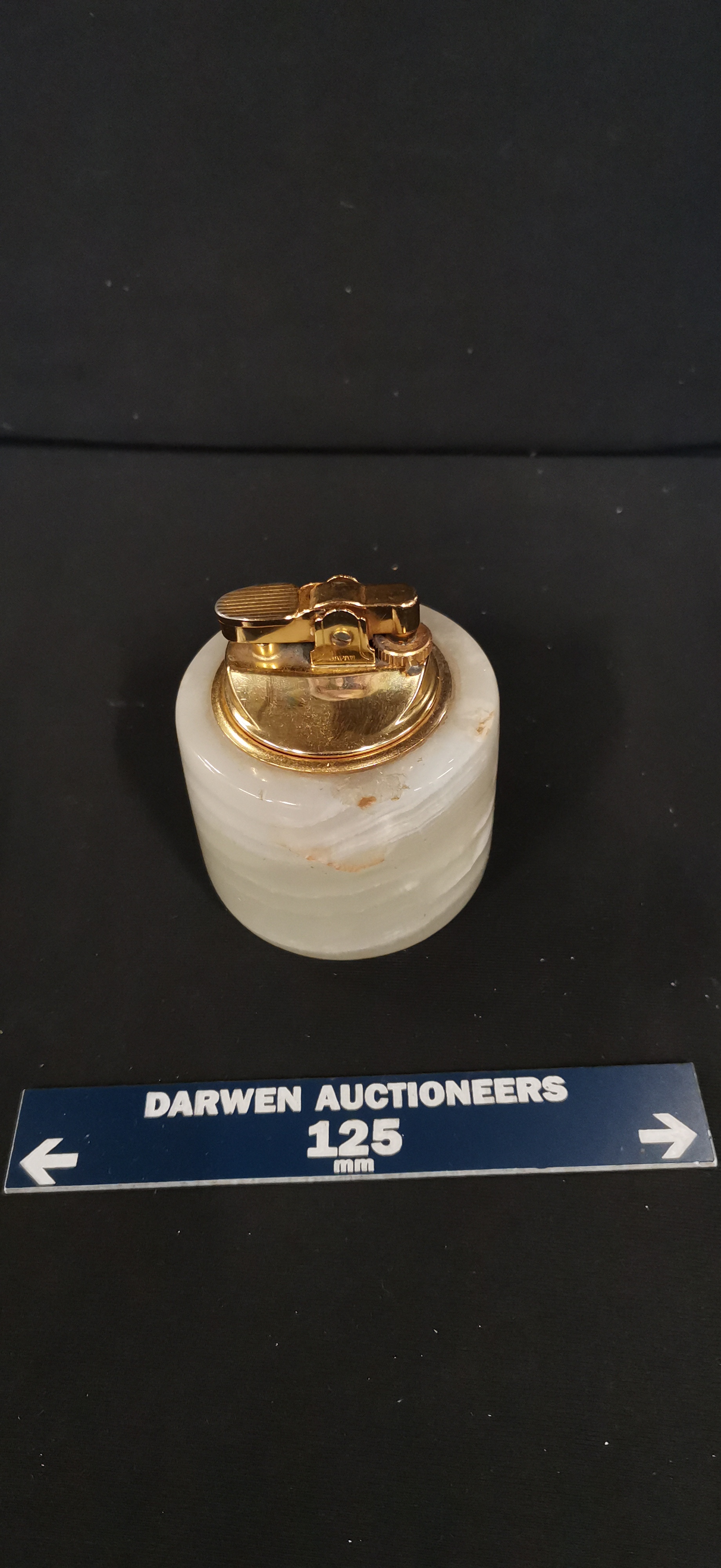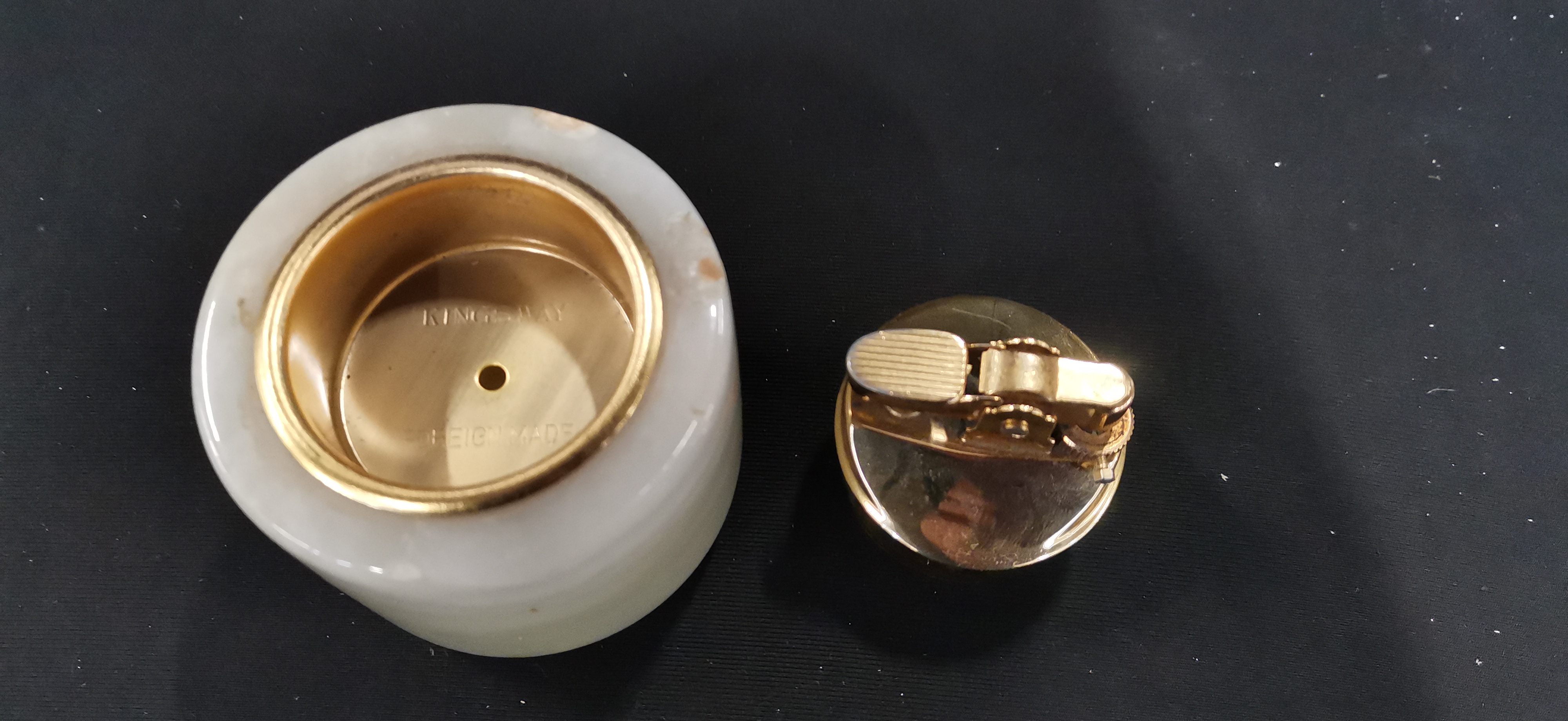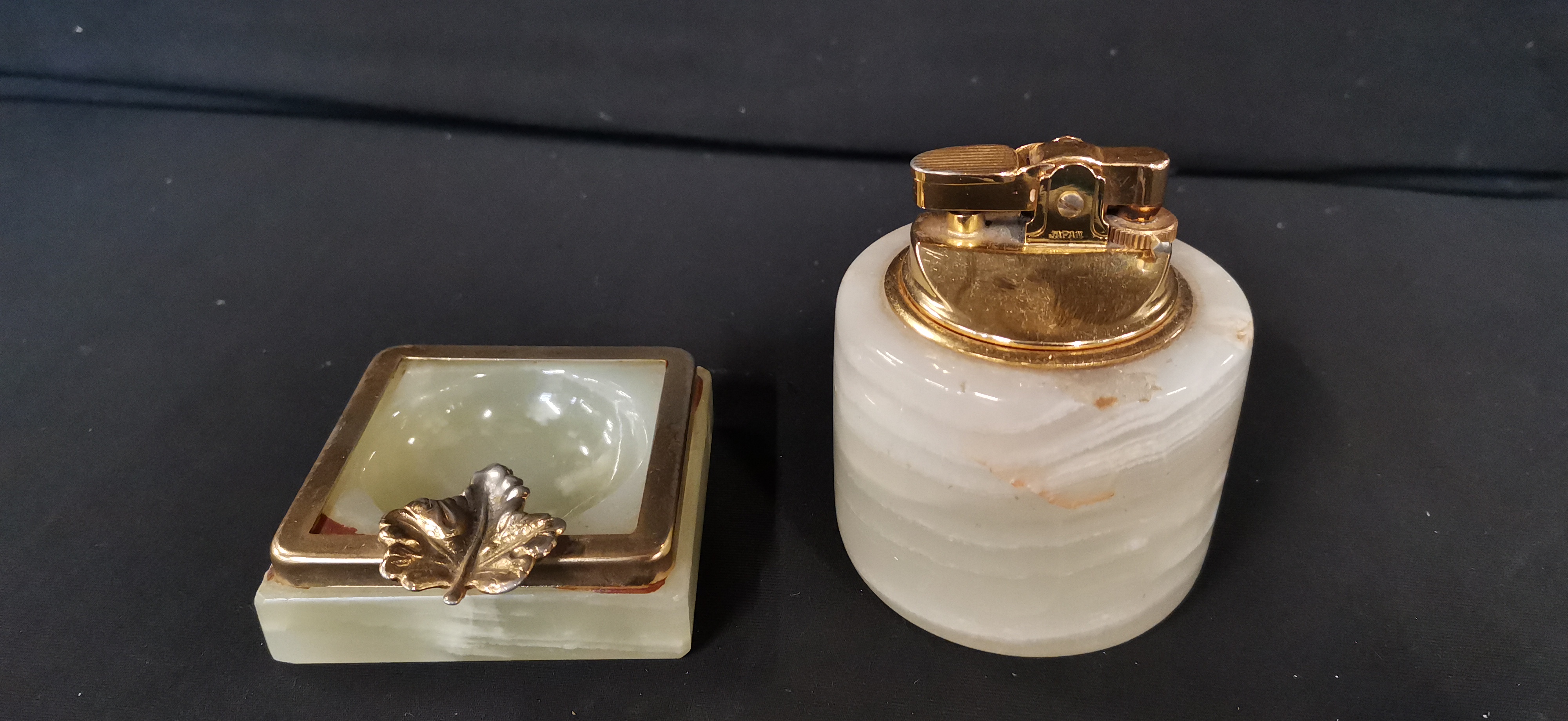 A translucent white onyx table lighter with a gold-tone Kingsway mechanism and a matching square ashtray featuring a leaf-shaped rest.