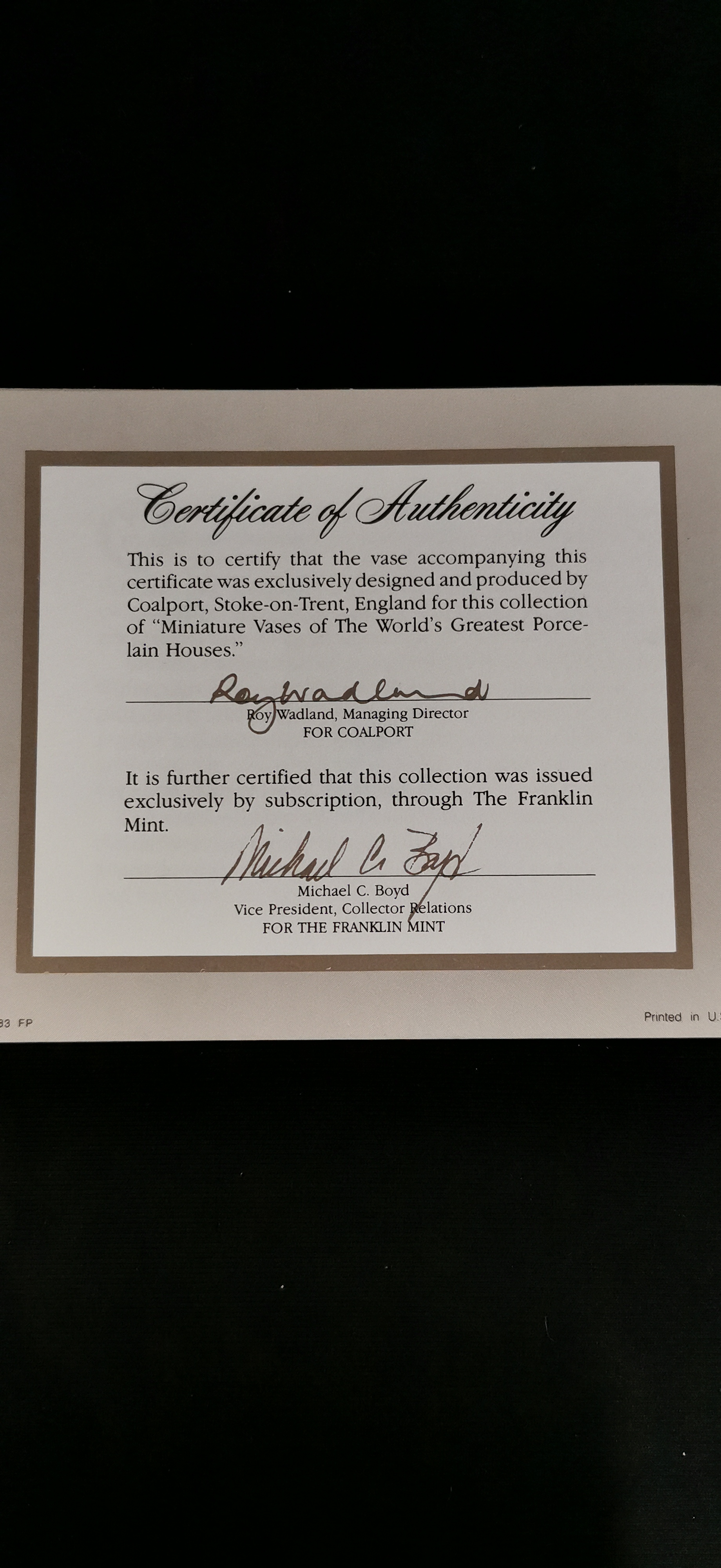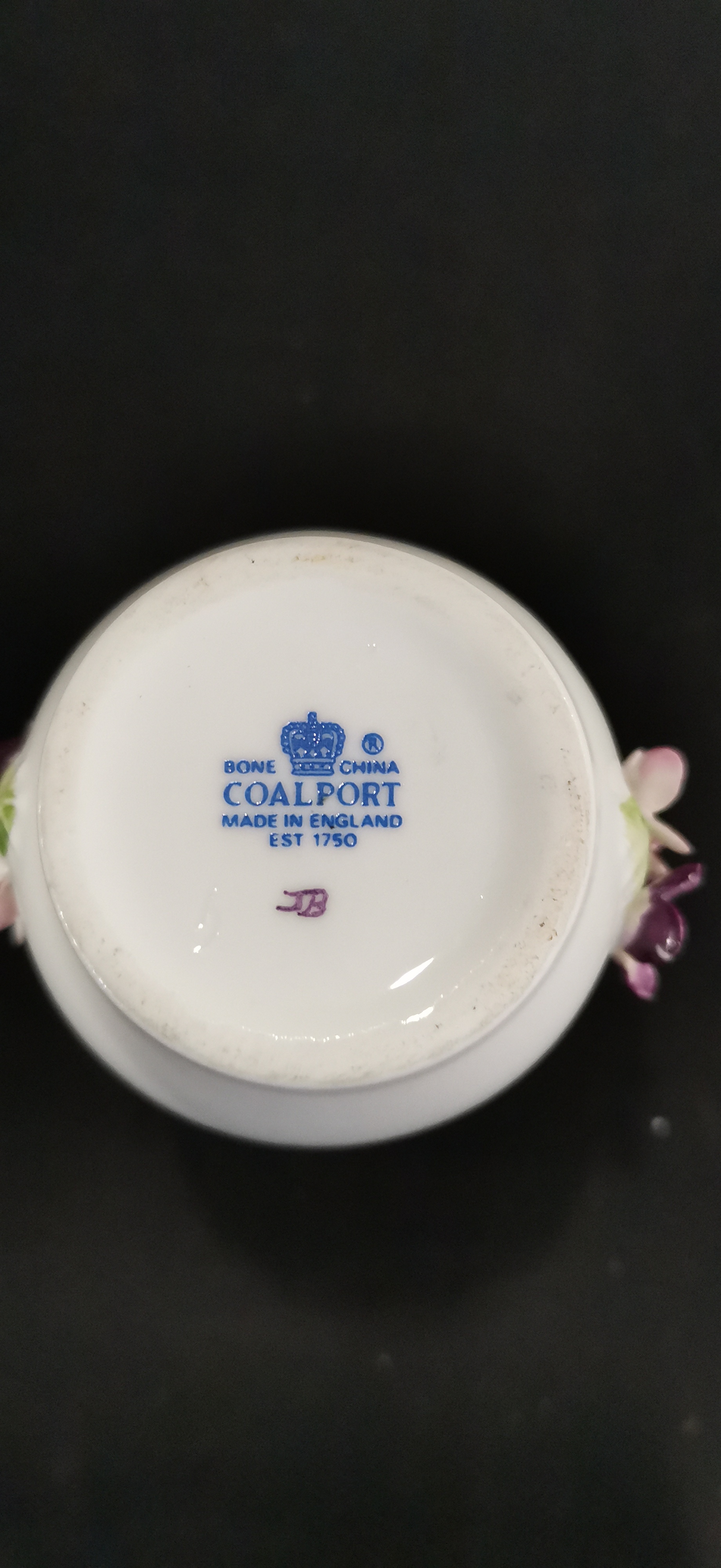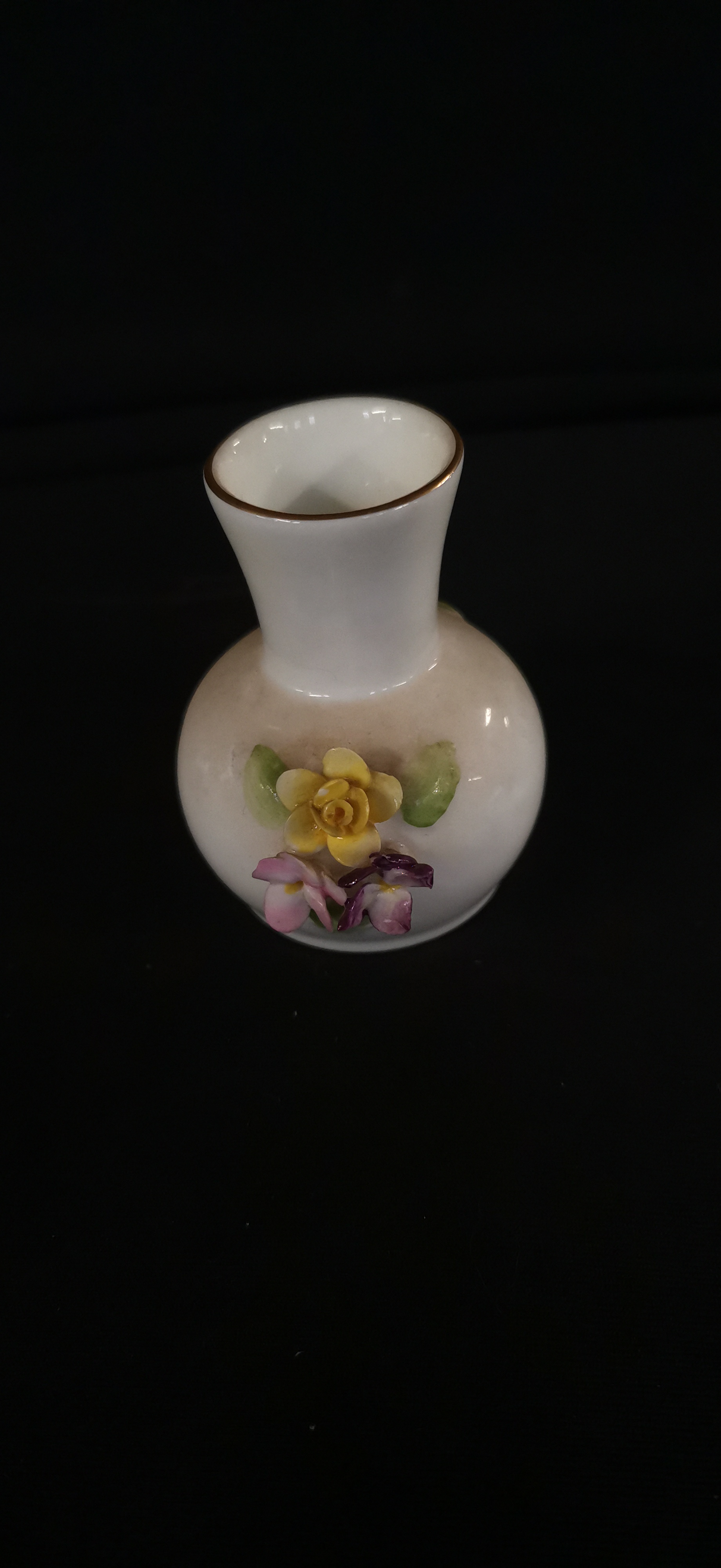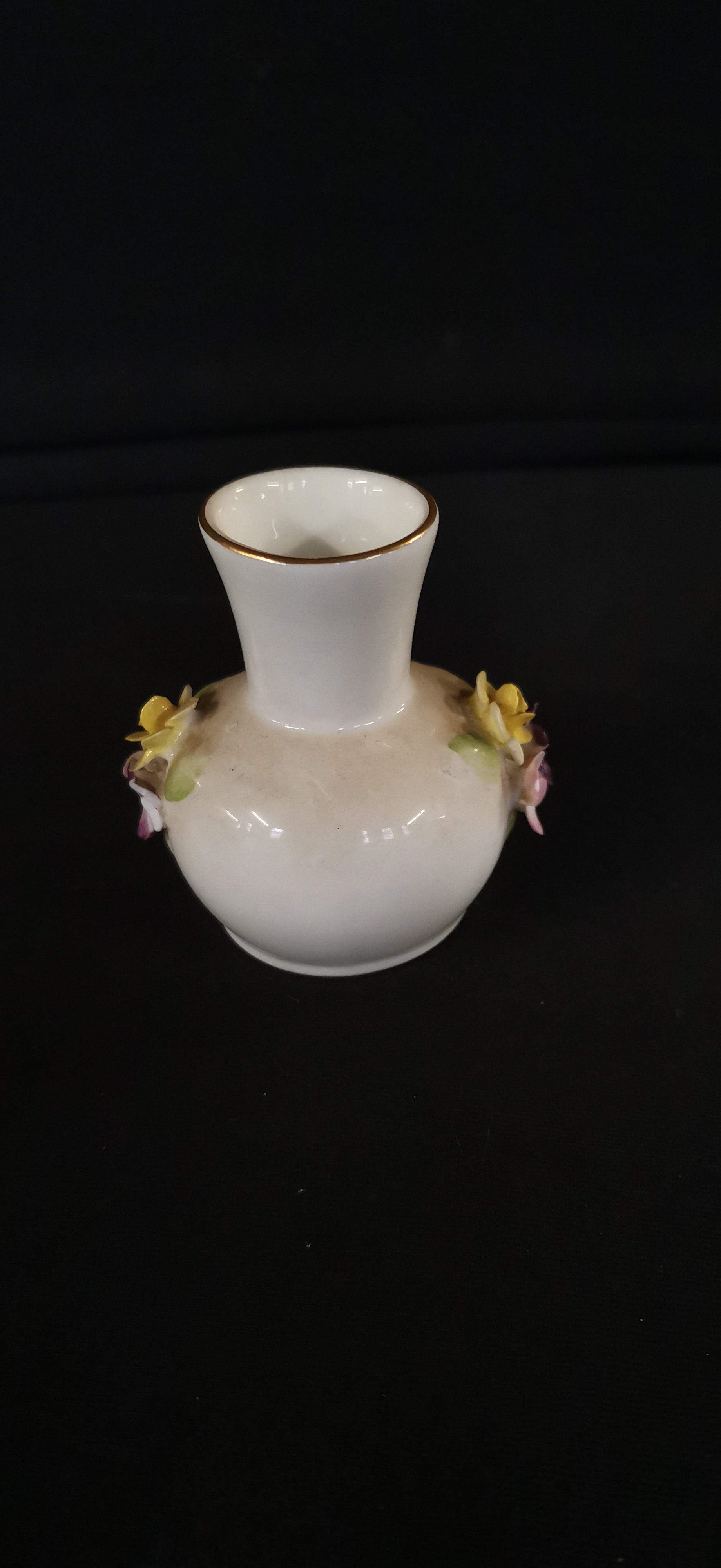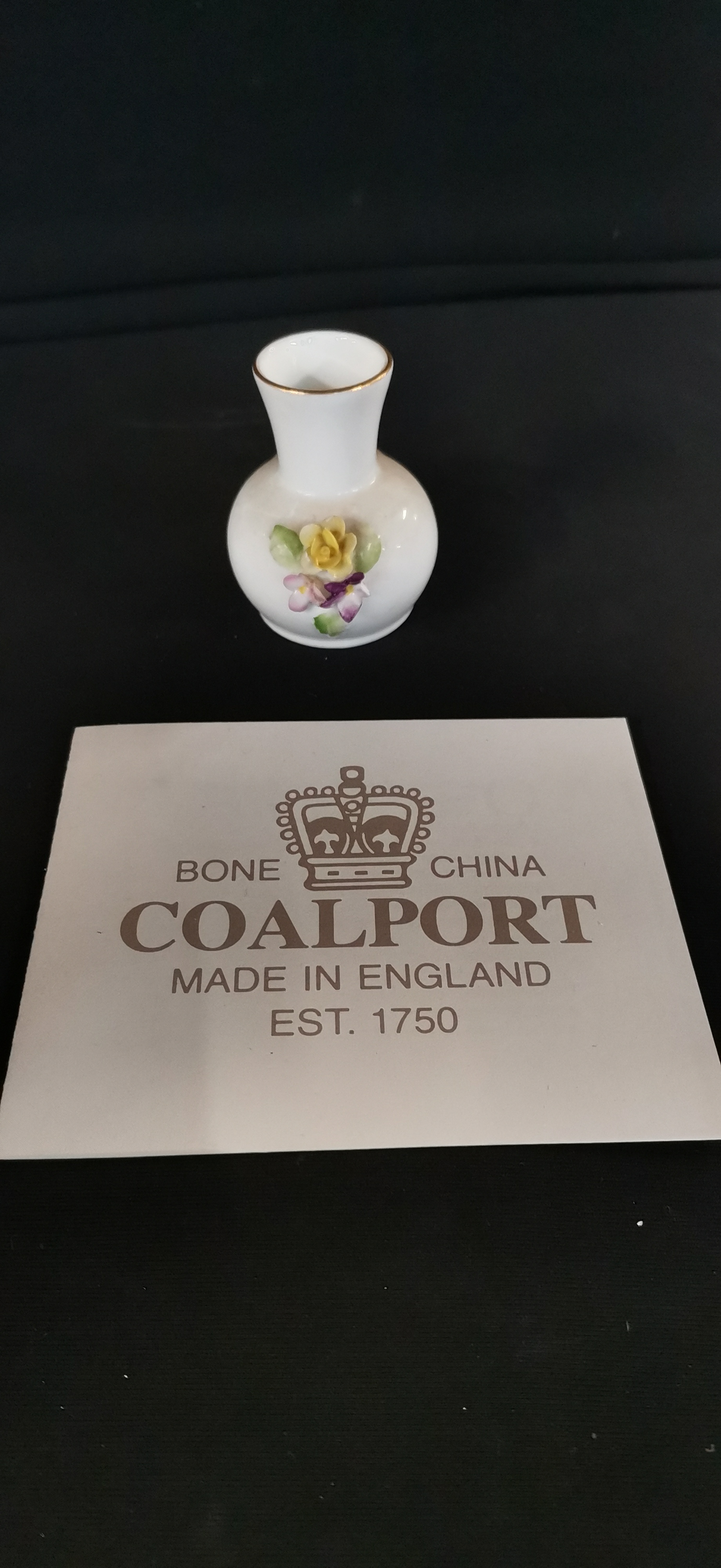 A white bone china miniature vase featuring a gold-gilded rim and applied floral decorations, marked to the base with the Coalport crown logo and initials JB.