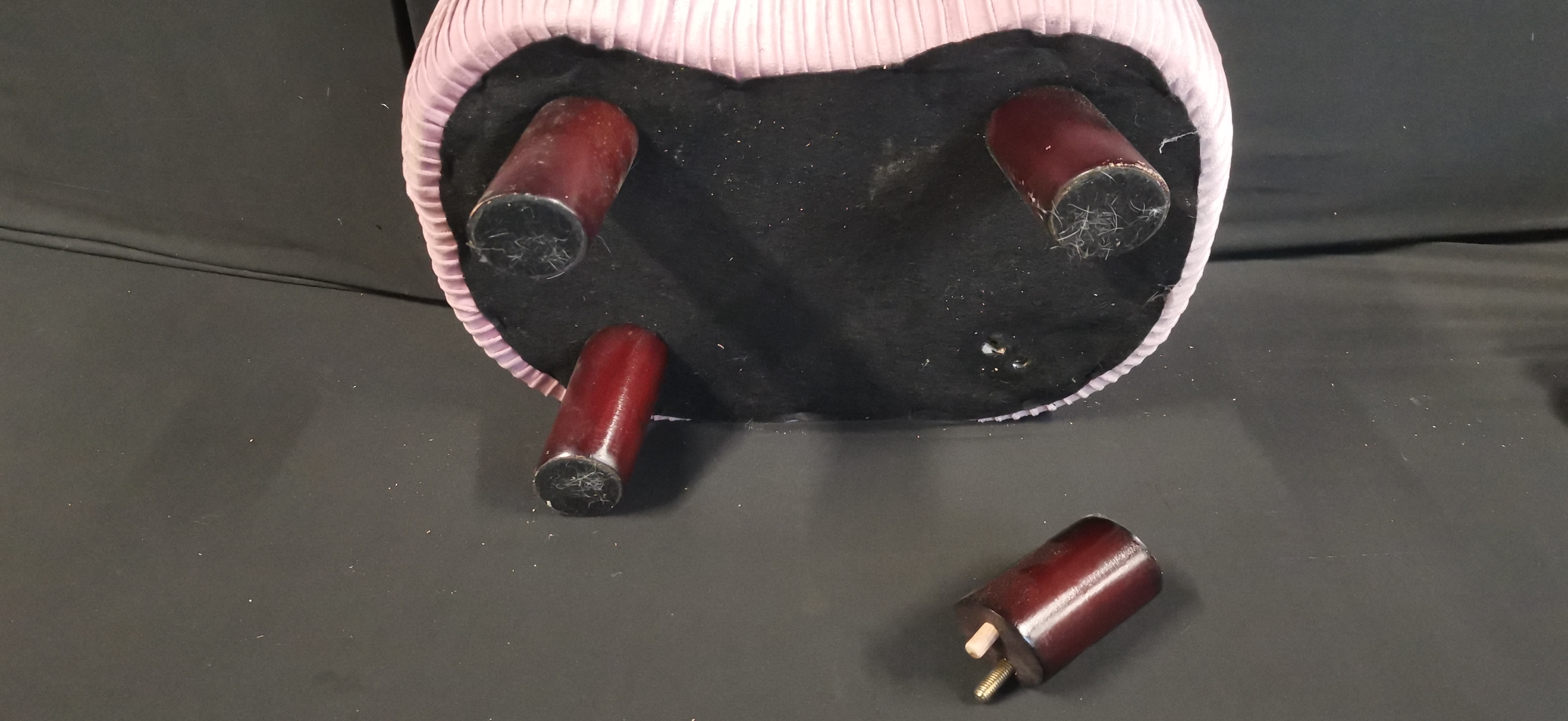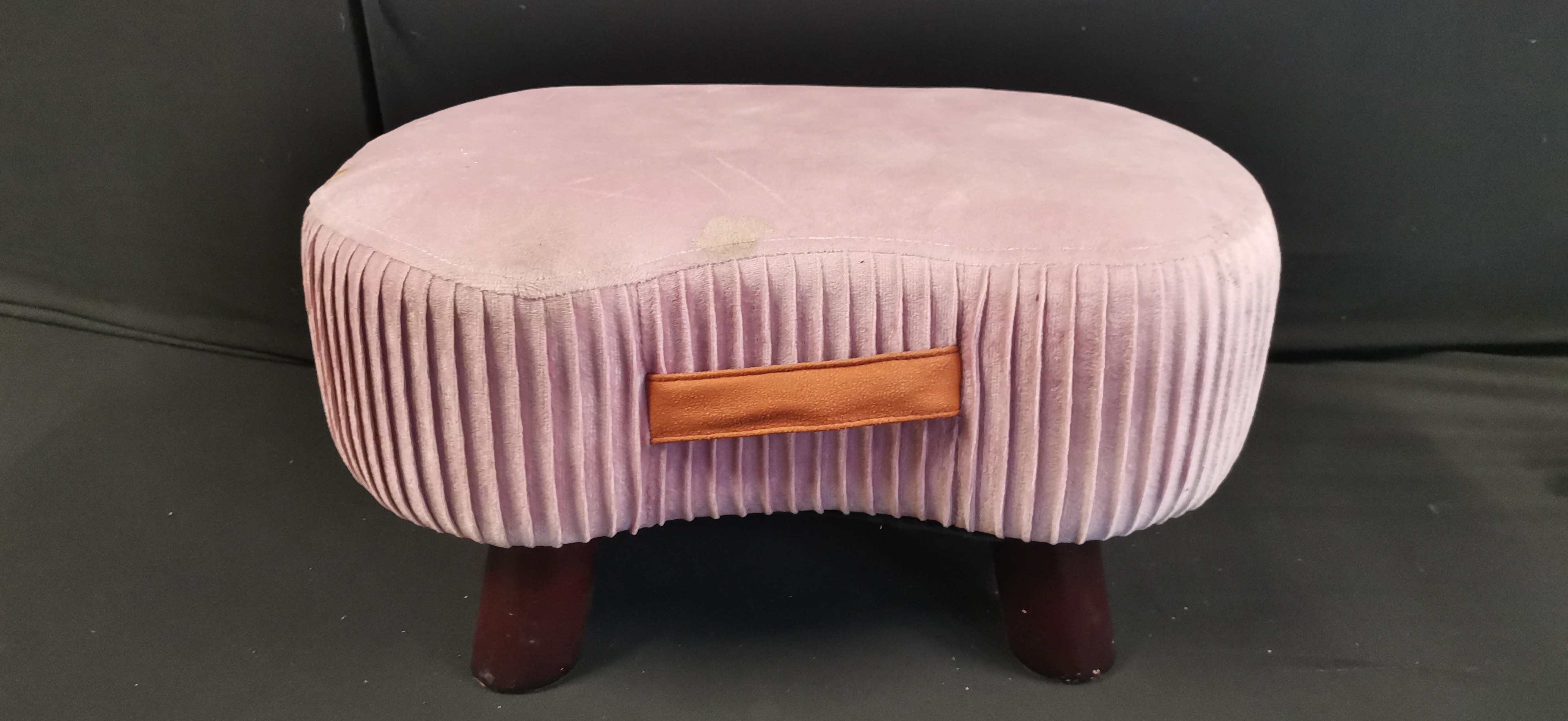 A light pink upholstered kidney-shaped footstool featuring pleated sides, a brown handle, and dark wood legs.