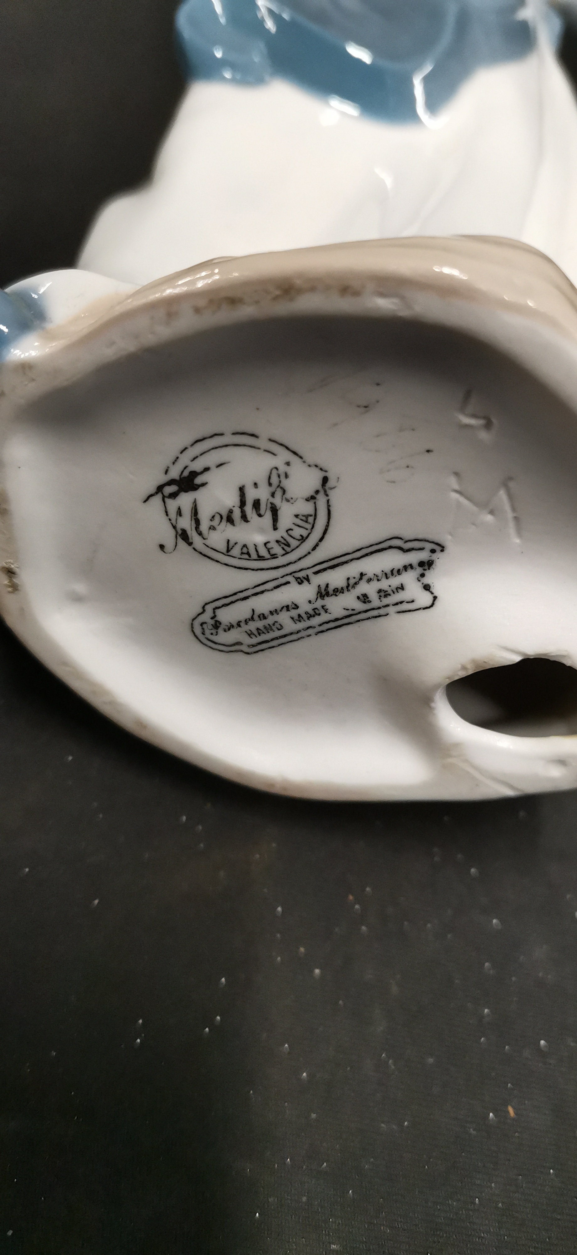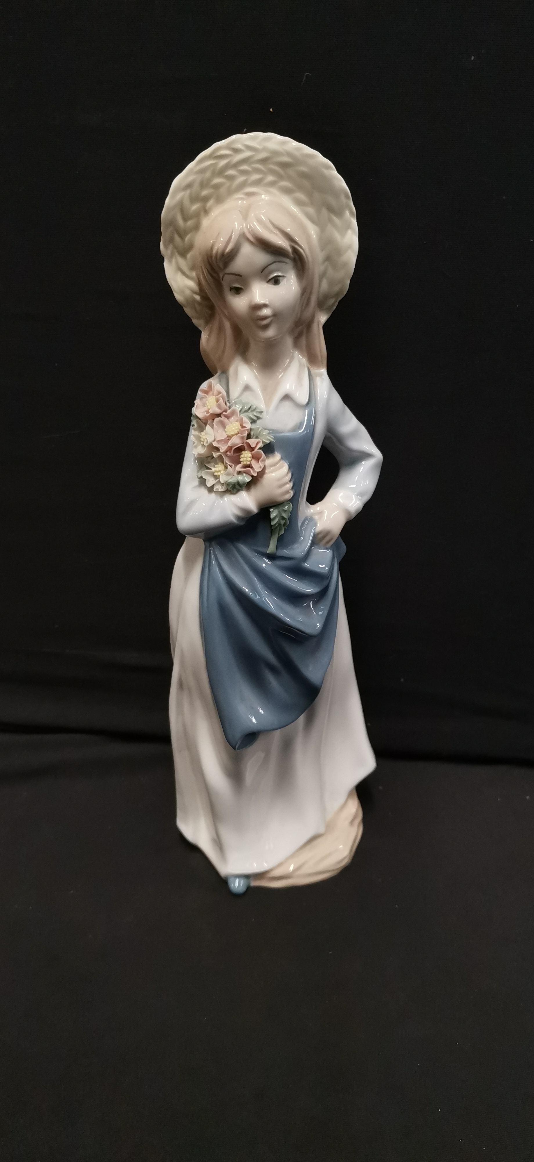 A Spanish porcelain figurine of a young woman wearing a white dress and blue apron, holding a bouquet of pink and white flowers and wearing a wide-brimmed hat.