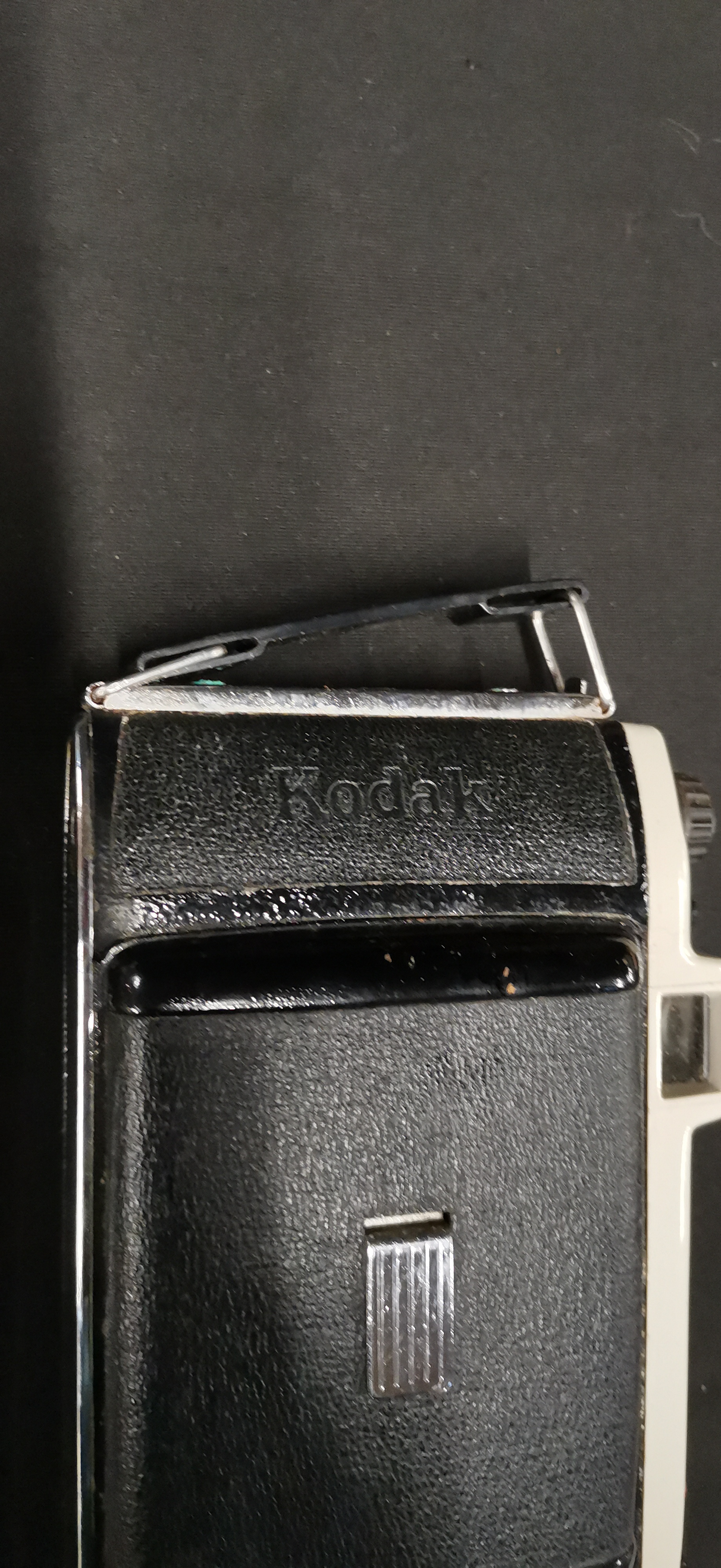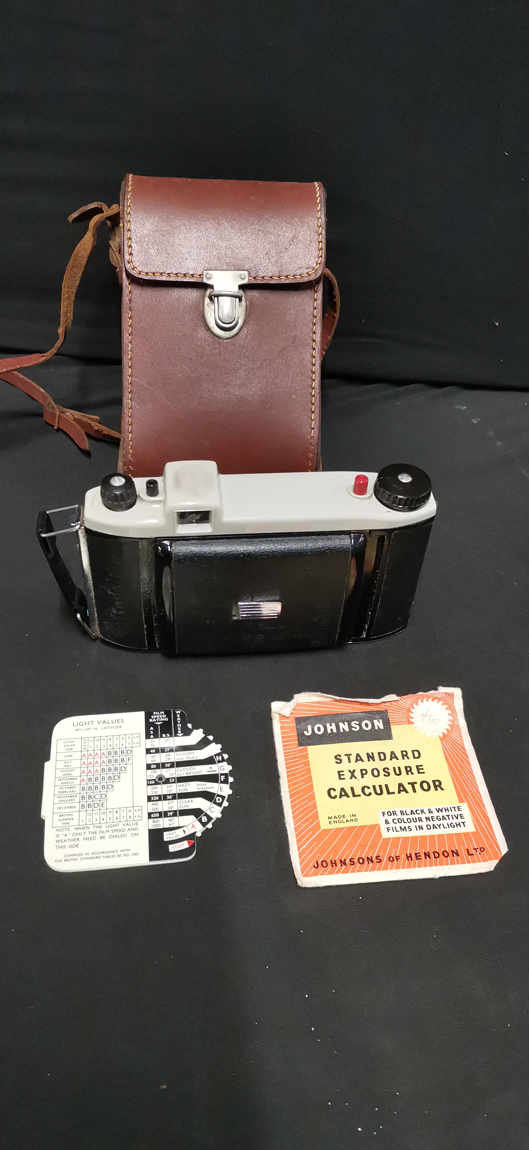 A collection of vintage photography equipment including a black and grey Kodak folding camera, a brown leather carrying case, and two Johnson exposure guides.