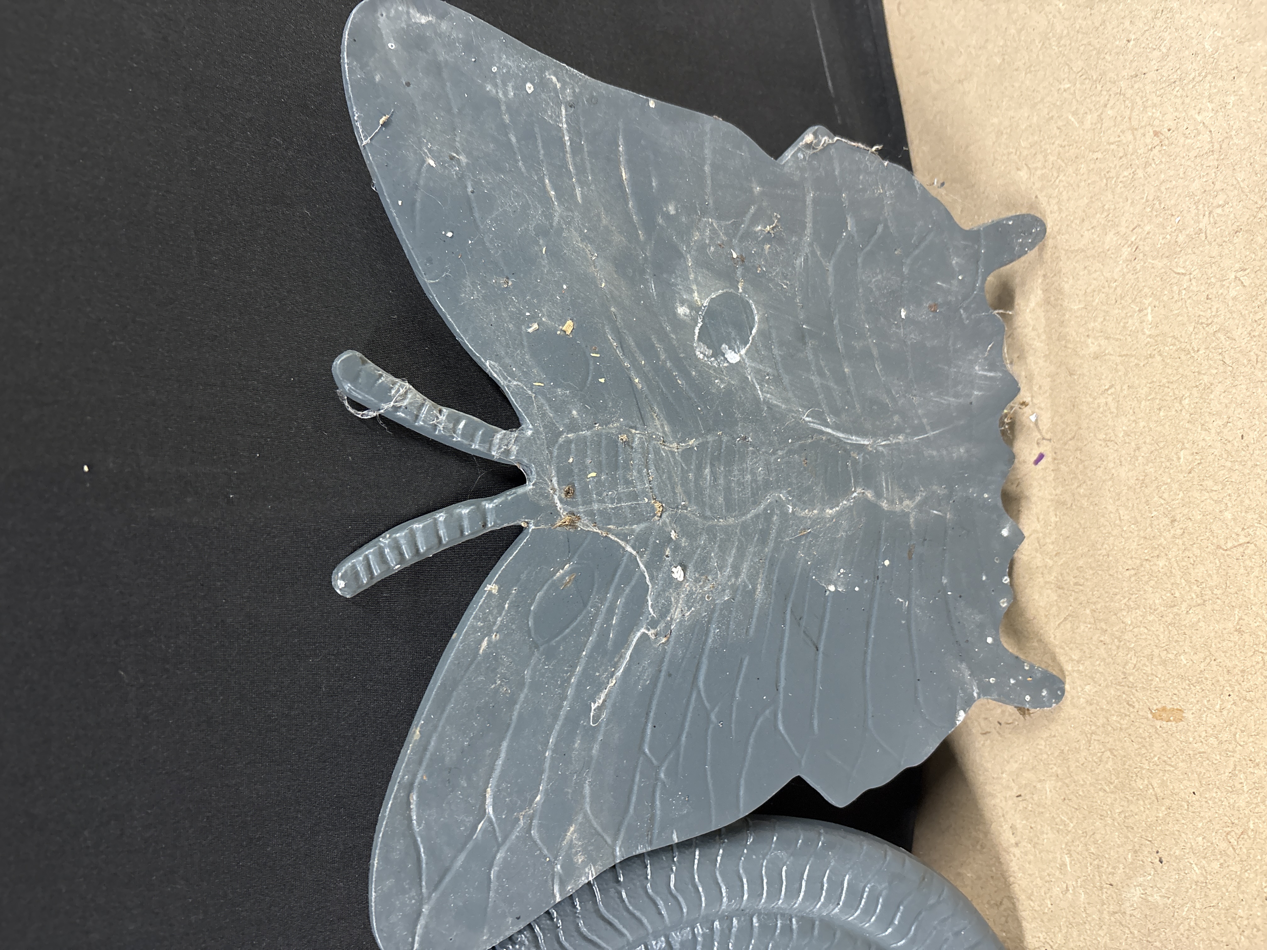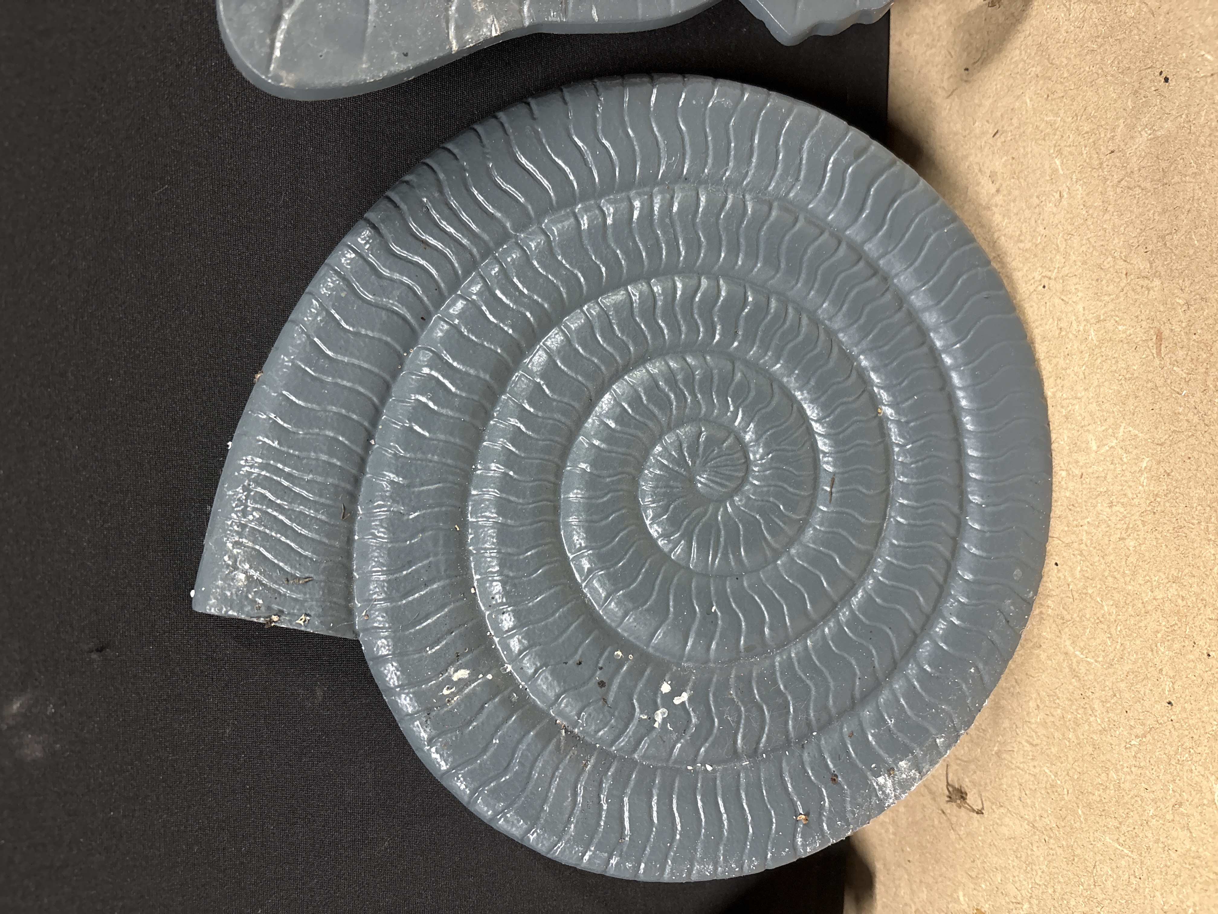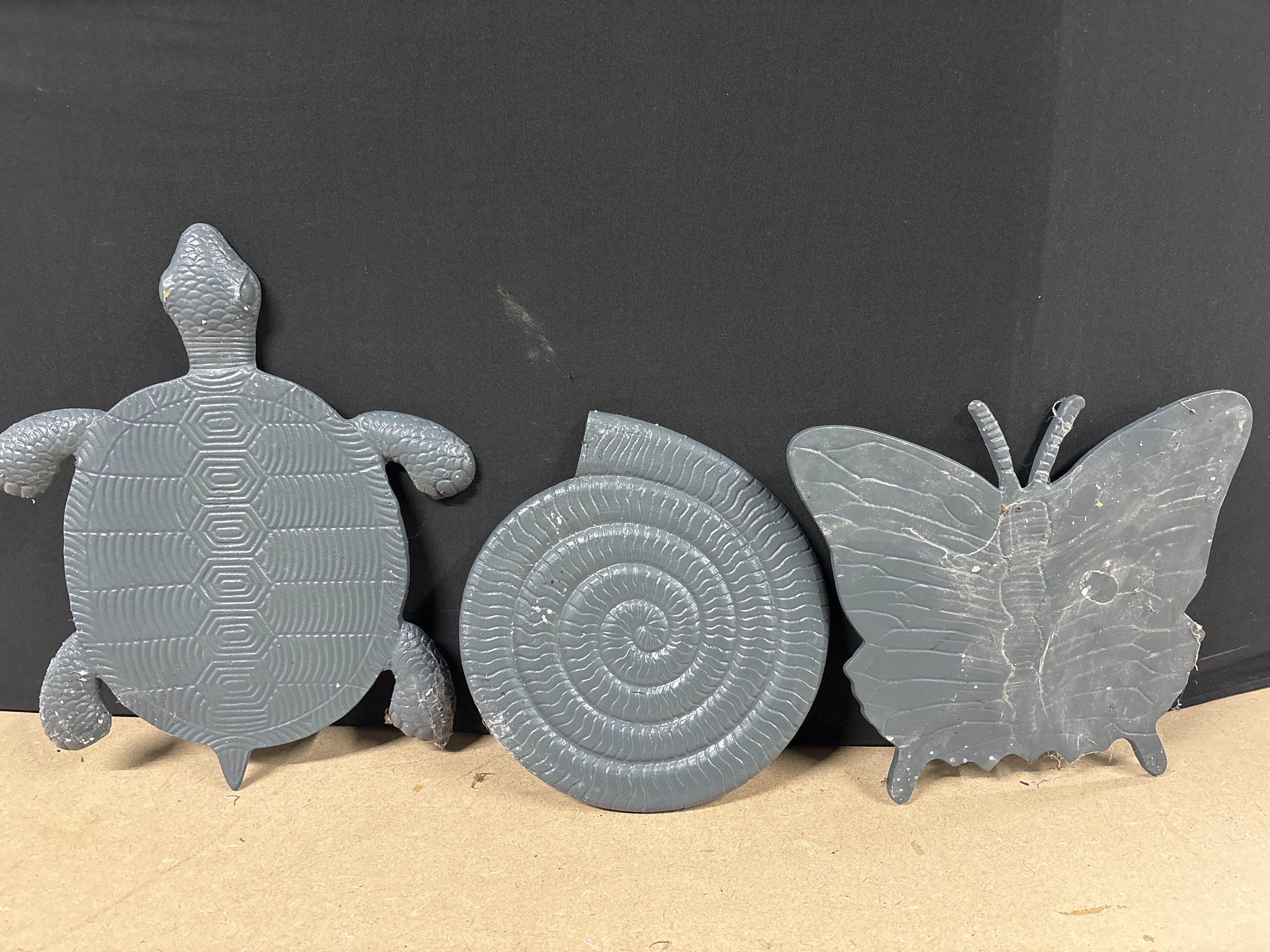 A set of three decorative garden stepping stones attributed to Esschert Design. Each piece is cast from metal and features embossed nature-inspired motifs, including a turtle with a detailed geometric shell, a spiral ammonite shell, and a butterfly with textured wing patterns. These items are designed for use as garden path pavers or decorative wall plaques, finished in a uniform grey colour. Dimensions: Turtle approximately 32cm x 26cm, Ammonite approximately 25cm diameter, Butterfly approximately 32cm x 25cm.