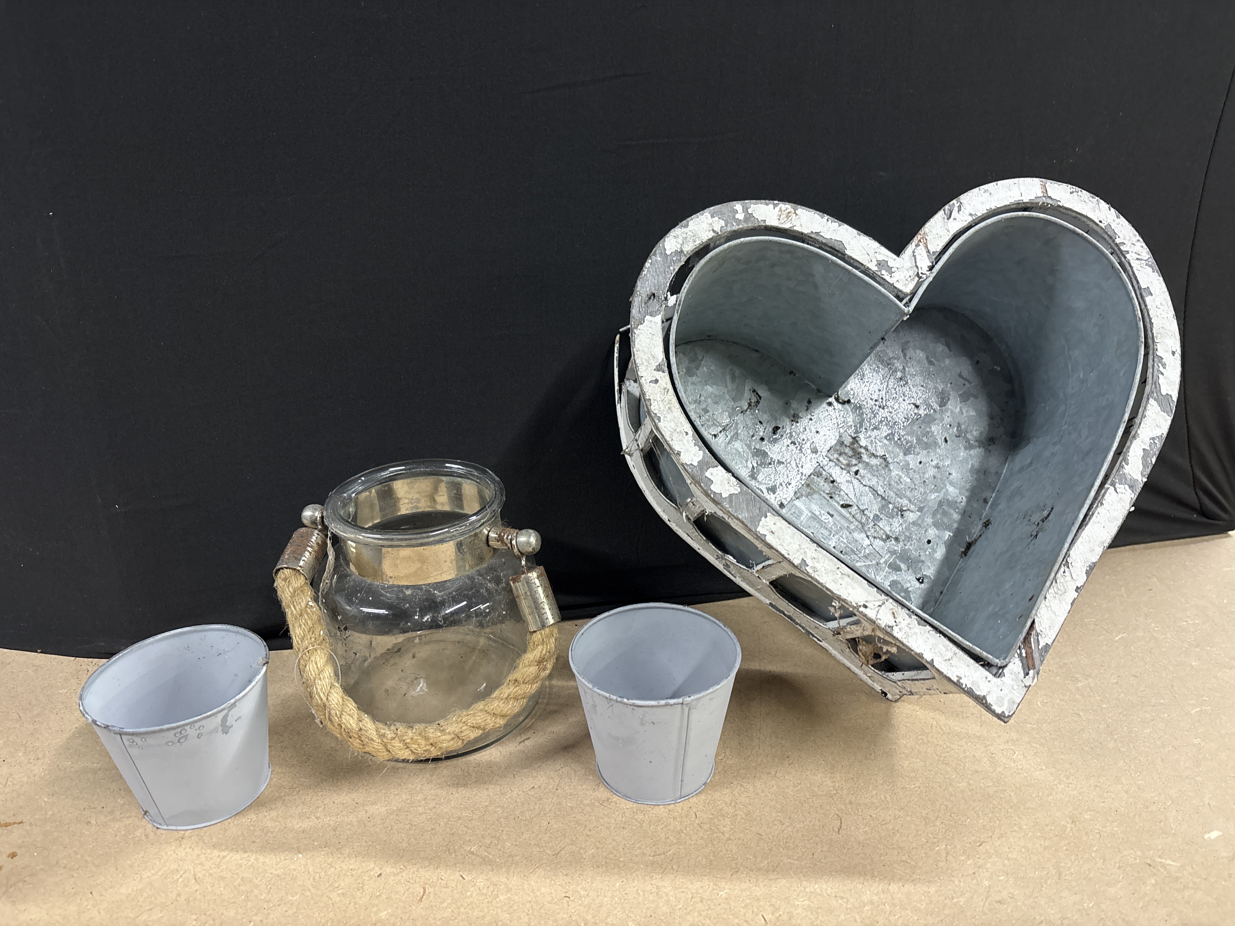 A lot consisting of four decorative garden ornaments manufactured from metal and glass. The collection includes a heart-shaped planter featuring a metal liner and a white-painted frame with a distressed finish. Also included is a glass lantern with a metal rim and a thick natural fibre rope handle attached via metal hardware. The set is completed by two small tapered metal buckets with a pale grey painted finish. These pieces reflect a rustic, shabby chic aesthetic suitable for garden or home decoration. No maker’s marks are present. Dimensions: Heart planter approx. 25cm x 25cm x 12cm; Lantern height approx. 15cm; Buckets height approx. 10cm.