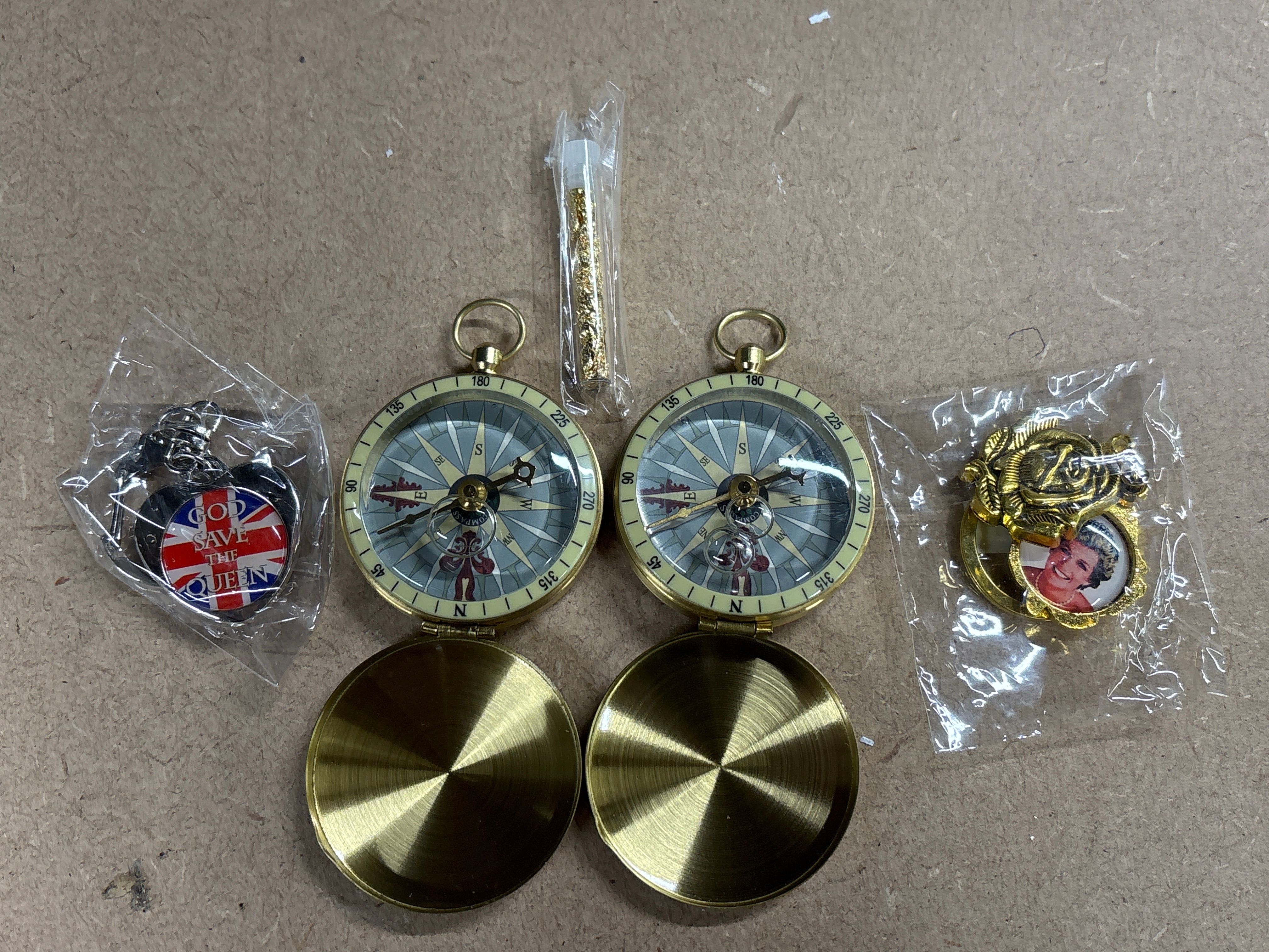 This lot comprises five individual items of commemorative interest, primarily associated with the Windsor Mint. The collection includes two identical brass-toned compasses designed in a traditional pocket-watch aesthetic, featuring hinged protective lids and decorative dials with cardinal points and degree markings. Also included is a gold-toned hinged pendant in the form of a rose, which opens to reveal a photographic portrait of Diana, Princess of Wales. The lot is further enhanced by a heart-shaped Union Jack keychain bearing the patriotic inscription GOD SAVE THE QUEEN and a small, sealed plastic vial containing decorative gold-coloured flakes. These items represent typical late 20th-century souvenir production, blending functional nautical-style instruments with royal commemorative themes. Compasses: 48mm diameter. Pendant: 30mm x 25mm. Keychain: 40mm width. Vial: 45mm length.