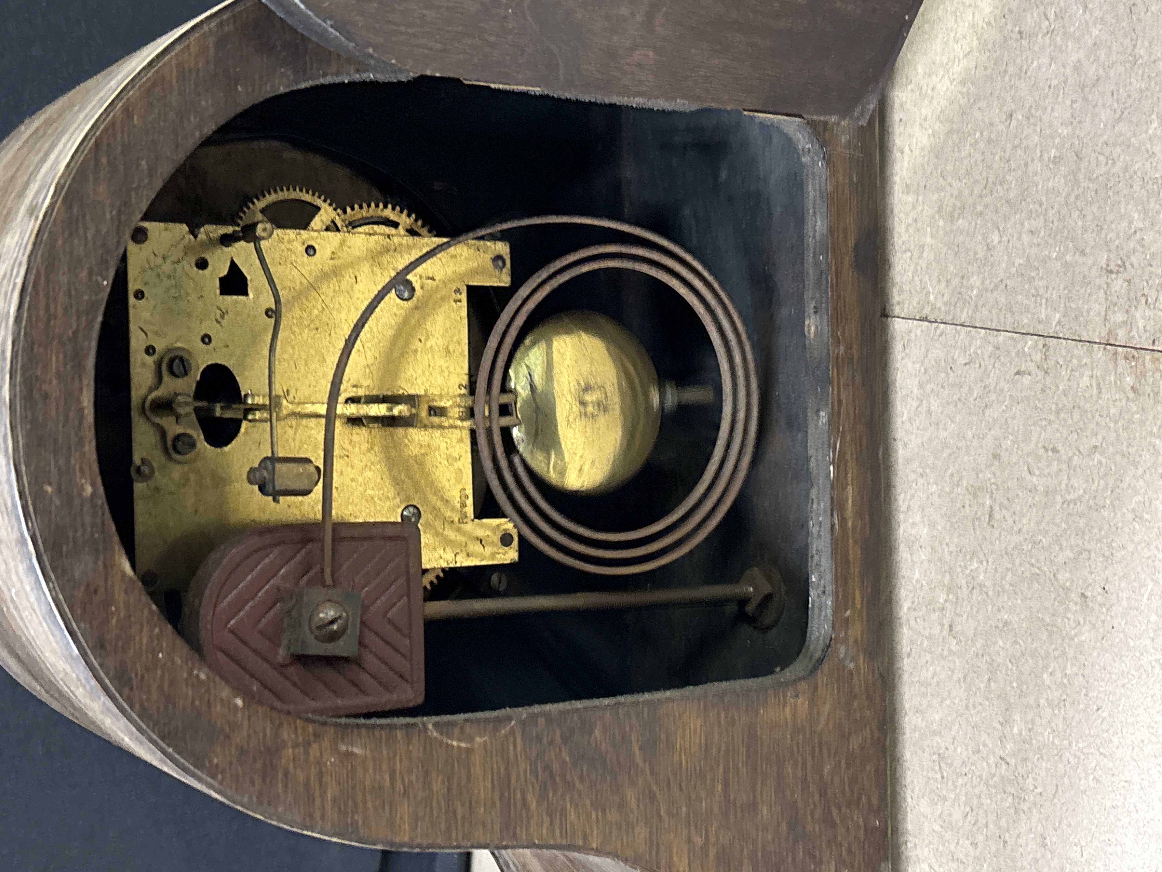 This early 20th-century mechanical mantel clock features a classic Napoleon hat silhouette, constructed from wood with a dark-stained finish and a decorative carved border to the base. The silvered metal dial is housed behind a hinged brass-toned bezel, featuring stylised black Arabic numerals and spade-shaped hands. The dial is marked MADE IN ENGLAND at the six o’clock position. To the interior, the brass mechanical movement is equipped with a coiled gong chime, with the backplate stamped Foreign alongside numeric markings. Dimensions: Approximately 23cm x 42cm x 13cm.