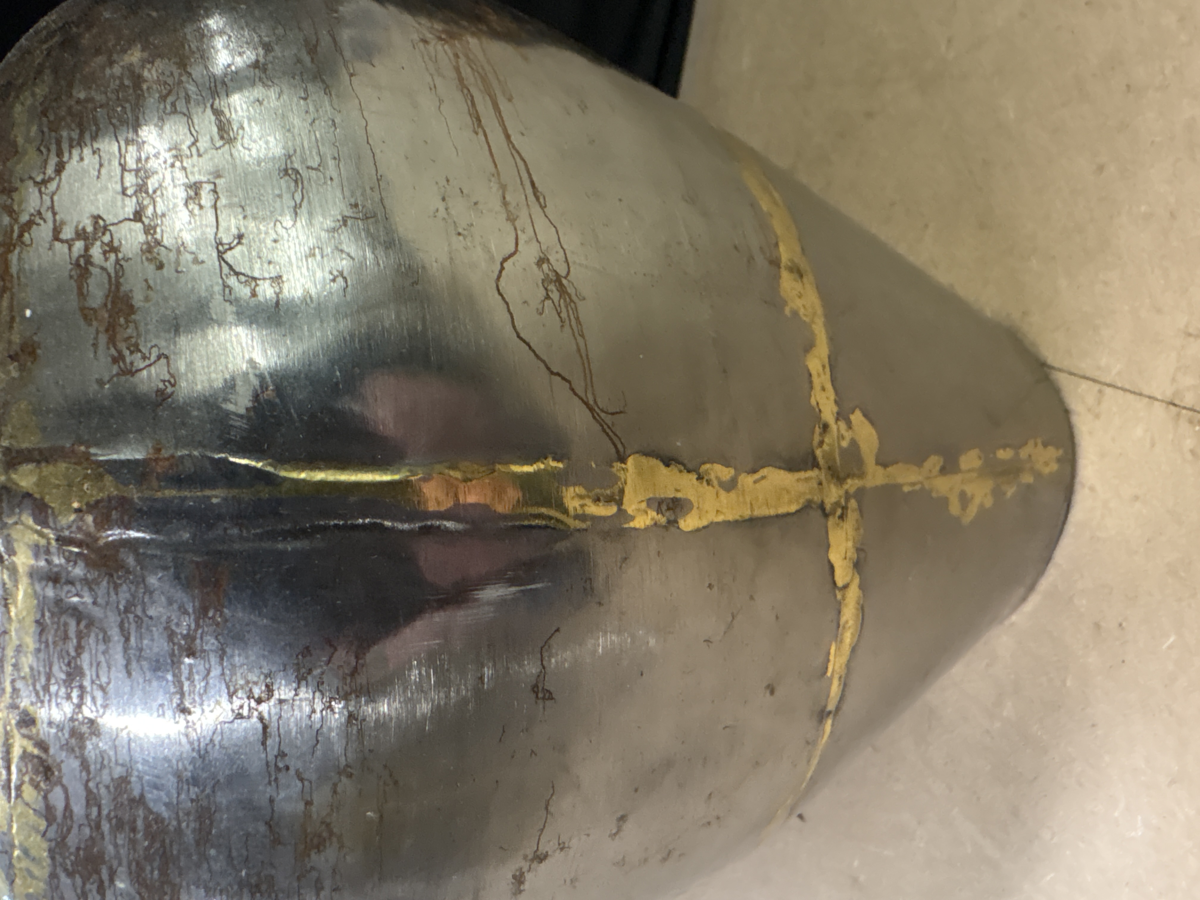 An industrial-style table lamp crafted from a repurposed metal vessel, appearing to be a vintage industrial tank or canister. The tapered body features a brushed finish with decorative gold-coloured filler applied along the seams in a cross-axial pattern. The fixture is fitted with a brass B22 bayonet bulb socket and is wired with a brown plastic-coated power cord terminating in a white three-pin UK plug. The piece reflects a mid-20th-century aesthetic with an emphasis on raw material and found-object design. No maker’s marks or labels are visible. Dimensions: Not recorded.