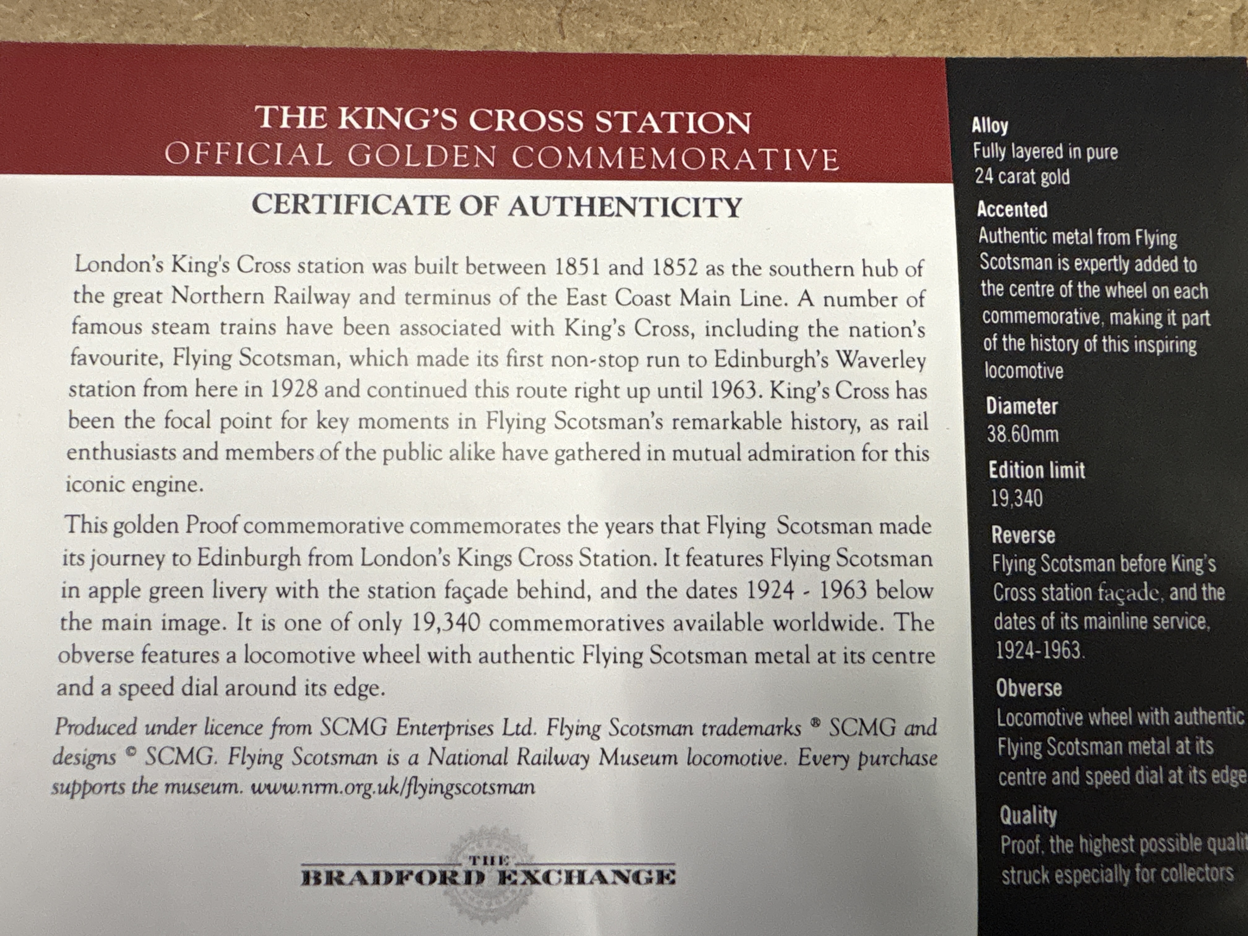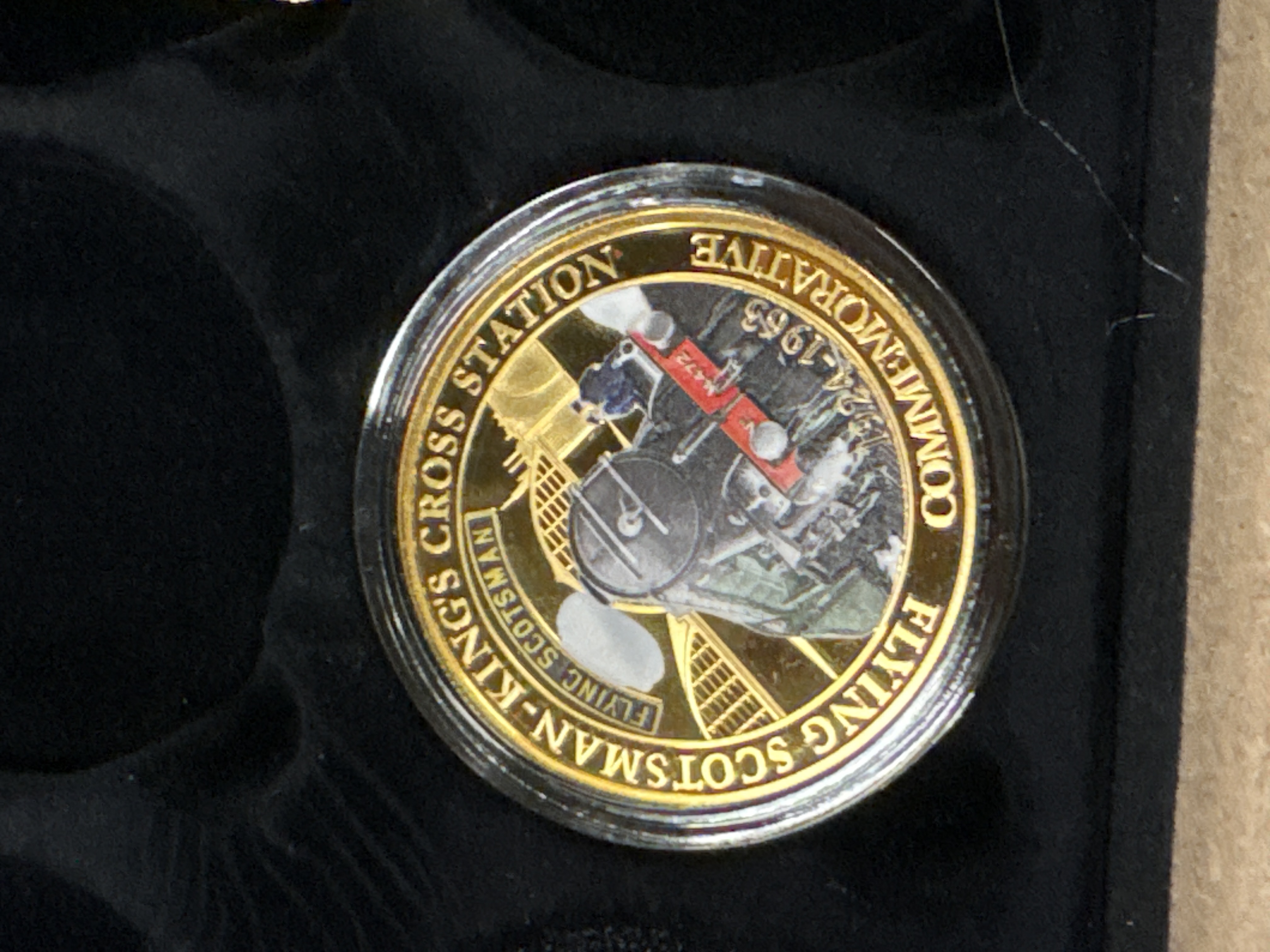Produced by The Bradford Exchange as part of the Flying Scotsman Icon of Steam Official Commemorative Collection. This Flying Scotsman coin commemorative was issued under licence from SCMG Enterprises Ltd. The obverse features a locomotive wheel design with a central insert of authentic metal from the Flying Scotsman locomotive. The reverse features a colourised locomotive and station facade design. Historical note: Limited edition of 19,340 pieces.