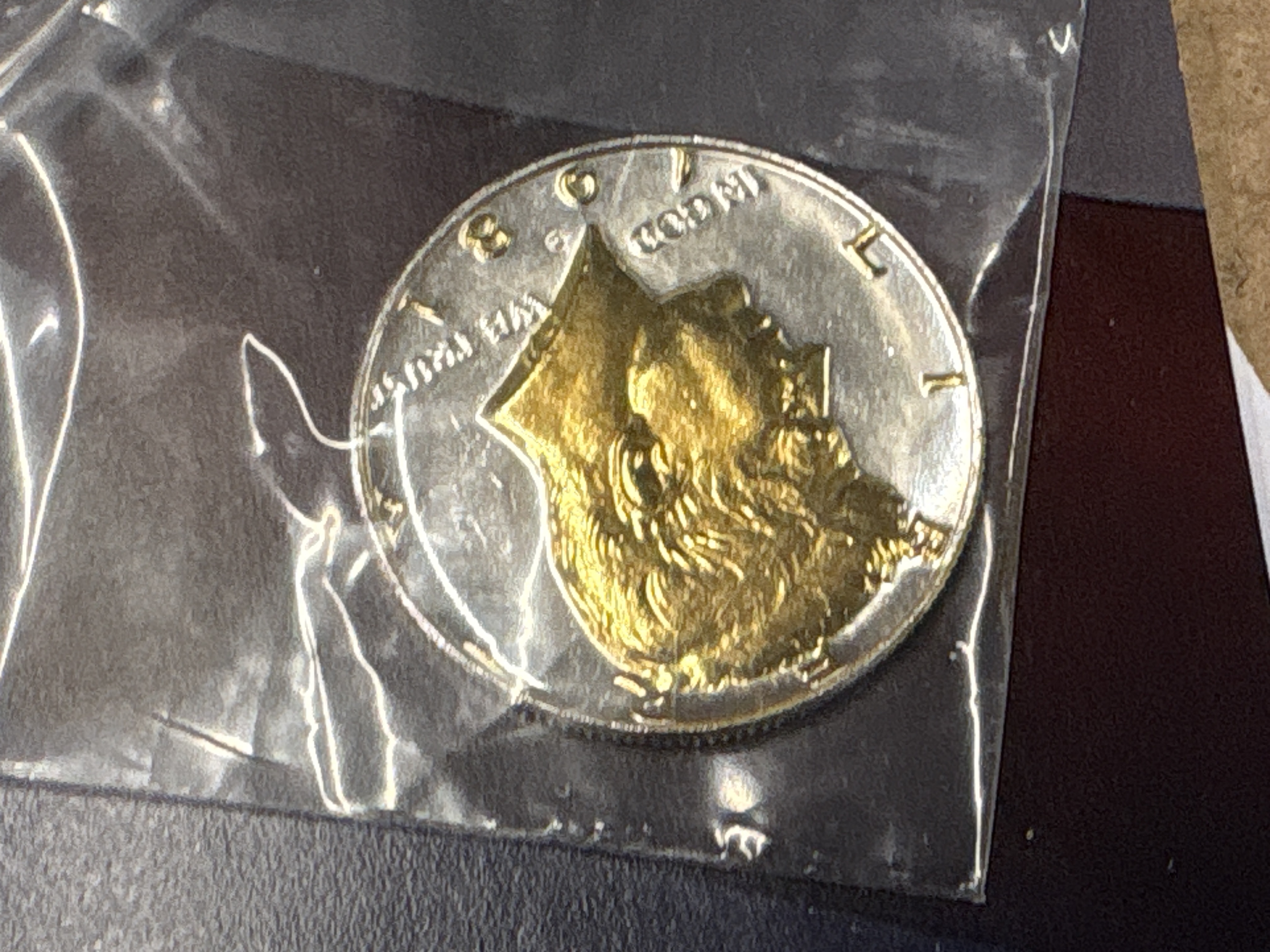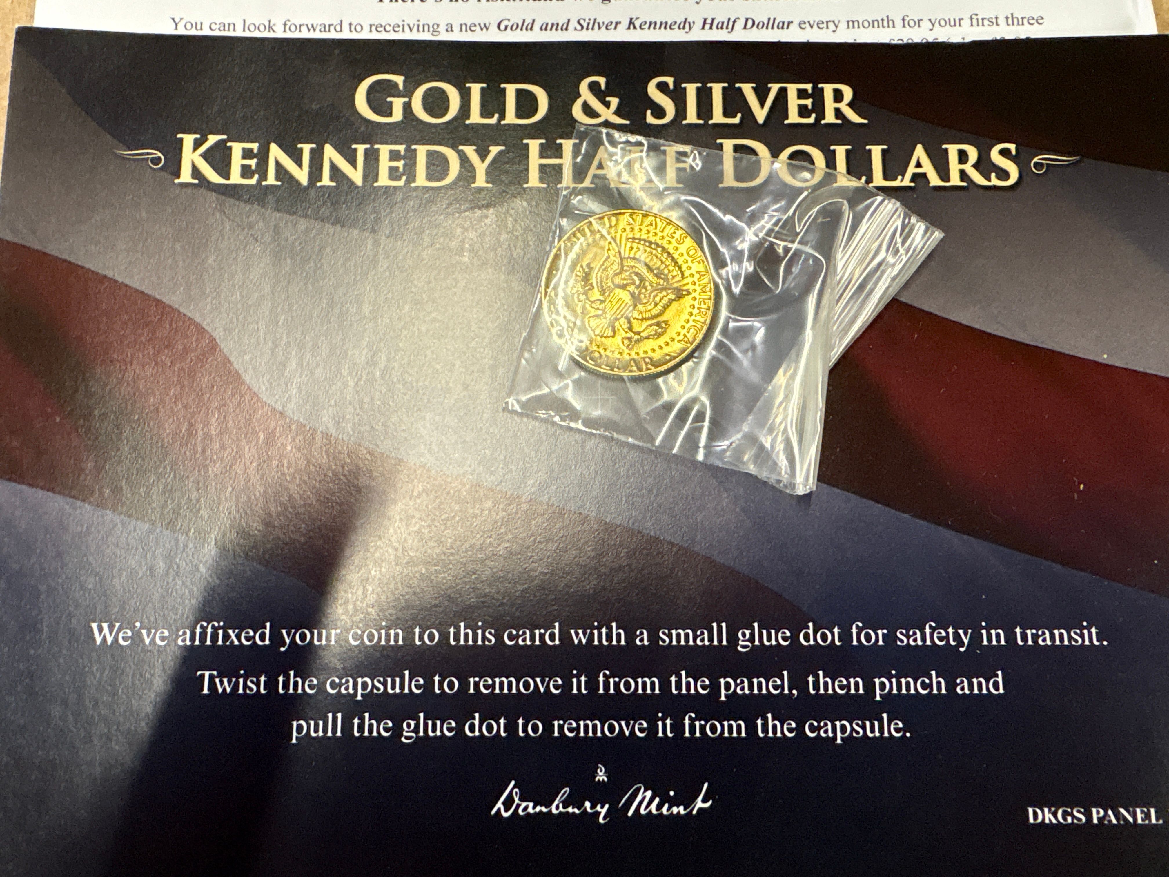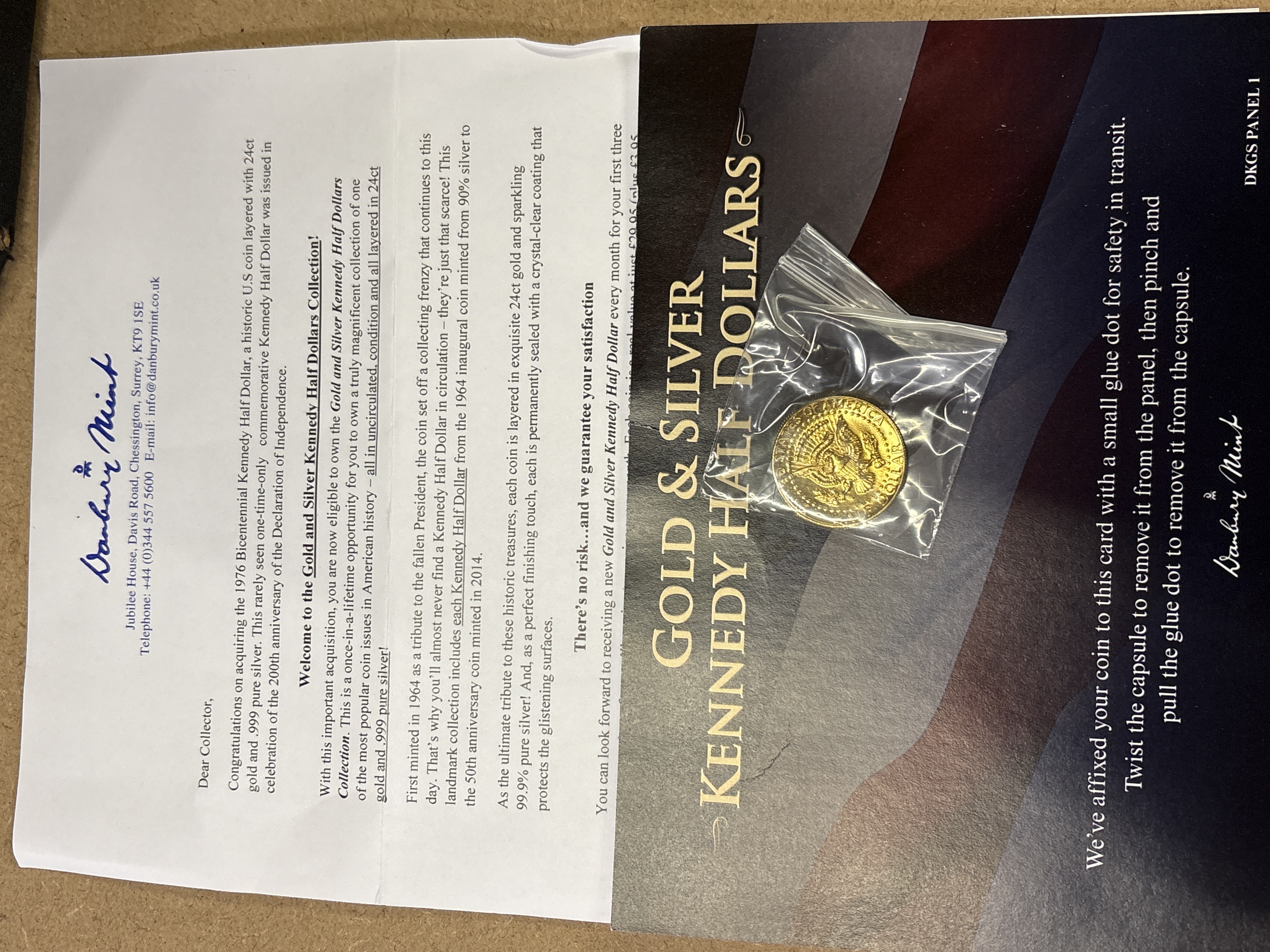 Private numismatic issue produced for the Danbury Mint. This Kennedy half dolar is struck in 999 fine silver and features selective 24kt Gold layering on the central motifs. Obverse features the Kennedy portrait obverse; reverse features the Presidential Seal reverse. Dual dated 1776-1976. Designer: Gilroy Roberts / Frank Gasparro. This issue was produced by the Danbury Mint to commemorate the bicentennial of the American Declaration of Independence.