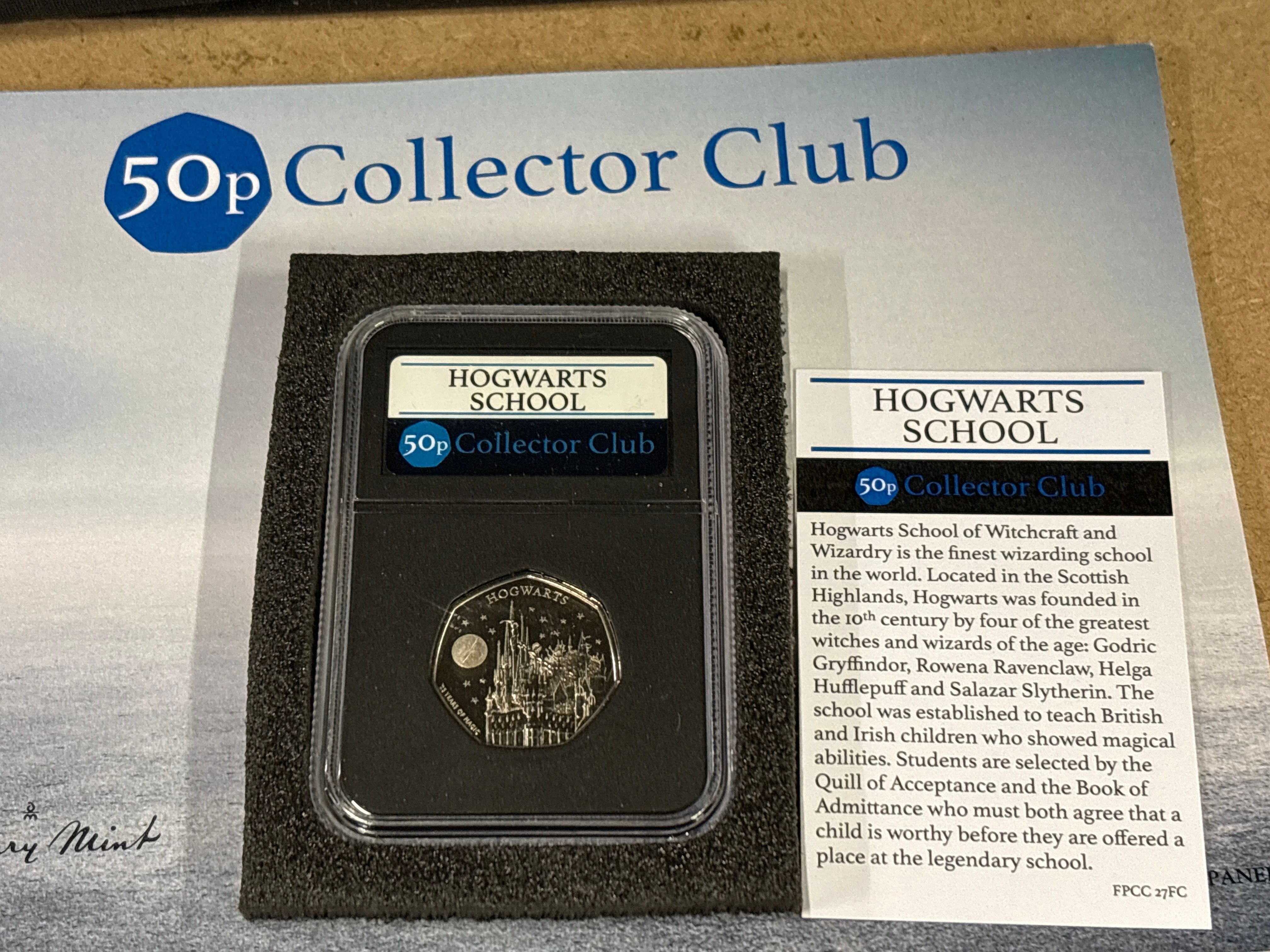 Catalog number Spink 4725. Reverse designed by Ffion Gwillim; obverse by Martin Jennings. Struck at the Royal Mint, Llantrisant. Hogwarts School / King Charles III design type. Features a latent security feature changing between a lightning bolt and the number 25. This uncirculated specimen was distributed by Danbury Mint as part of the 50p Collector Club series. This commemorative issue marks the 25th anniversary of the publication of Harry Potter and the Philosopher’s Stone.