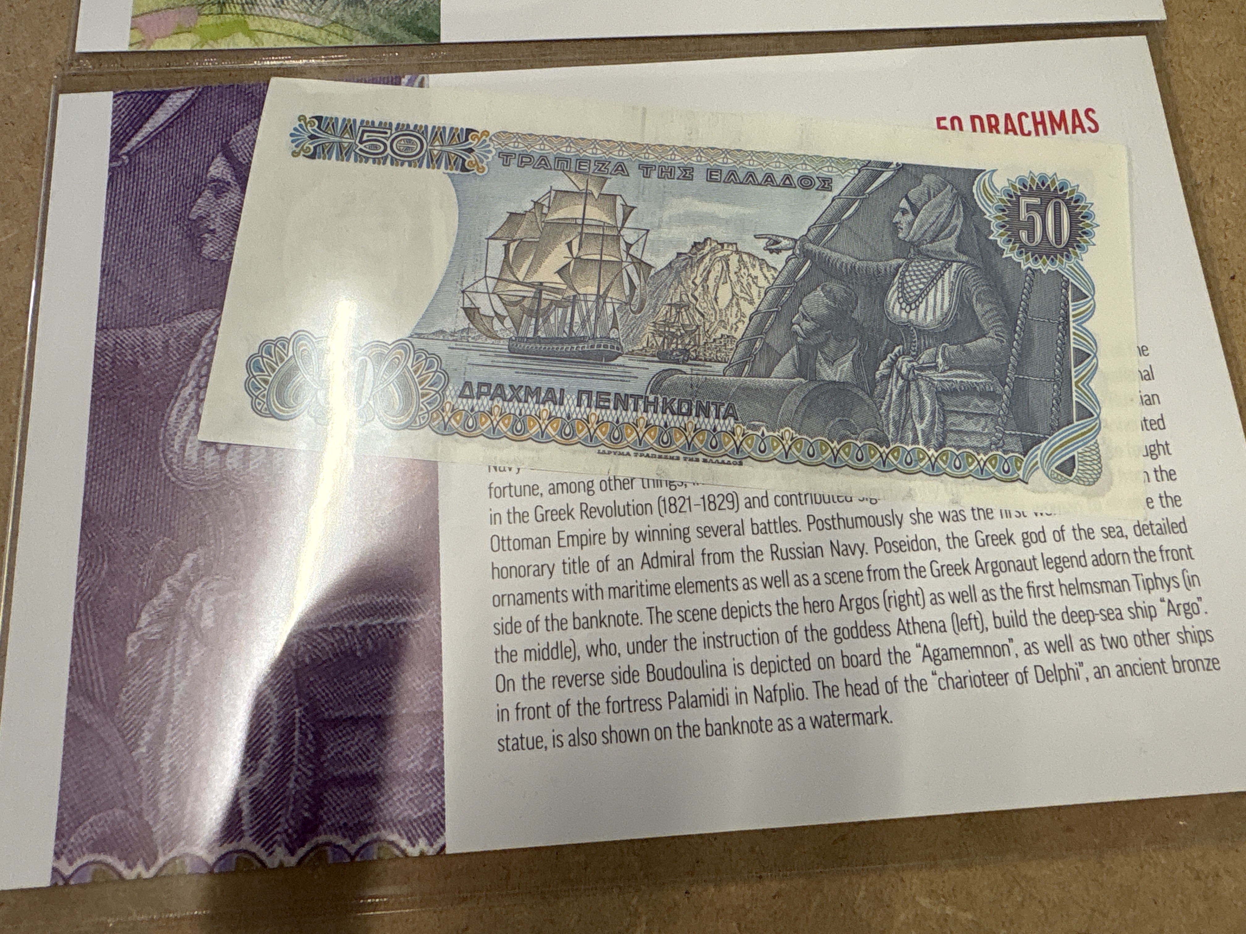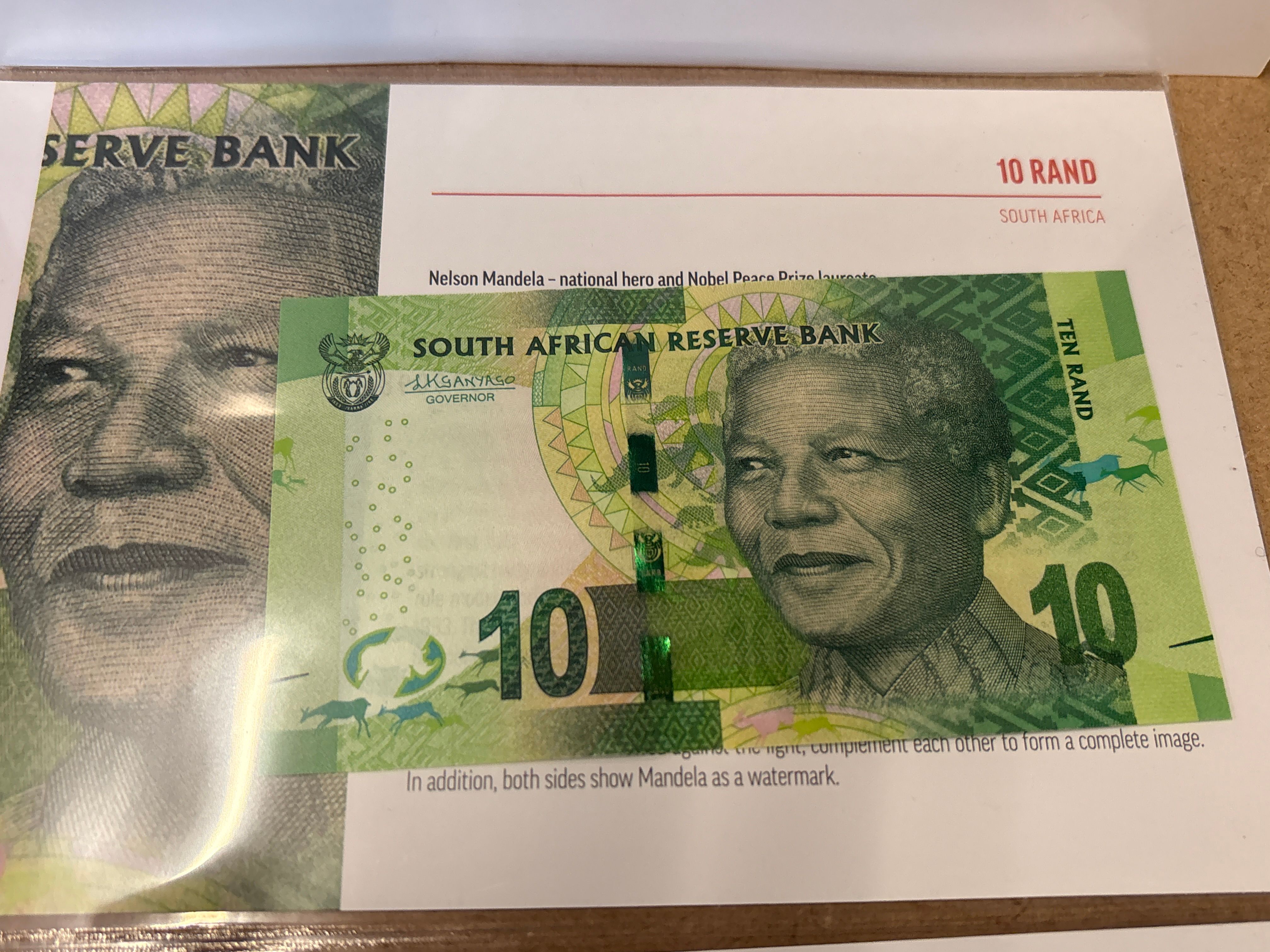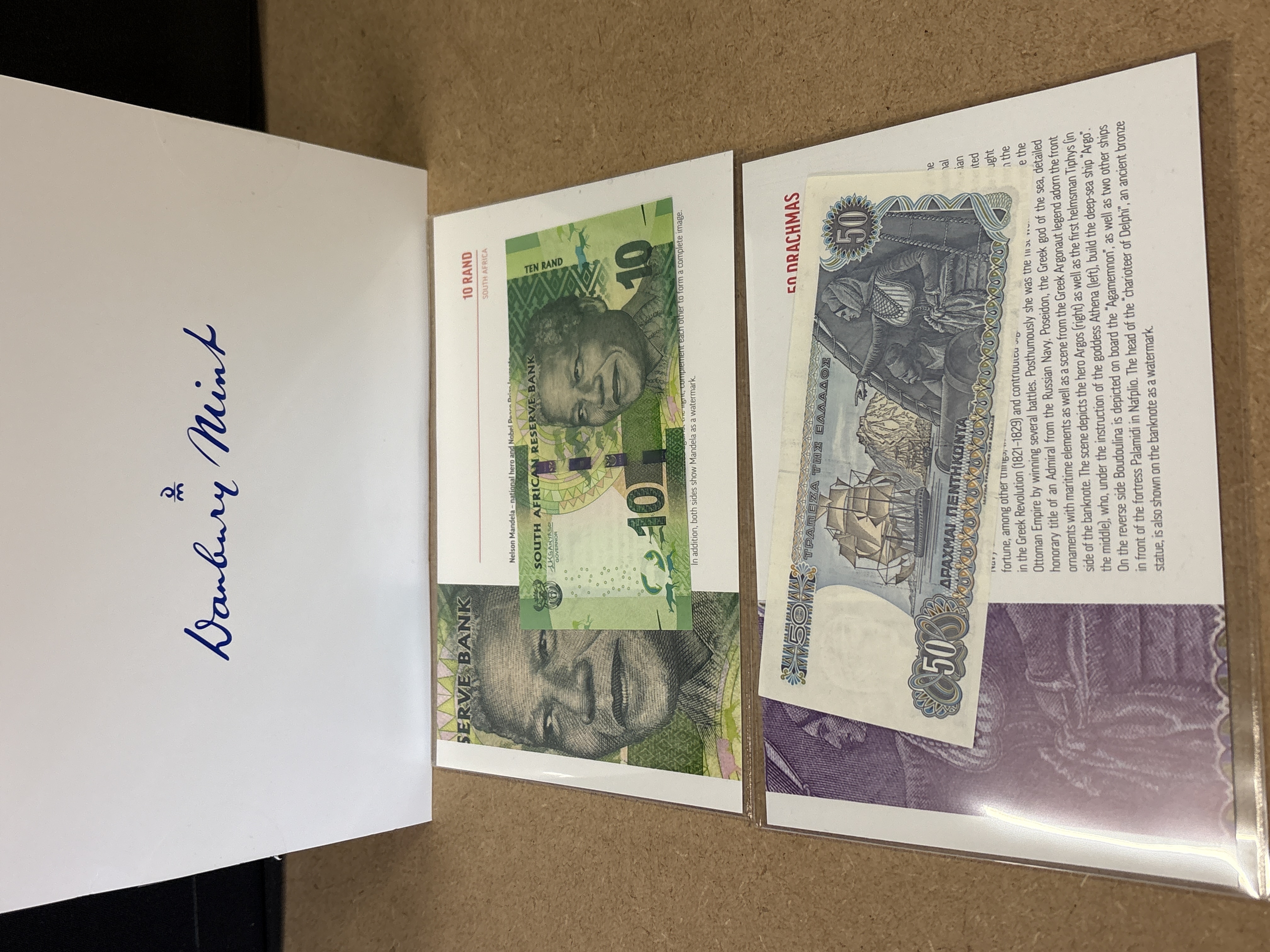 This lot comprises two banknotes from the Danbury Mint Millionaire’s Currency Collection. The first item is a South African 10 Rand, Pick# 148, bearing the signature of Governor Lesetja Kganyago. Design type: Nelson Mandela / Rhinoceros. Key identifiers include a holographic security thread and a Nelson Mandela watermark. The second item is a Greek 50 Drachmai, Pick# 199, dated 8 December 1978. Design type: Poseidon / Laskarina Bouboulina. Key identifiers include the head of the Charioteer of Delphi watermark. These notes were issued as part of a curated numismatic series by the Danbury Mint.