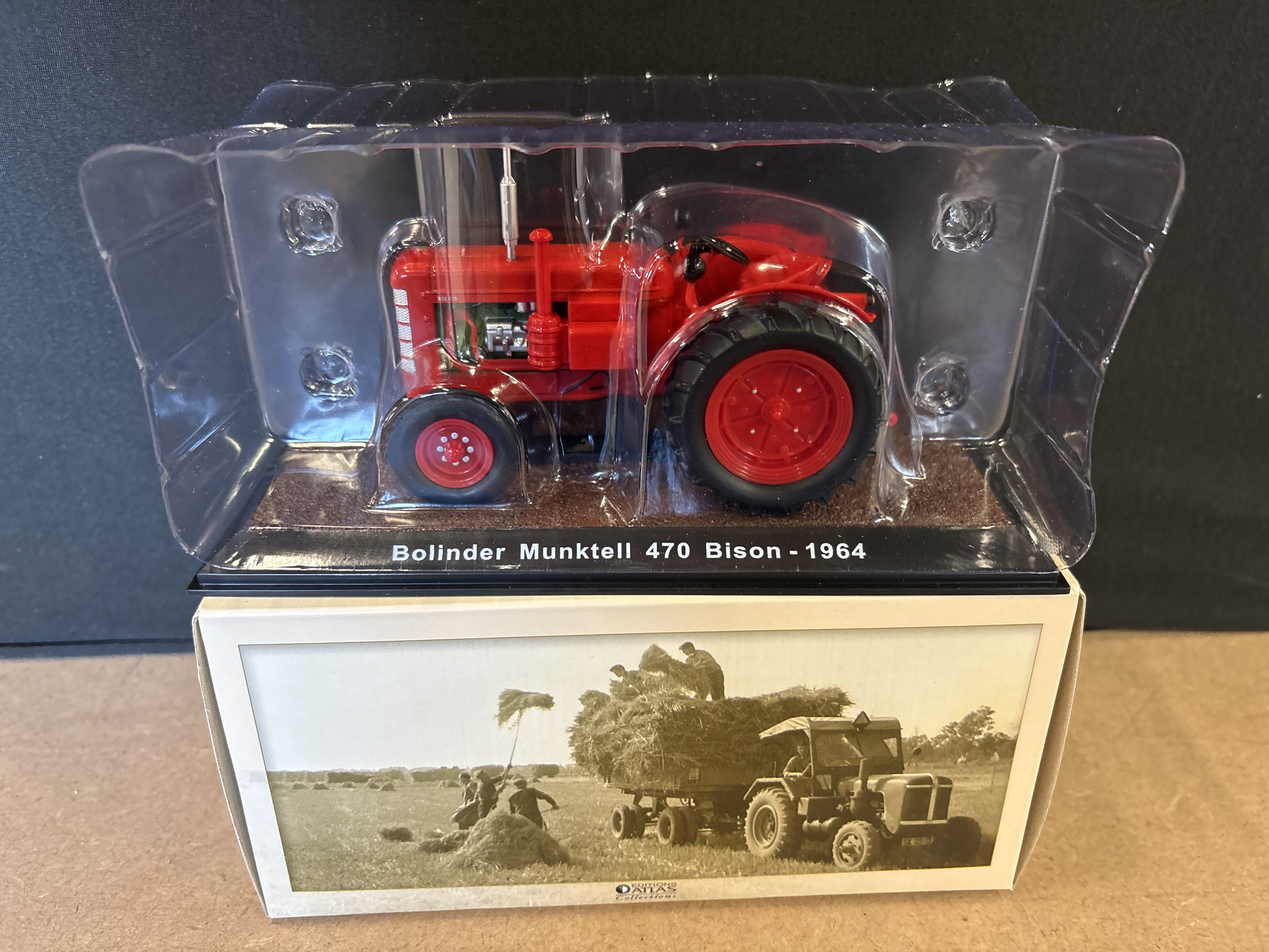 A red 1:32 scale die-cast model of a 1964 Bolinder Munktell 470 Bison tractor by Atlas Editions, housed in its original display case and packaging.
