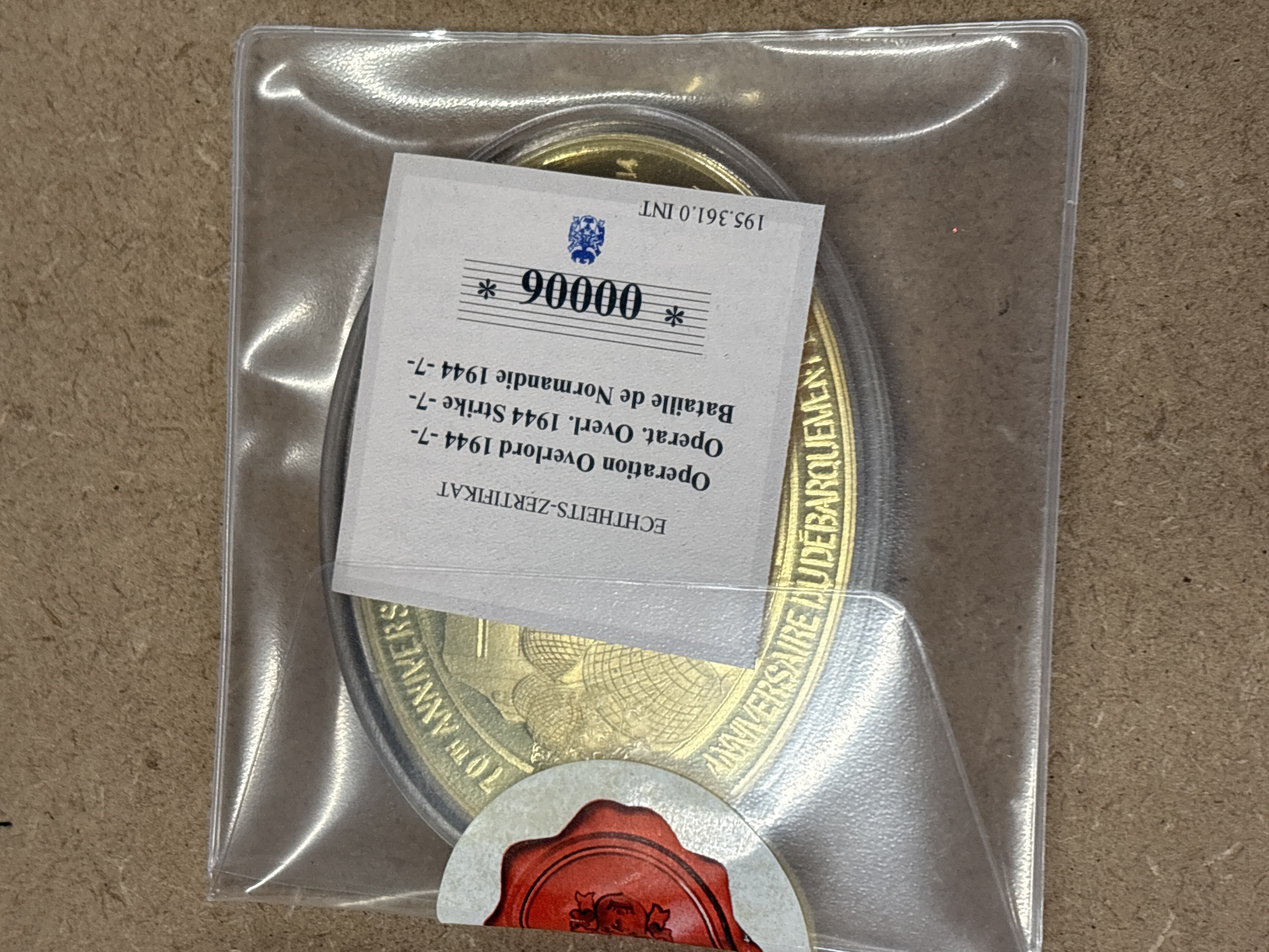 Commemorative medal issued for the 70th anniversary of the WW2 Operation Overlord landings. The piece features a photographic obverse and a bilingual anniversary reverse. Accompanied by a German-language certificate of authenticity bearing serial number 00006 and reference number 195.361.0 INT. This commemorative coin was produced to mark the 2014 milestone of the 1944 Allied invasion of Normandy.