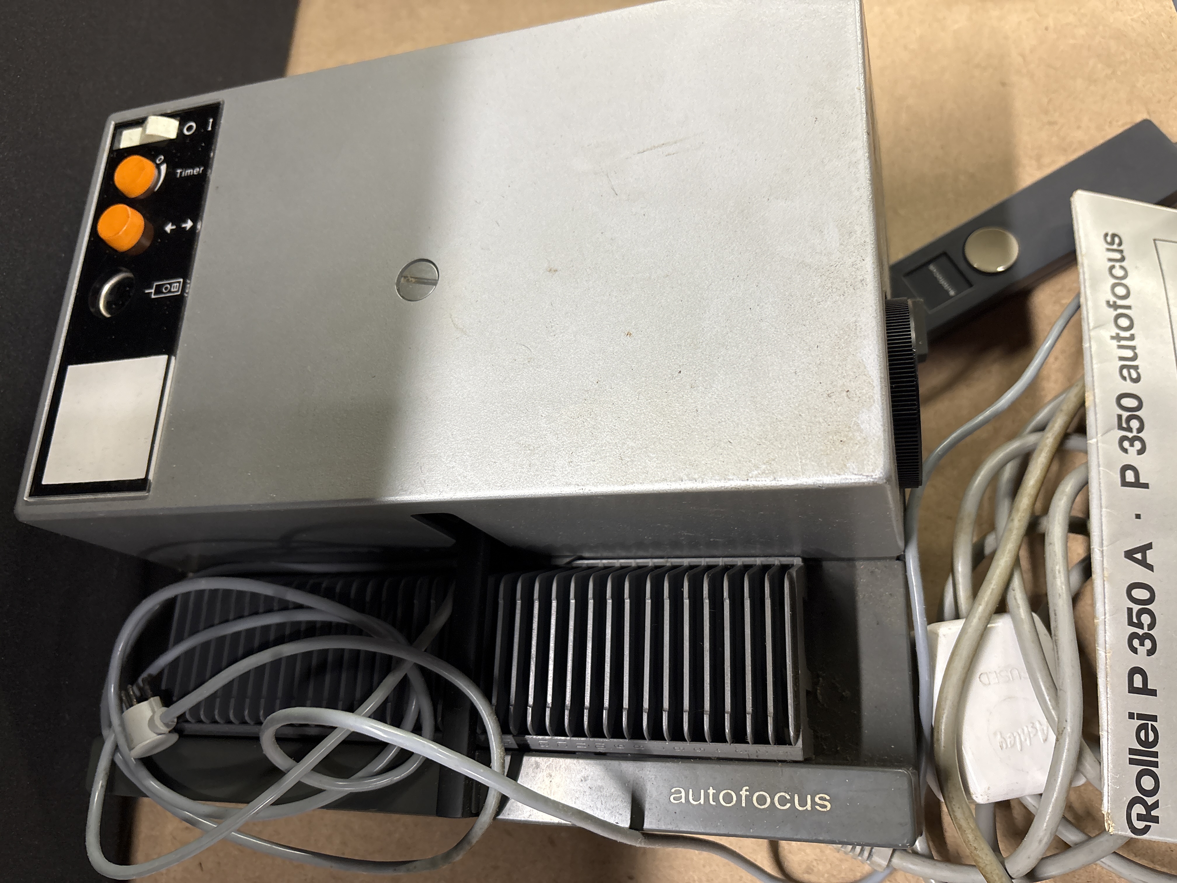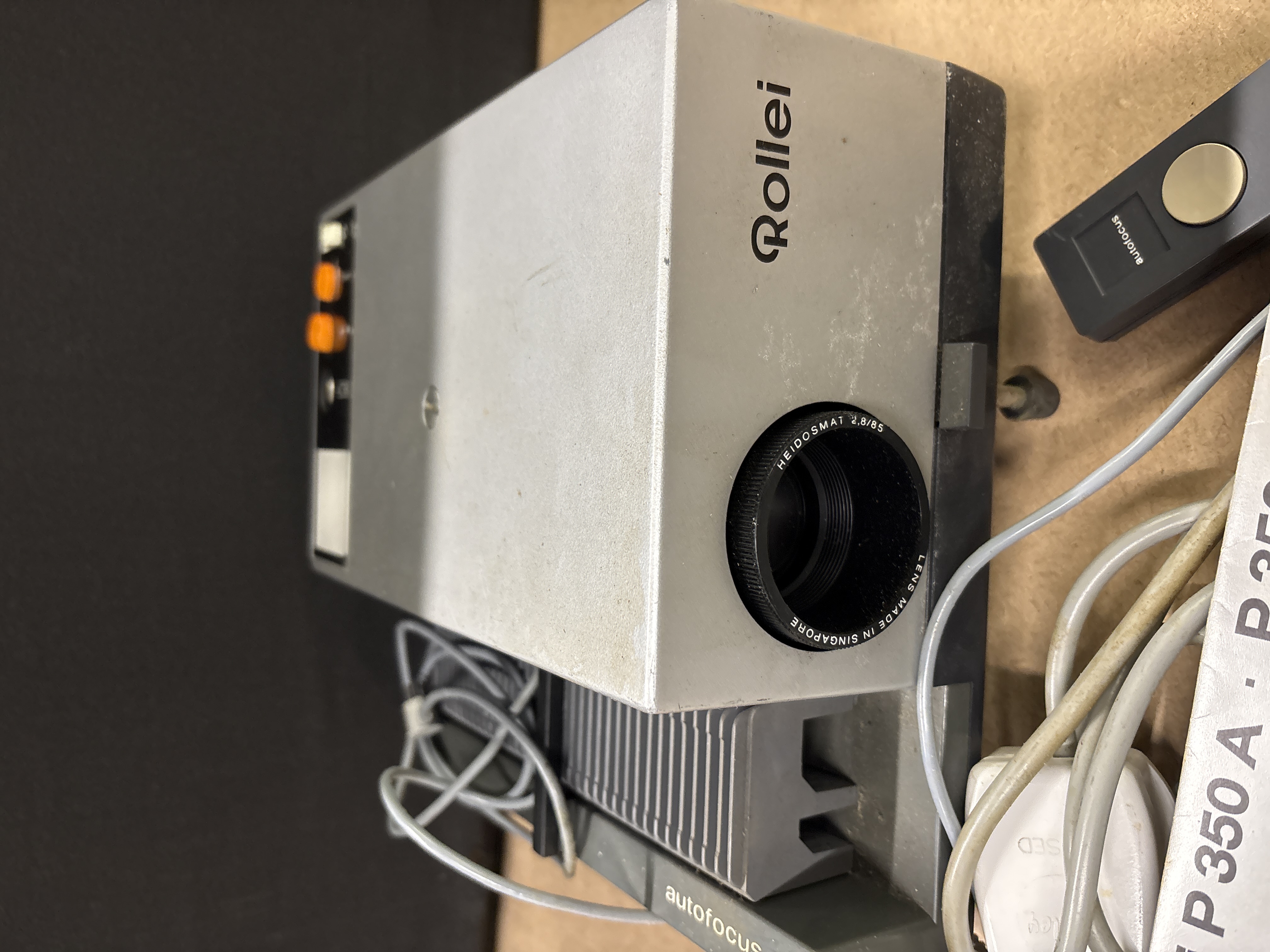 This lot consists of one Rollei P 350 A Autofocus 35mm slide projector. The unit features a metal construction and is fitted with a Rollei Heidosmat 85mm f/2.8 lens, produced in Singapore. The lot includes the original wired remote control, a straight slide magazine, the original instruction manual titled In der Praxis, and a power cable. This model was a staple of professional and home slide presentations in the 1970s and 1980s. Serial number not visible.