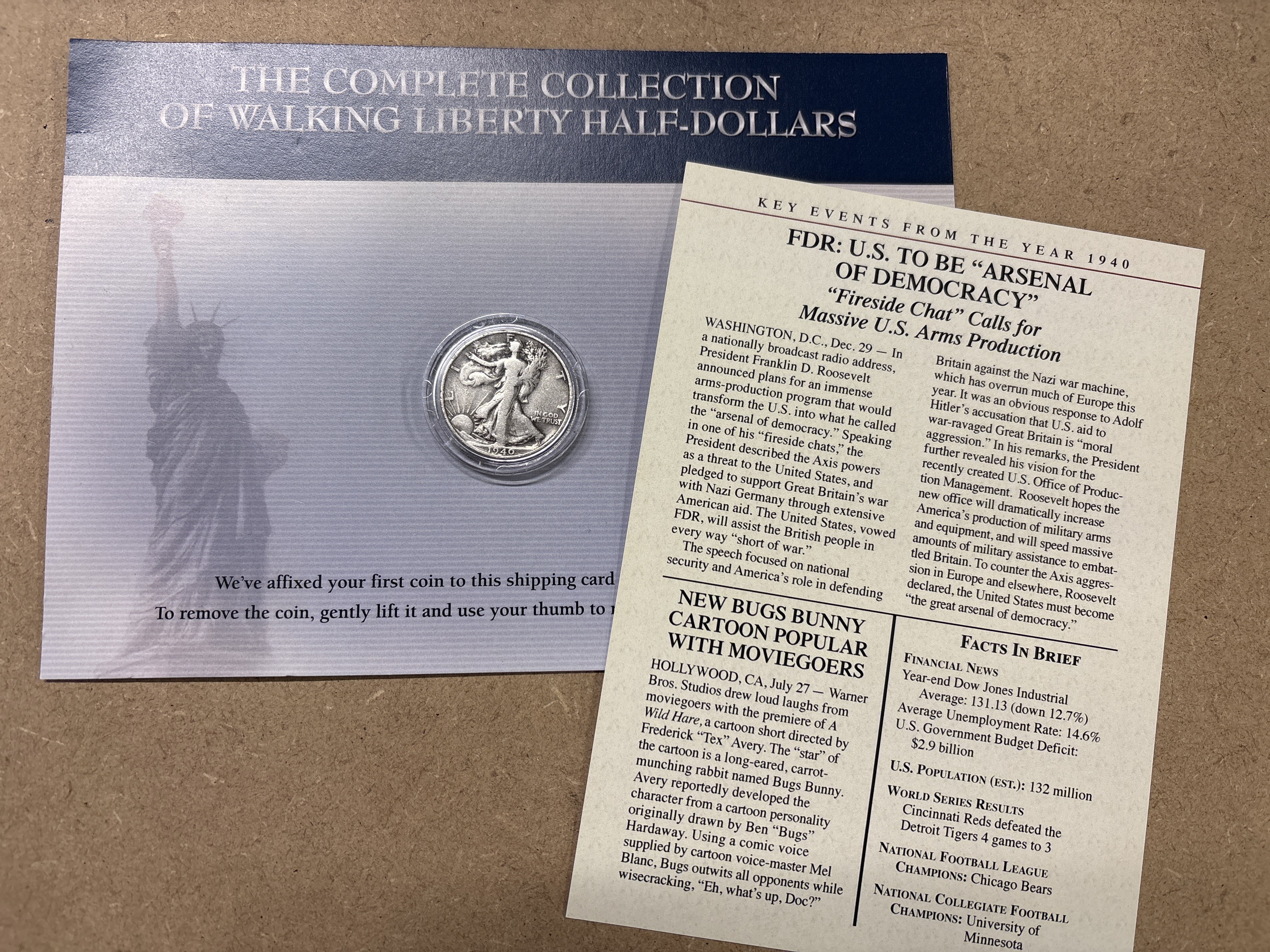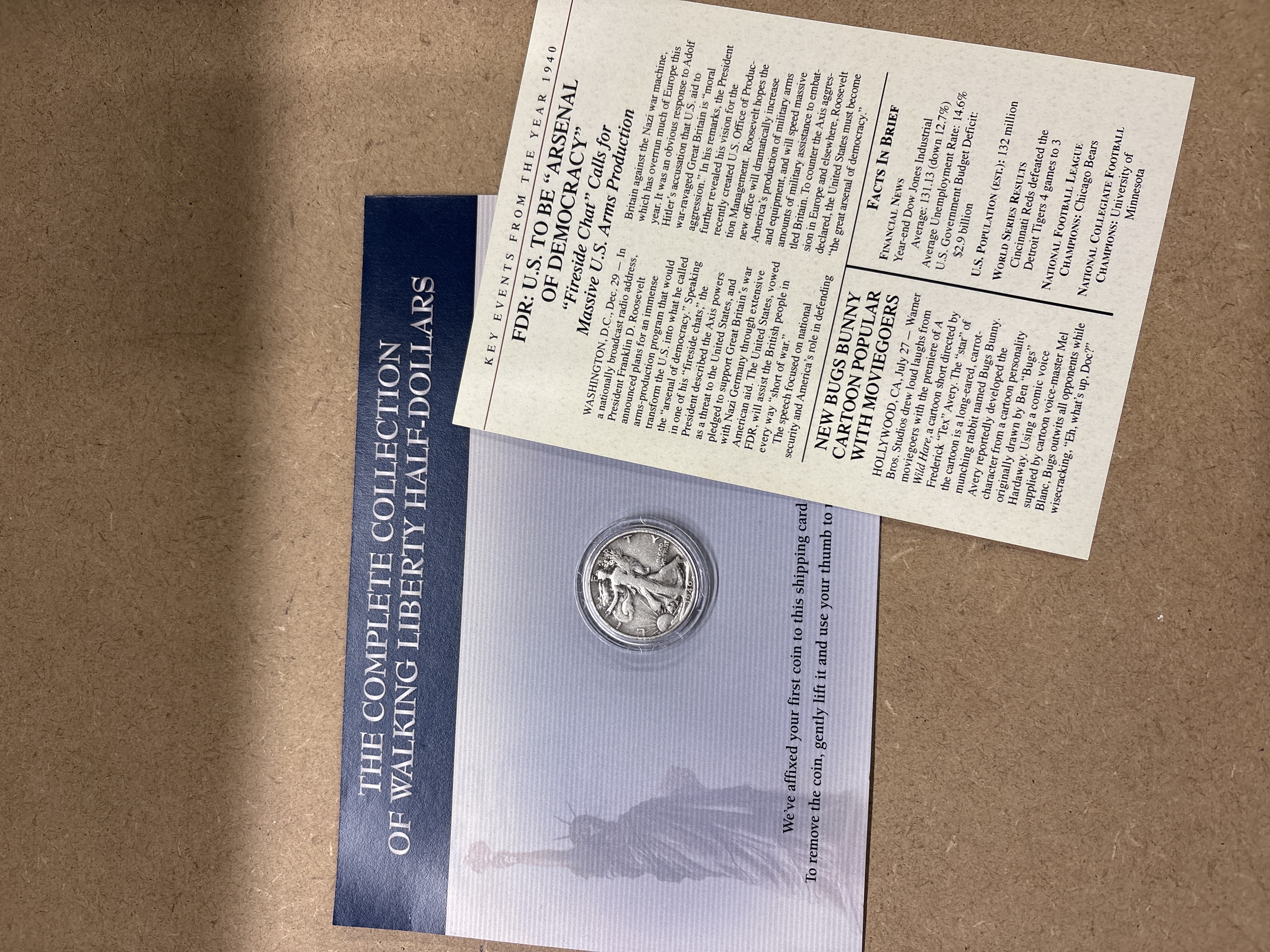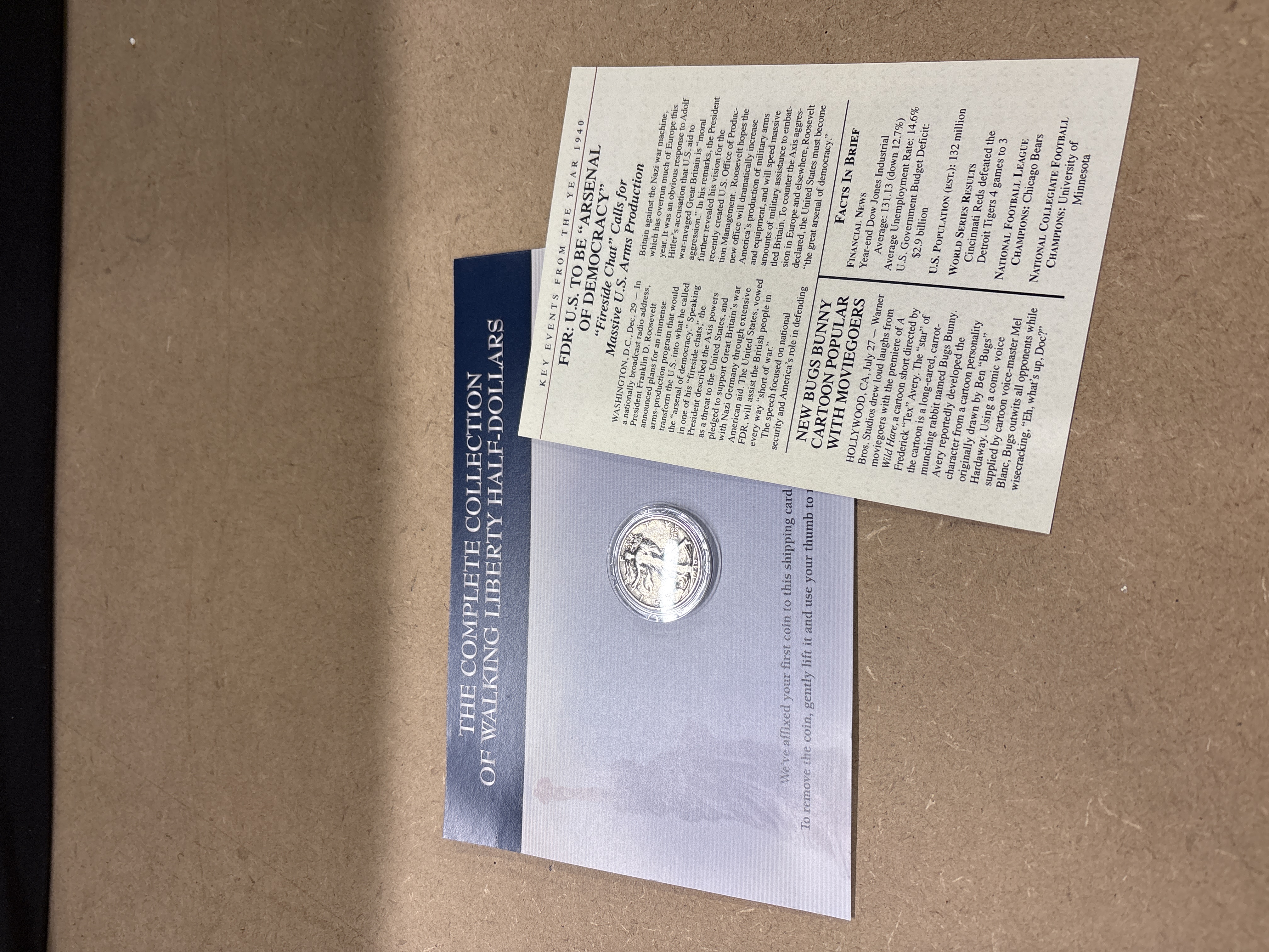 US Walking Liberty half dollar, KM-142. Designed by Adolph A. Weinman. Mint mark not visible due to mounting. Walking Liberty obverse / Eagle reverse. This issue coincides with the year of President Franklin D. Roosevelt’s Arsenal of Democracy speech.