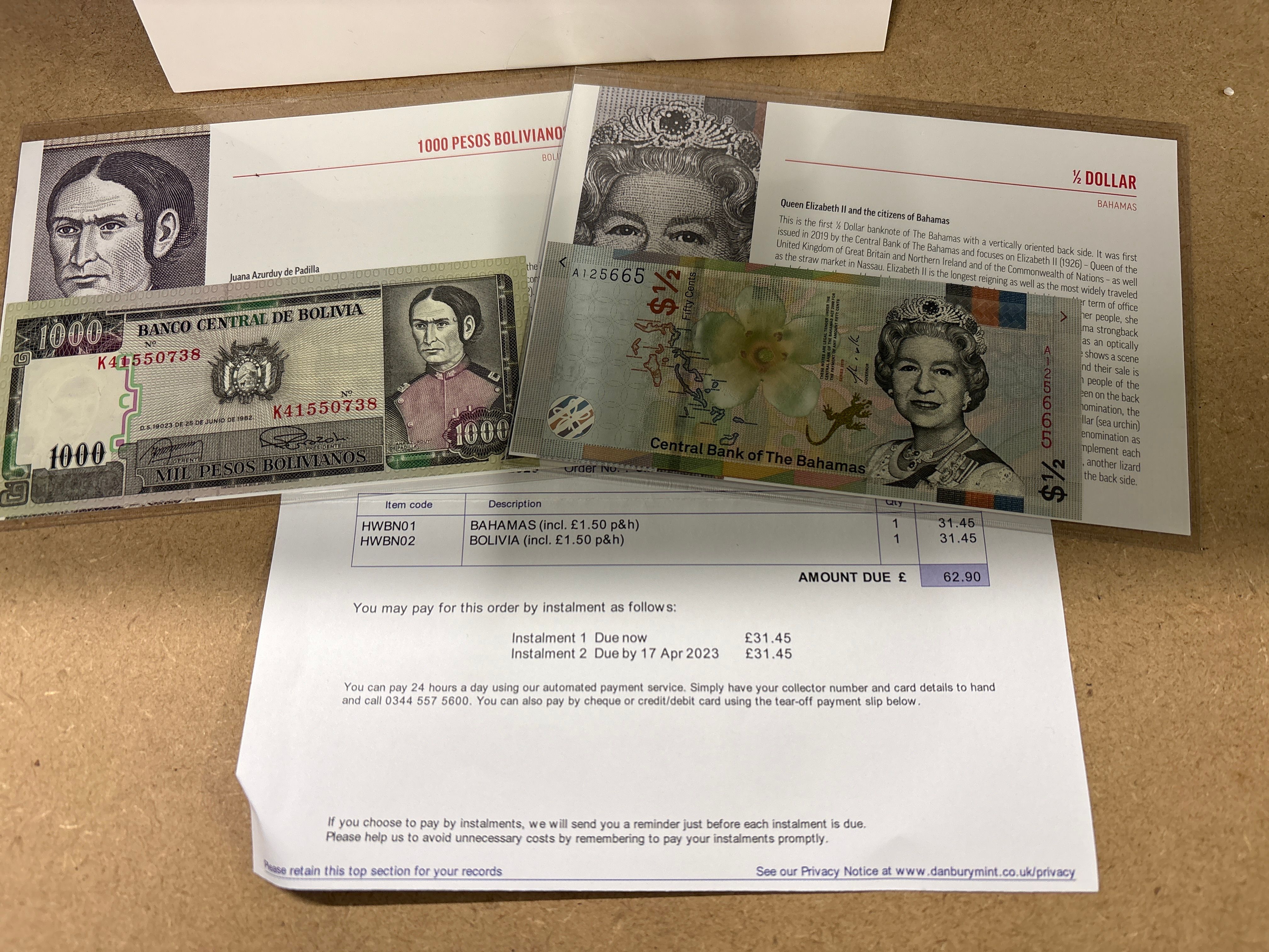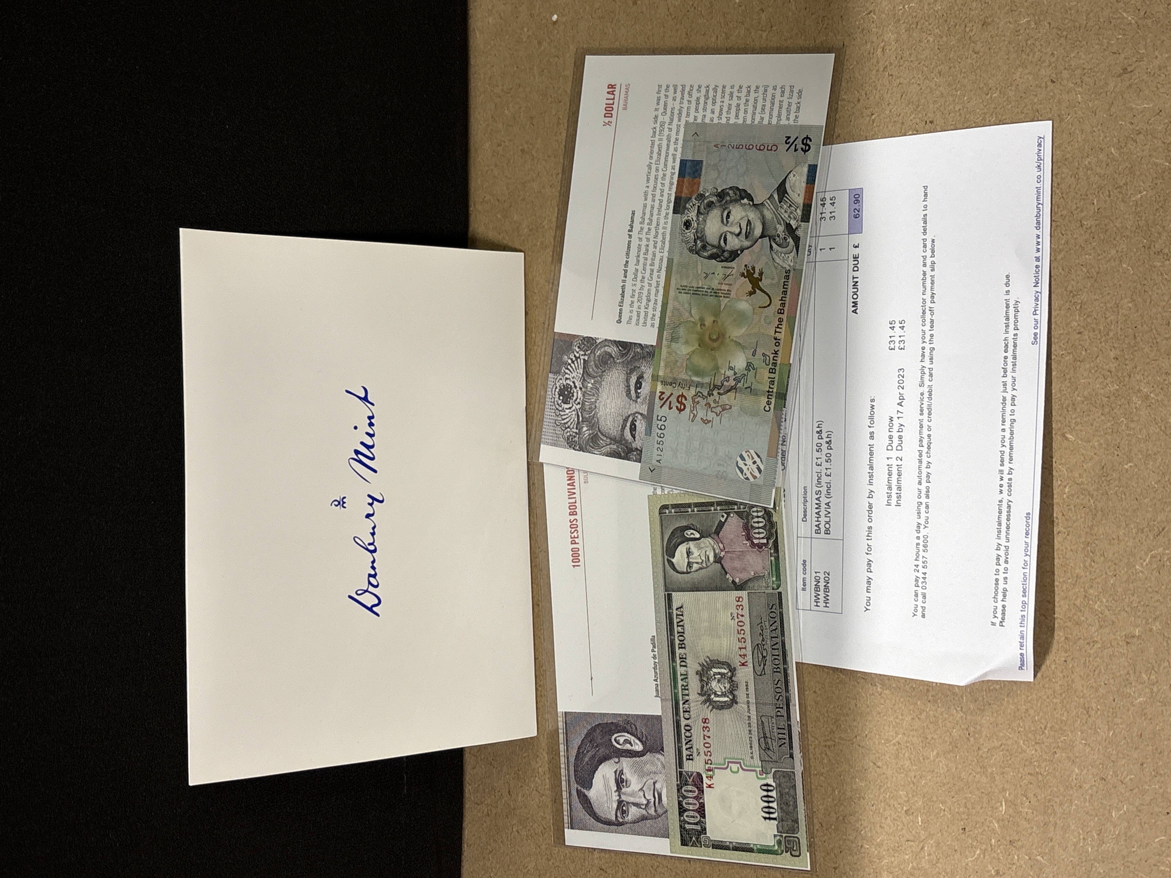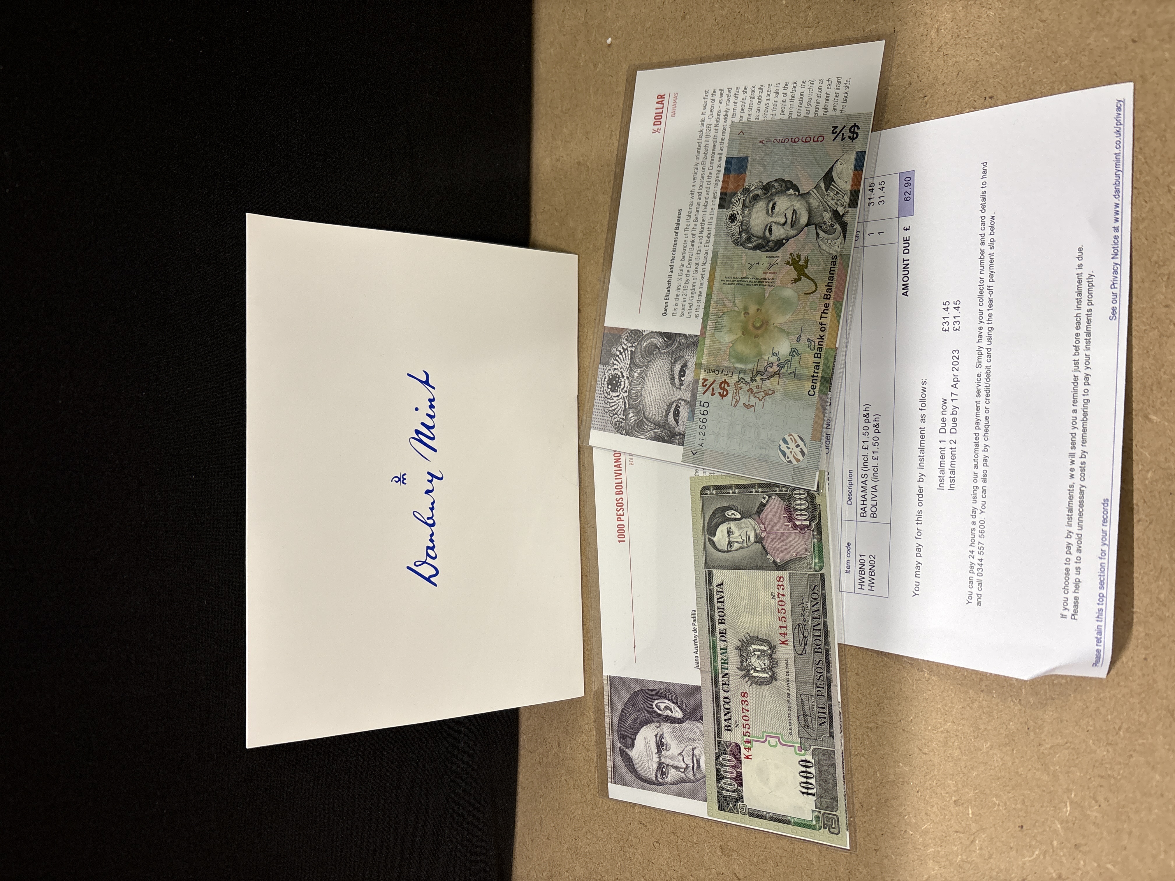 Note 1: BS (The Bahamas) Central Bank of The Bahamas, 1/2 Dollar (Fifty Cents), Series 2019, Pick# 76. Serial number A125665. Design features a portrait of Queen Elizabeth II, a hibiscus flower, and a sand lizard with a vertically oriented reverse. Note 2: BO (Bolivia) Banco Central de Bolivia, 1000 Pesos Bolivianos, dated 25 June 1982, Pick# 165. Serial number K41550738. Features Juana Azurduy de Padilla in a green and charcoal colour palette. This lot is accompanied by Danbury Mint protective sleeves, descriptive information cards, and original purchase documentation.