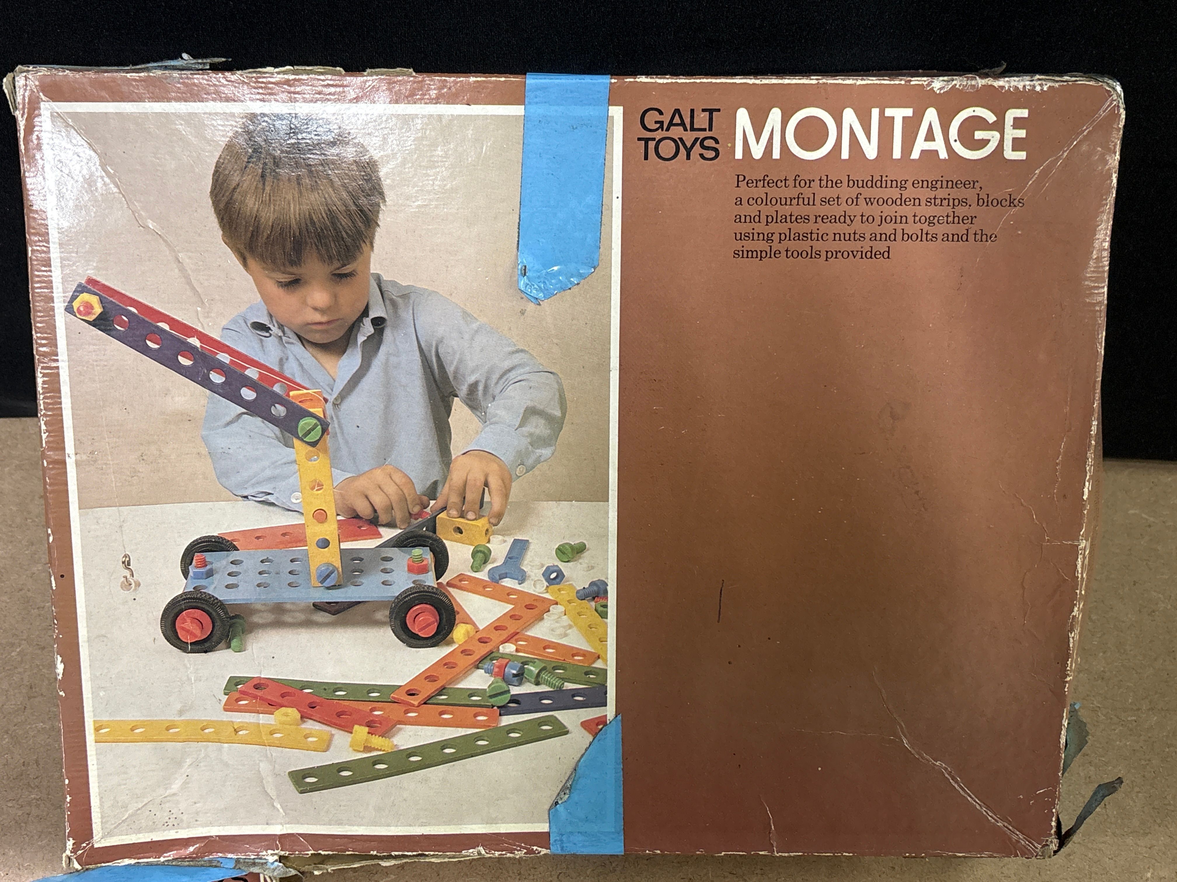 A vintage Galt Toys Montage construction set, designed for the budding engineer. The set features a variety of colourful wooden components, including strips, blocks, and plates, which are intended to be assembled using plastic nuts, bolts, and tools. Produced by James Galt and Co. Ltd, this set reflects the educational toy design of the mid-to-late 20th century. The lot comprises one boxed set. Dimensions: Not recorded.