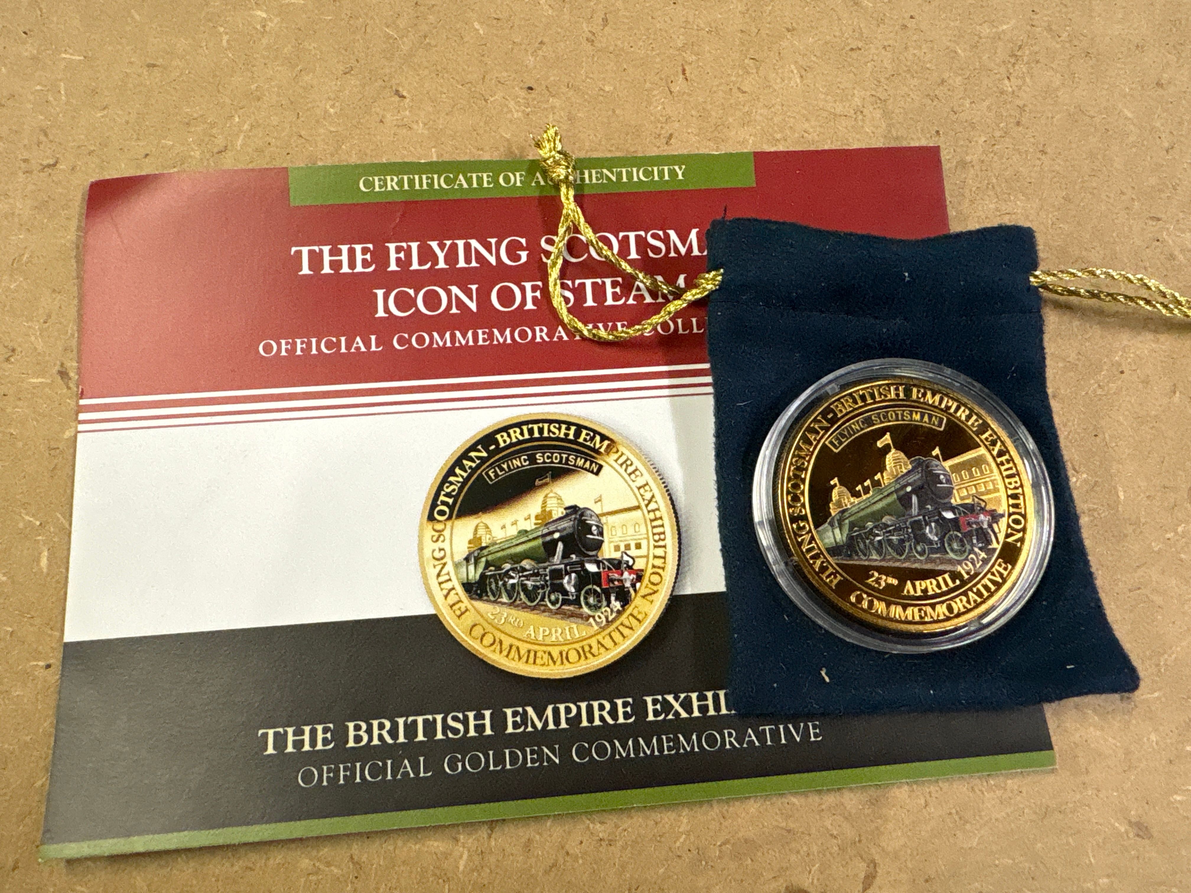 Official commemorative medal from the Icon of Steam series. This Flying Scotsman coin-style item commemorates the 23rd April 1924 British Empire Exhibition. The piece features a colourised Flying Scotsman / British Empire Exhibition design type. The Flying Scotsman was a primary attraction at the 1924 British Empire Exhibition held at Wembley.