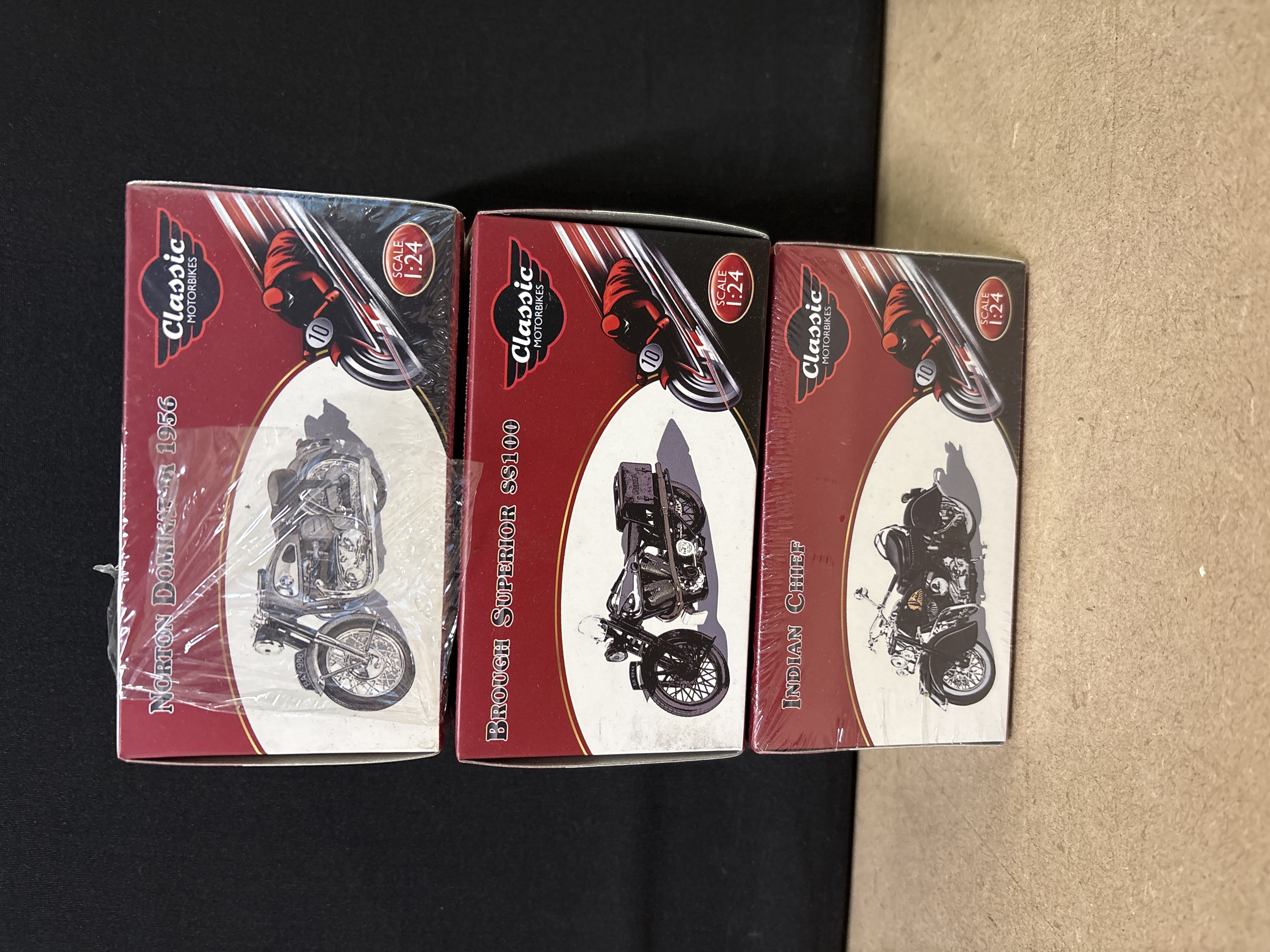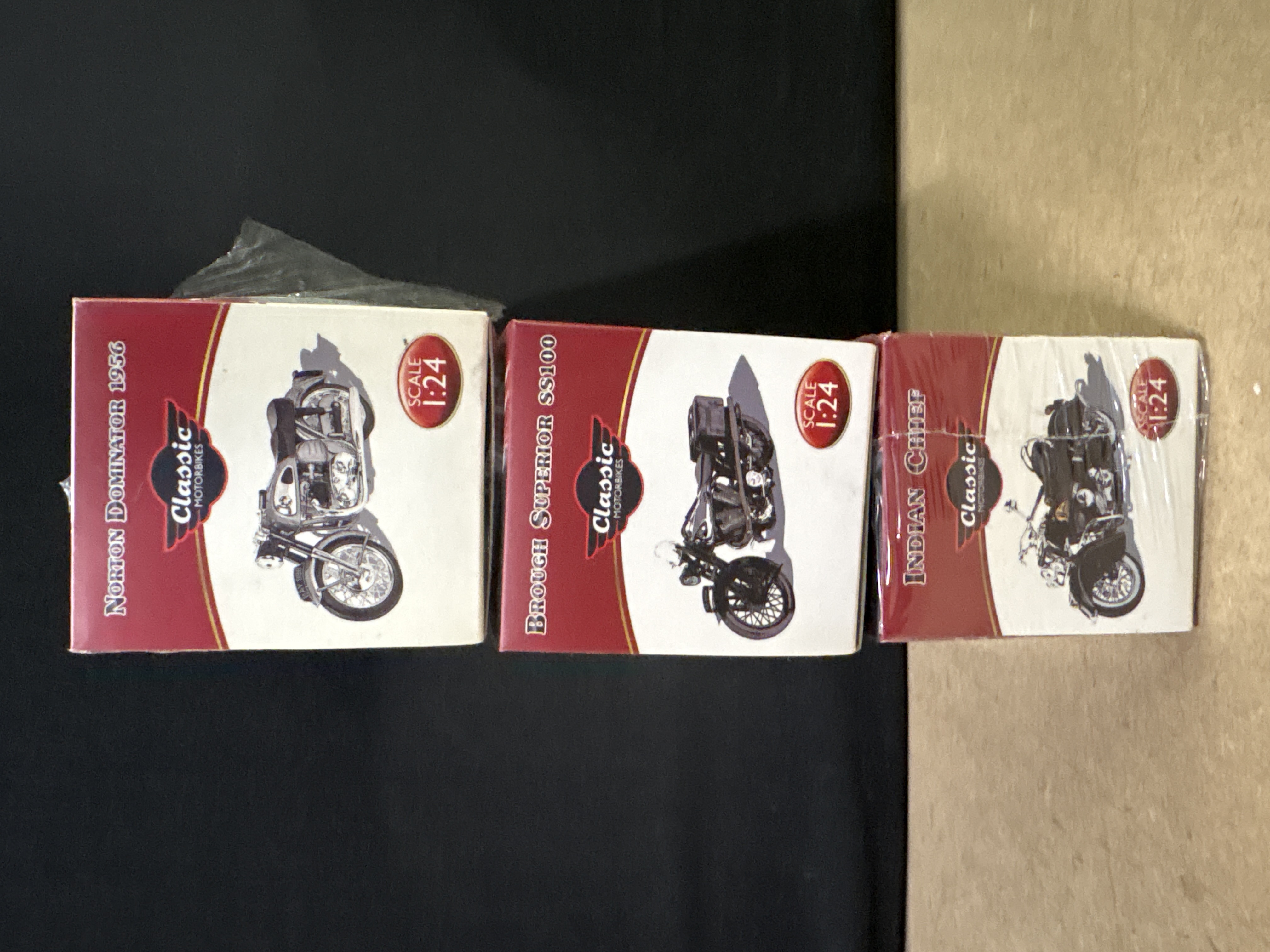 A group of three 1:24 scale motorcycle models from the Atlas Editions Classic Motorbikes collection. These models are constructed from metal with plastic detailing and rubber tyres. The lot includes a 1956 Norton Dominator, a Brough Superior SS100, and an Indian Chief. Each model is housed in its original retail box featuring the series branding. These Atlas collection pieces are detailed scale replicas designed for the enthusiast and collector market.