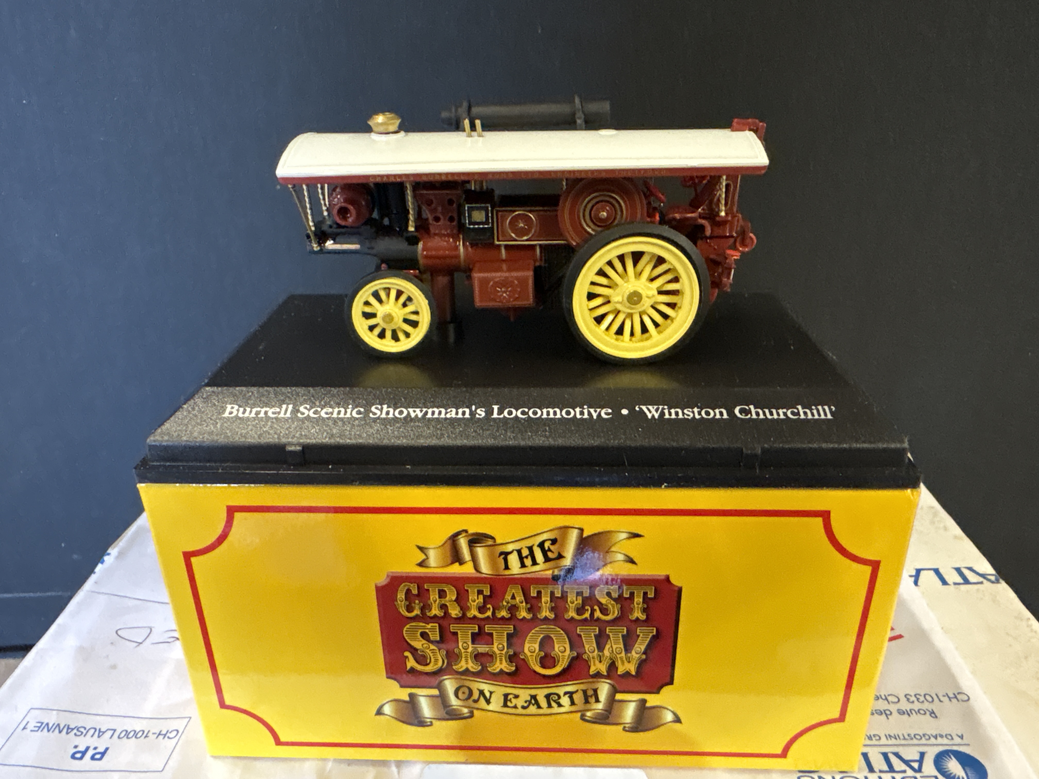 An Atlas Editions 1/76 scale diecast Burrell Scenic Showman’s Locomotive titled Winston Churchill, finished in maroon and yellow and presented on a display base with The Greatest Show On Earth packaging.