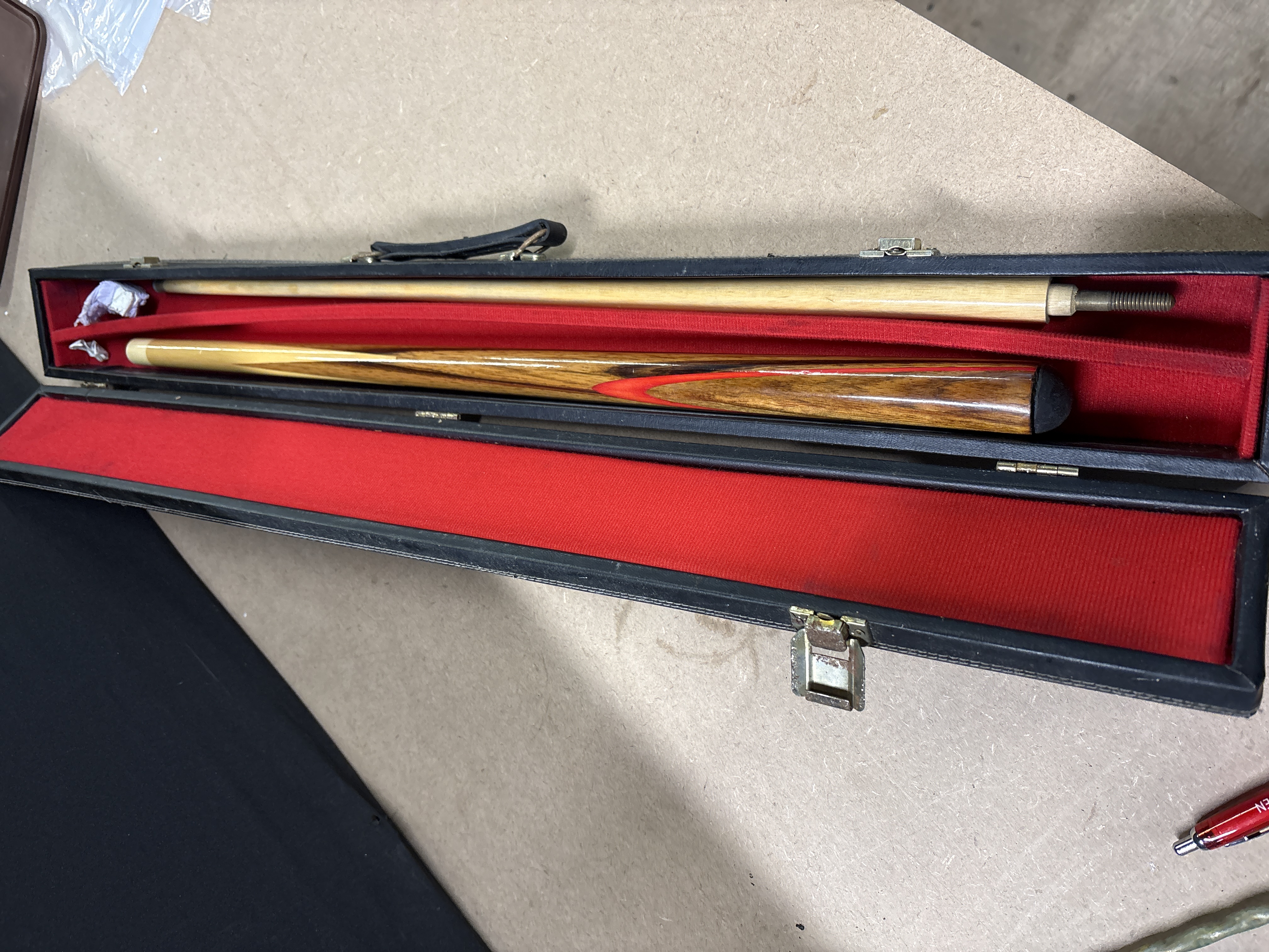 This lot consists of a single two-piece snooker cue constructed from wood. The cue features a light-coloured wooden shaft which connects to a polished wooden butt via a threaded metal joint. The butt section is embellished with a decorative red flame-motif inlay and terminates in a protective black rubber bumper. The cue is presented in a rectangular hard-shell carrying case with a textured black synthetic exterior and a bright red felt-lined interior featuring internal dividers. The case is equipped with a black carry handle and two metal latches. No maker’s marks, model numbers, or origins are present on the cue or case. Case length approximately 80 cm.
