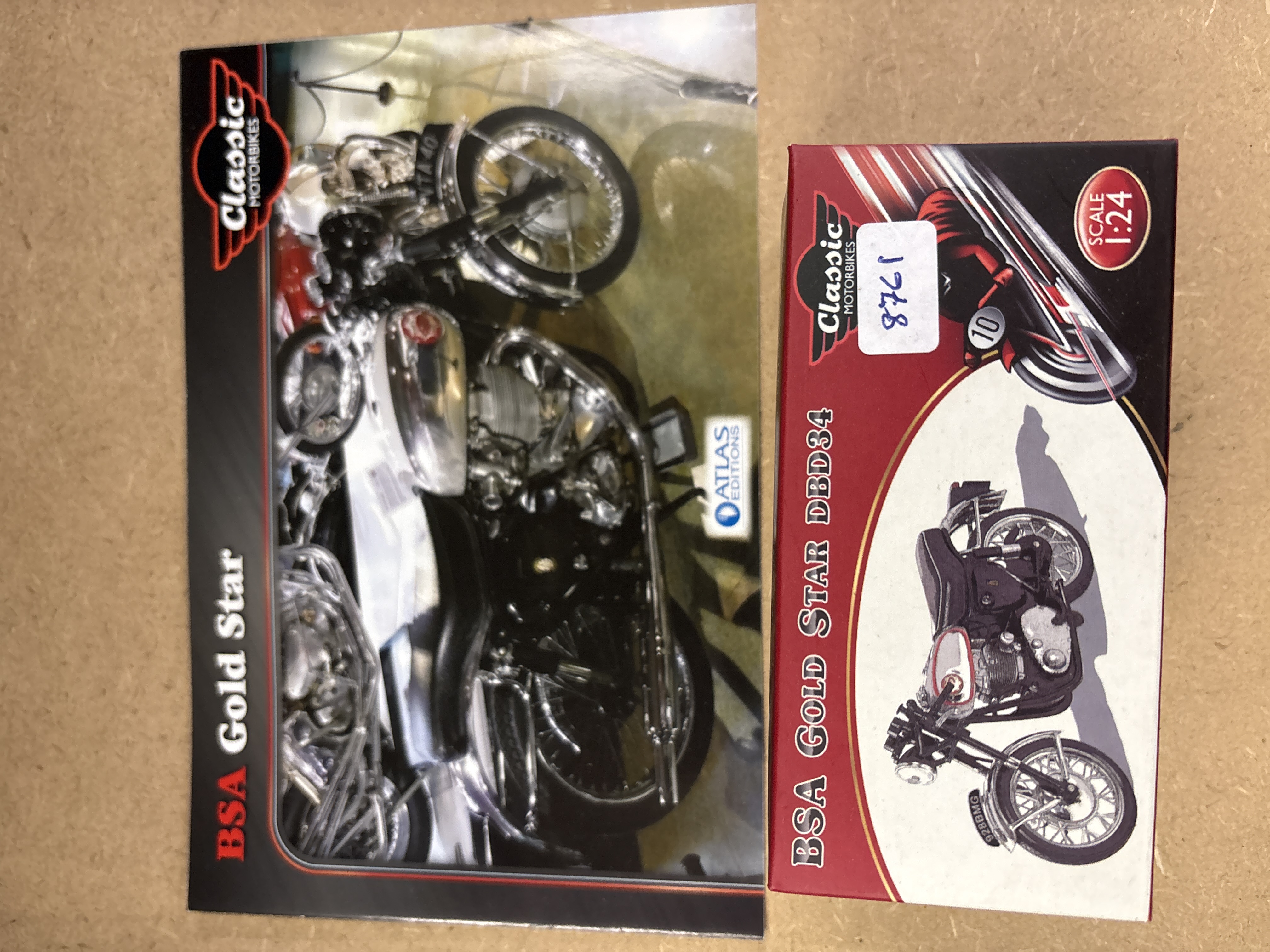 This lot features a single collector’s 1:24 scale model of the 1956 BSA Gold Star DBD34, a highlight of the Atlas Editions Classic Motorbikes series. Expertly crafted from metal, the model represents the definitive British single-cylinder machine, finished in a traditional silver and black colour scheme. The model is housed in its original decorative box, which carries a handwritten inventory reference 8761. Also included is a large-format informational brochure featuring a high-quality photograph of the motorcycle. The registration 928BMG is shown on the box art, while the brochure depicts the registration VTA 40.