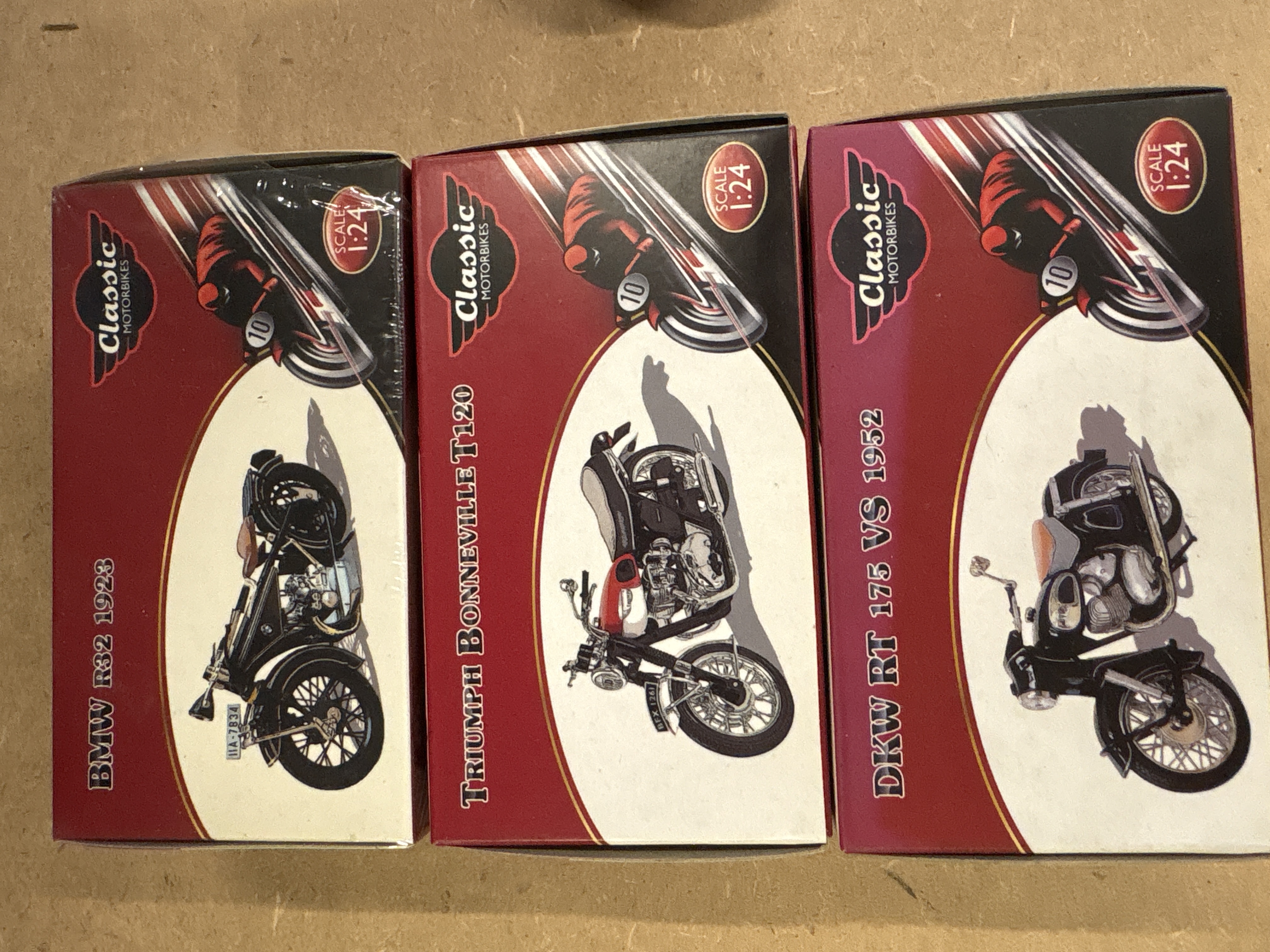 This lot features four (4) 1:24 scale die-cast metal model motorcycles from the Atlas Editions Classic Motorbikes collection. The set includes a 1923 BMW R32, a Triumph Bonneville T120, a 1952 DKW RT 175 VS, and a fourth additional model. Year: 1923, 1952, and others. Make: BMW, Triumph, DKW. Model: R32, Bonneville T120, RT 175 VS. VIN: Not applicable (scale models). Engine: Depicted as 494cc, 650cc, and 174cc respectively. Mileage: Zero. Modifications: None. Please note that modifications to original scale models can affect their market value.