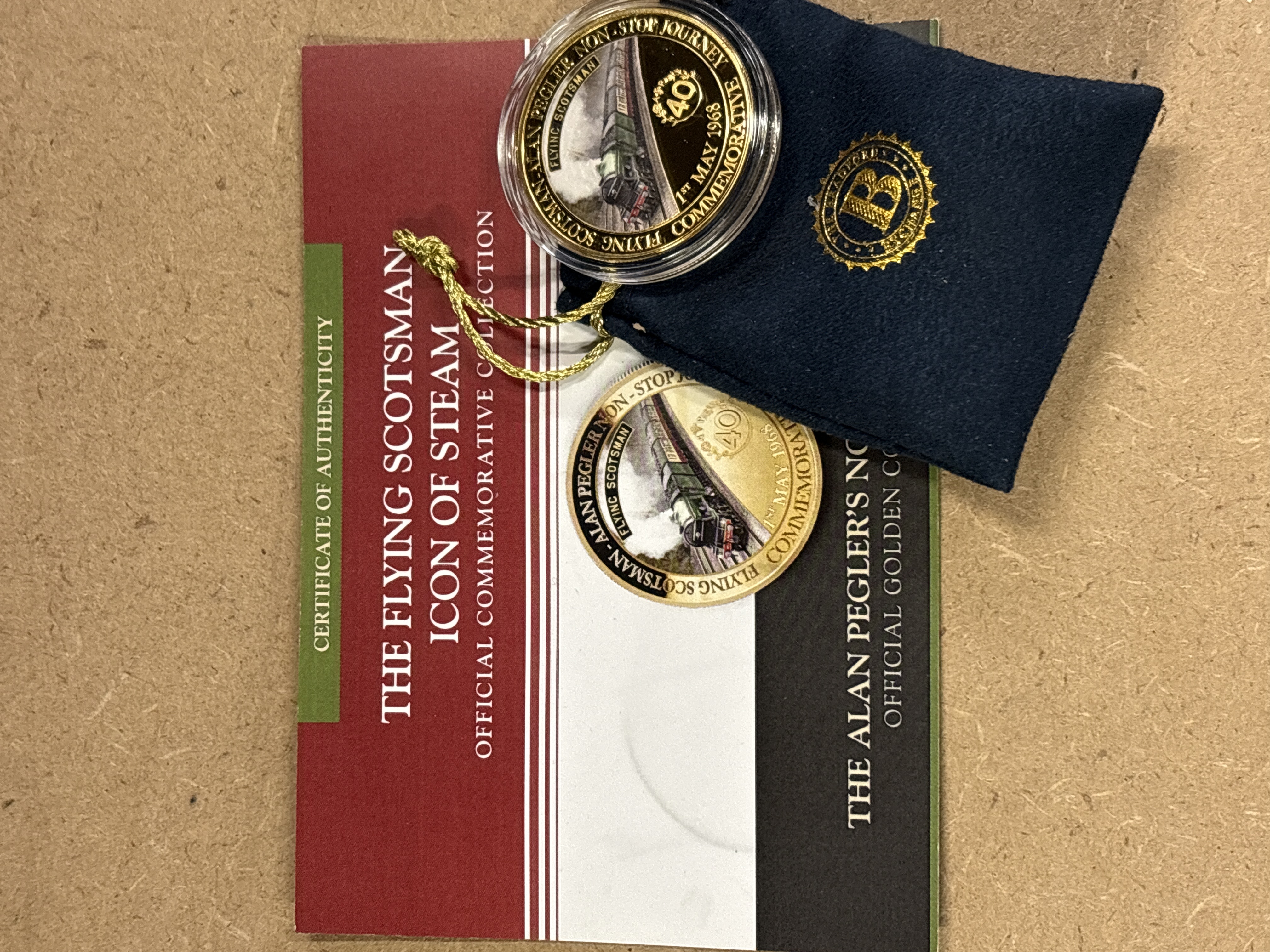 Issued by The Bradford Exchange as part of The Flying Scotsman Icon of Steam Official Commemorative Collection. This issue commemorates the 40th anniversary of the 1968 non-stop journey. Features a colourised obverse design. Includes original Certificate of Authenticity, informational brochure, and branded drawstring pouch.
