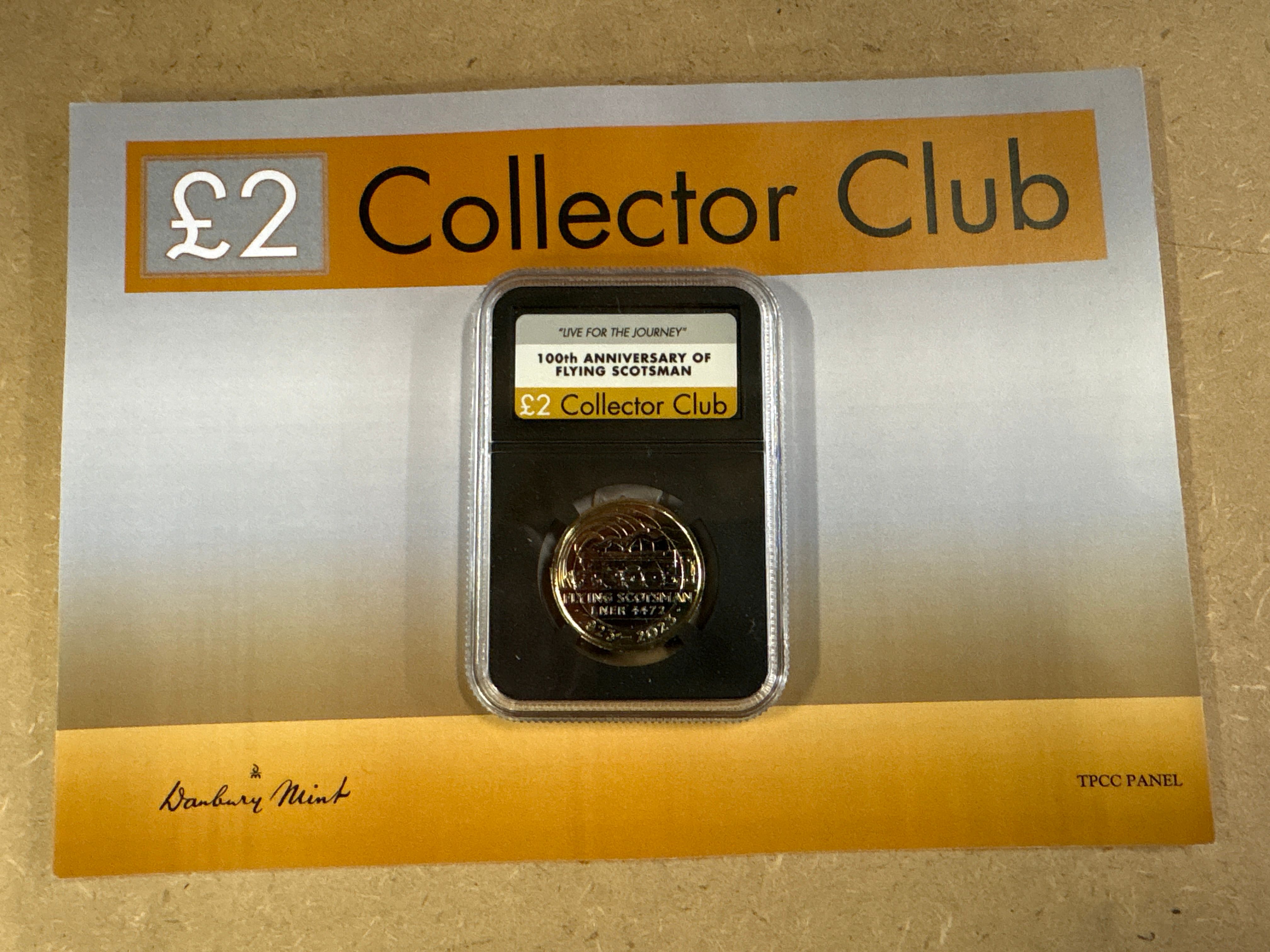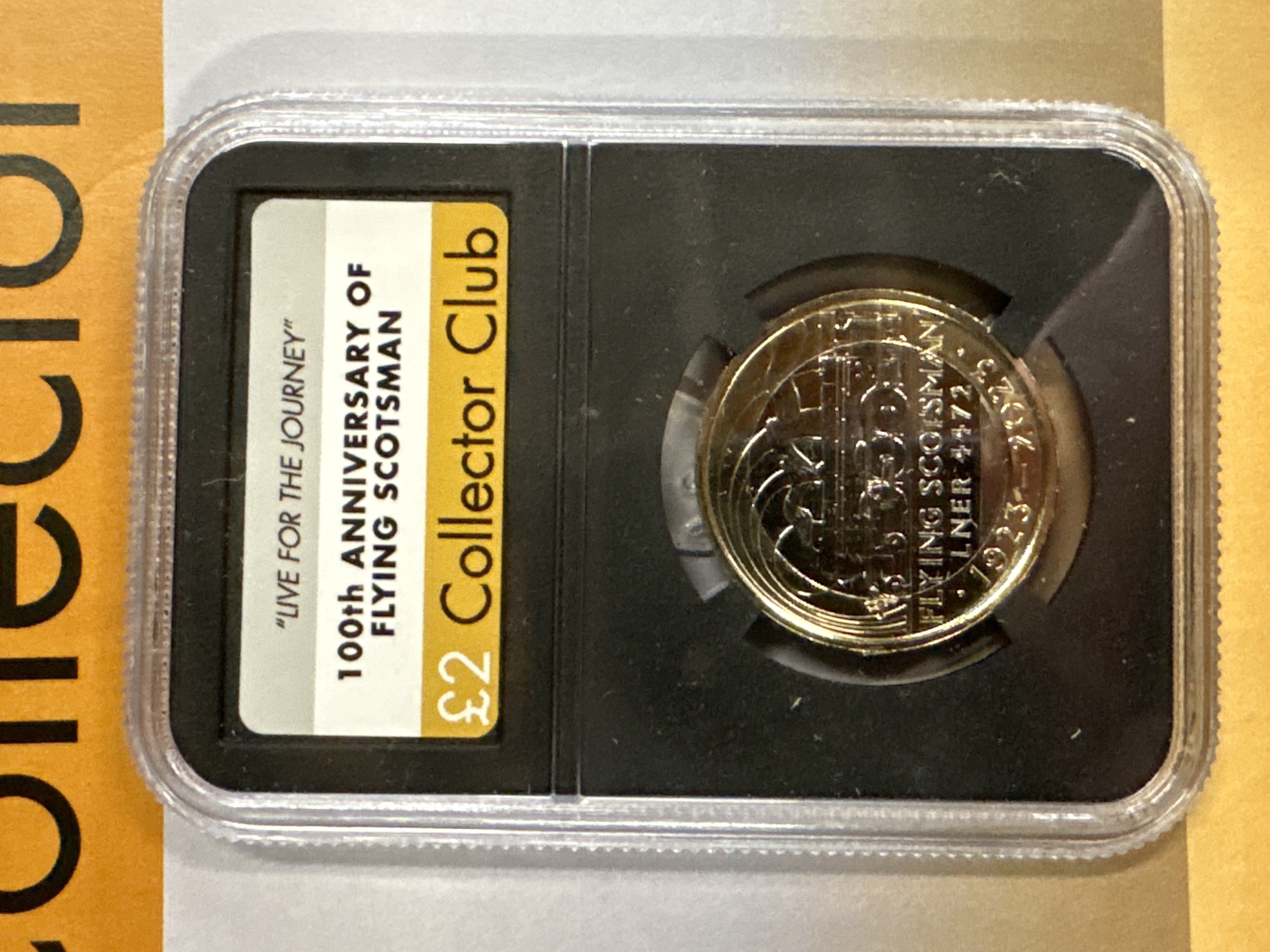 United Kingdom 2023 two pound bimetallic coin. This Danbury Mint coin issue commemorates the centenary of the Flying Scotsman. Obverse features the King Charles III portrait. Reverse features the Flying Scotsman design. Edge inscription reads LIVE FOR THE JOURNEY. This issue commemorates the 100th anniversary of the Flying Scotsman steam locomotive entering service in 1923.