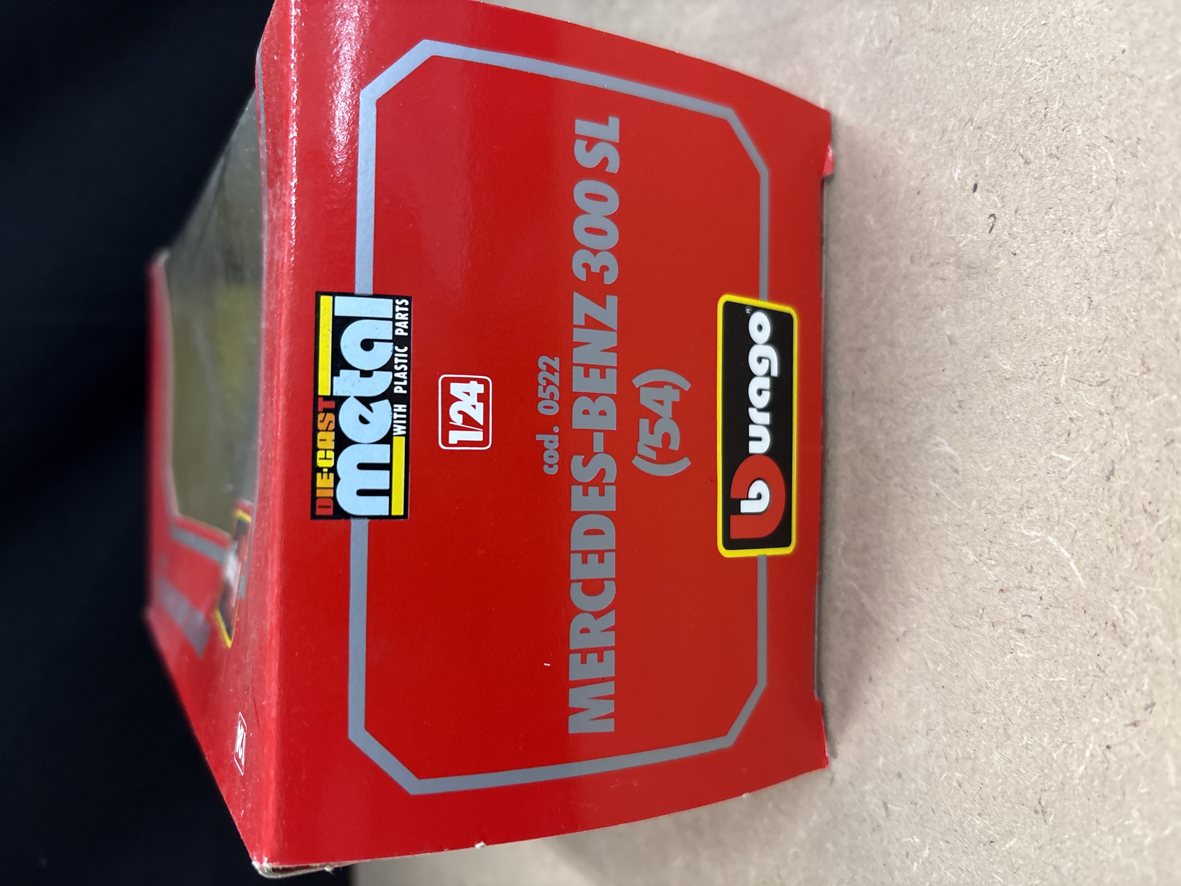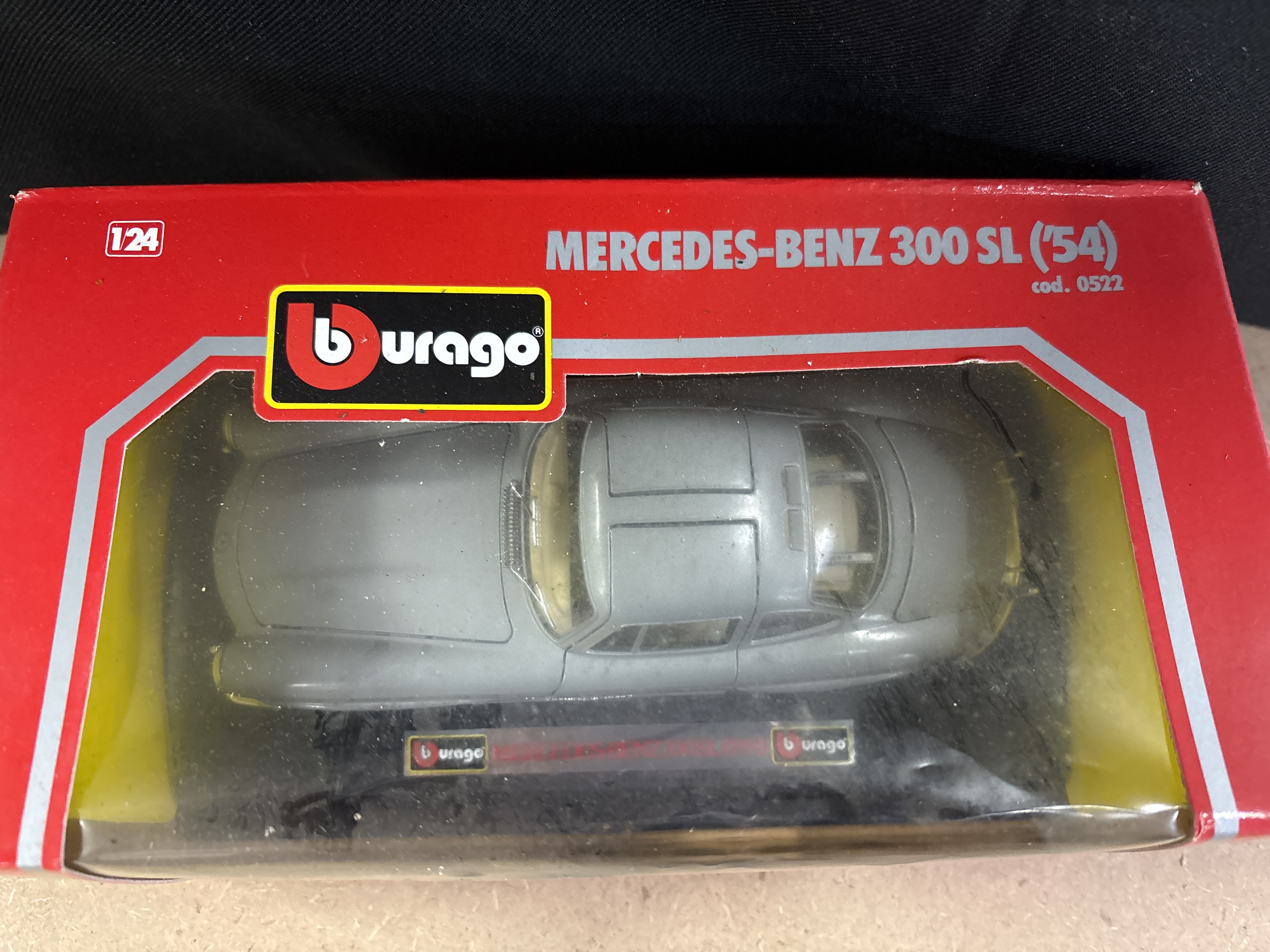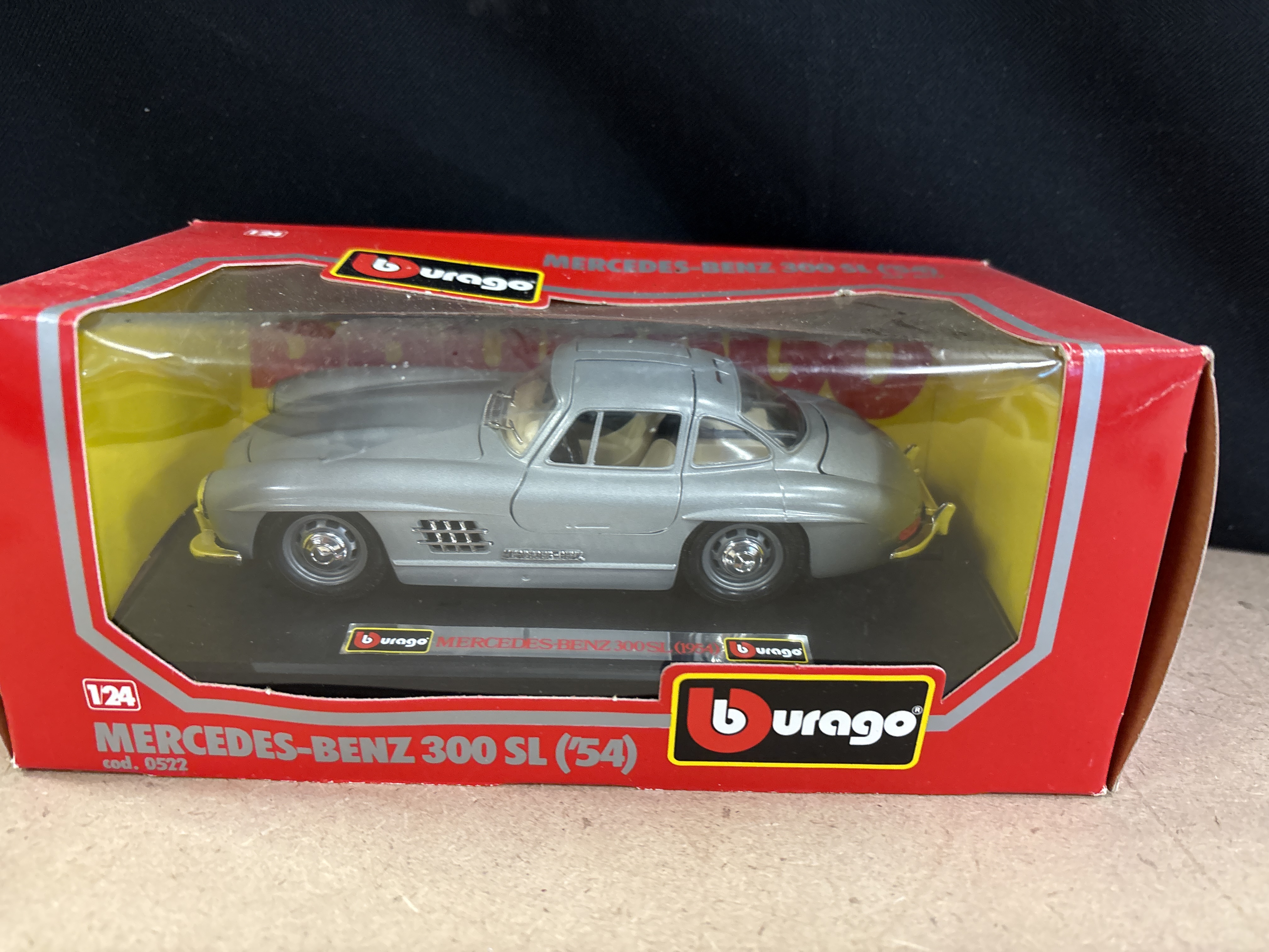 Manufactured by Bburago, this 1/24 scale model represents the 1954 Mercedes-Benz 300 SL. The vehicle is constructed from metal with plastic parts and features a silver paint finish, a tan interior, and chrome-coloured accents. The item is housed in its original red and yellow window box, identified by the manufacturer’s code 0522. The car remains mounted on its internal display plinth. Standard features for this Burago series typically include an opening bonnet and doors.