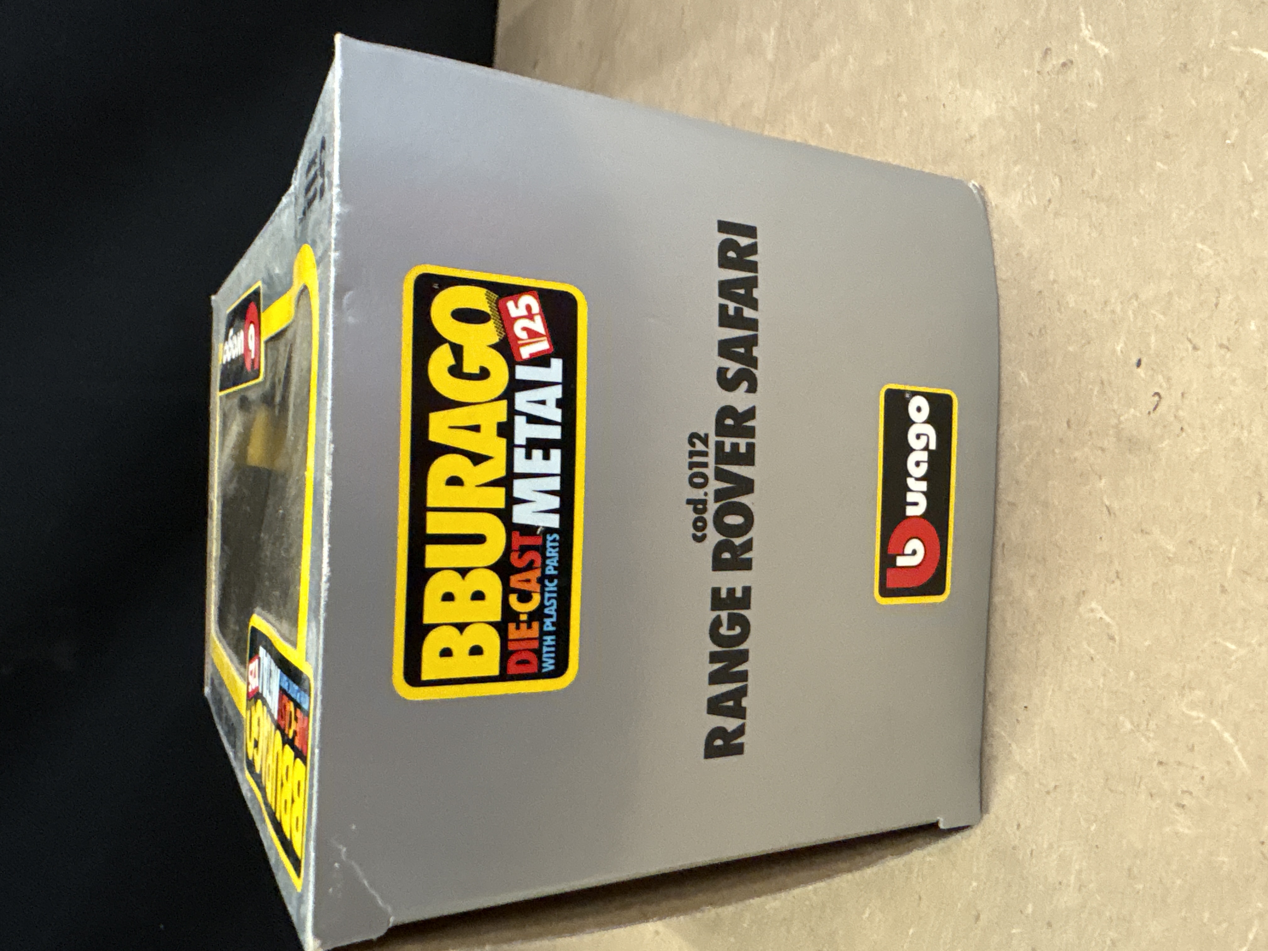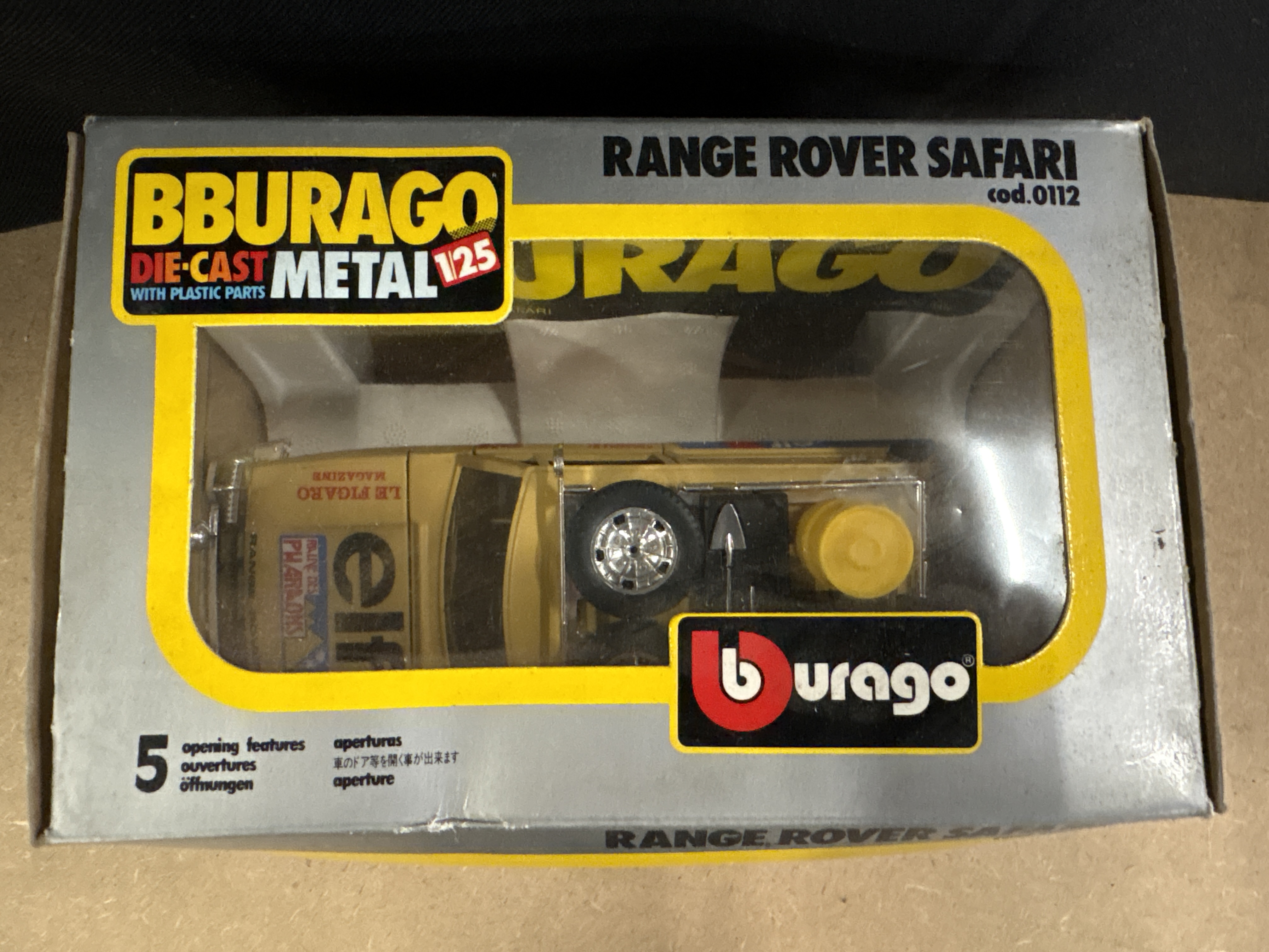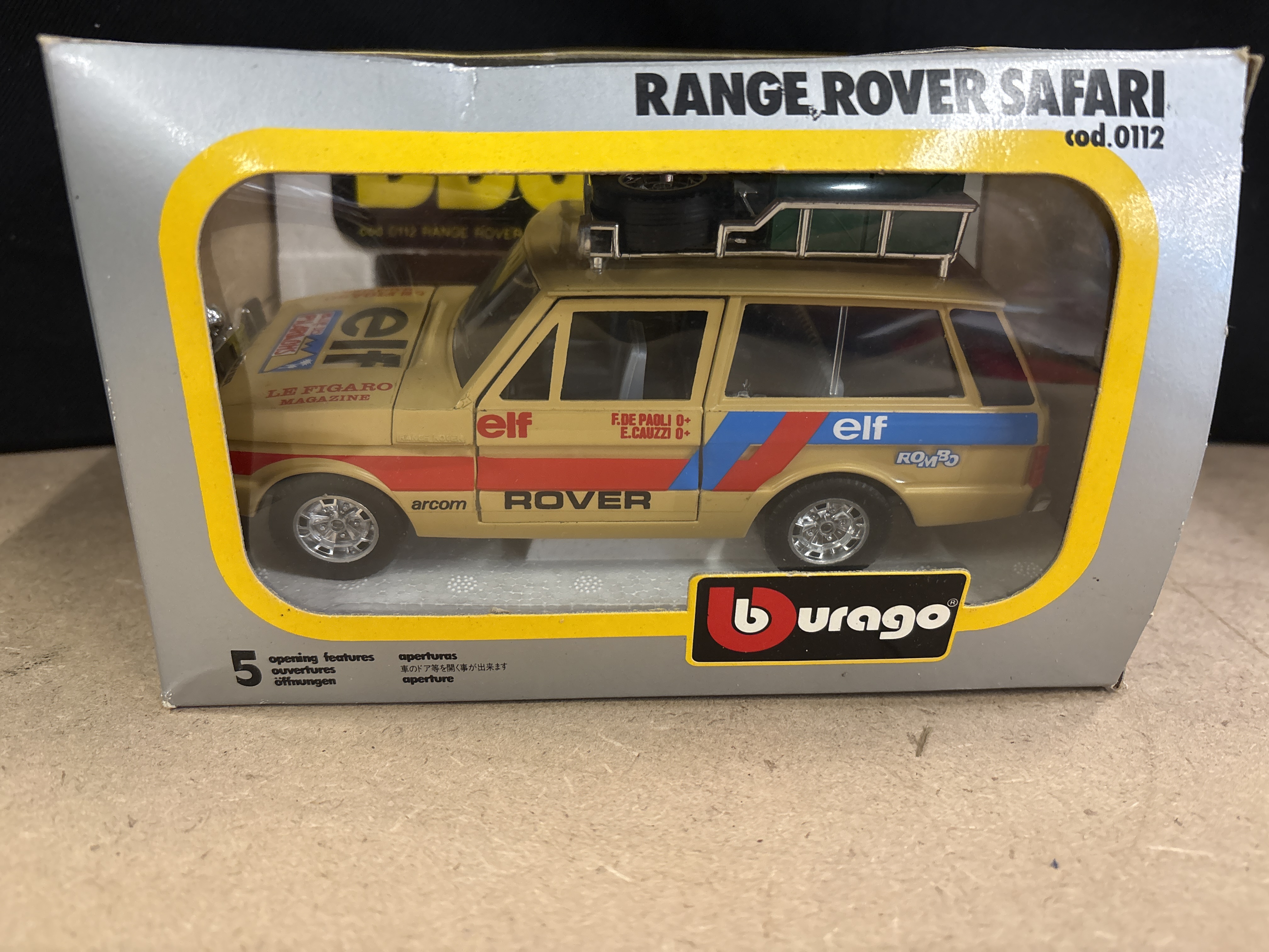 Produced by Bburago, this 1/25 scale model depicts a Range Rover Safari in a detailed rally configuration. Constructed from metal with plastic components, the vehicle features five opening parts including the doors, bonnet, and rear tailgate. The model is finished in a period-correct sand colourway accented by red and blue racing stripes. The livery includes authentic decals for sponsors such as elf, arcom, and LE FIGARO MAGAZINE, alongside the driver names F. DE PAOLI and E. CAUZZI. The roof is fitted with a rack carrying a spare chrome-finish wheel, a shovel, and a yellow fuel canister. This Italian-made collectable, identified by product code 0112, is presented in its original silver and yellow window box.