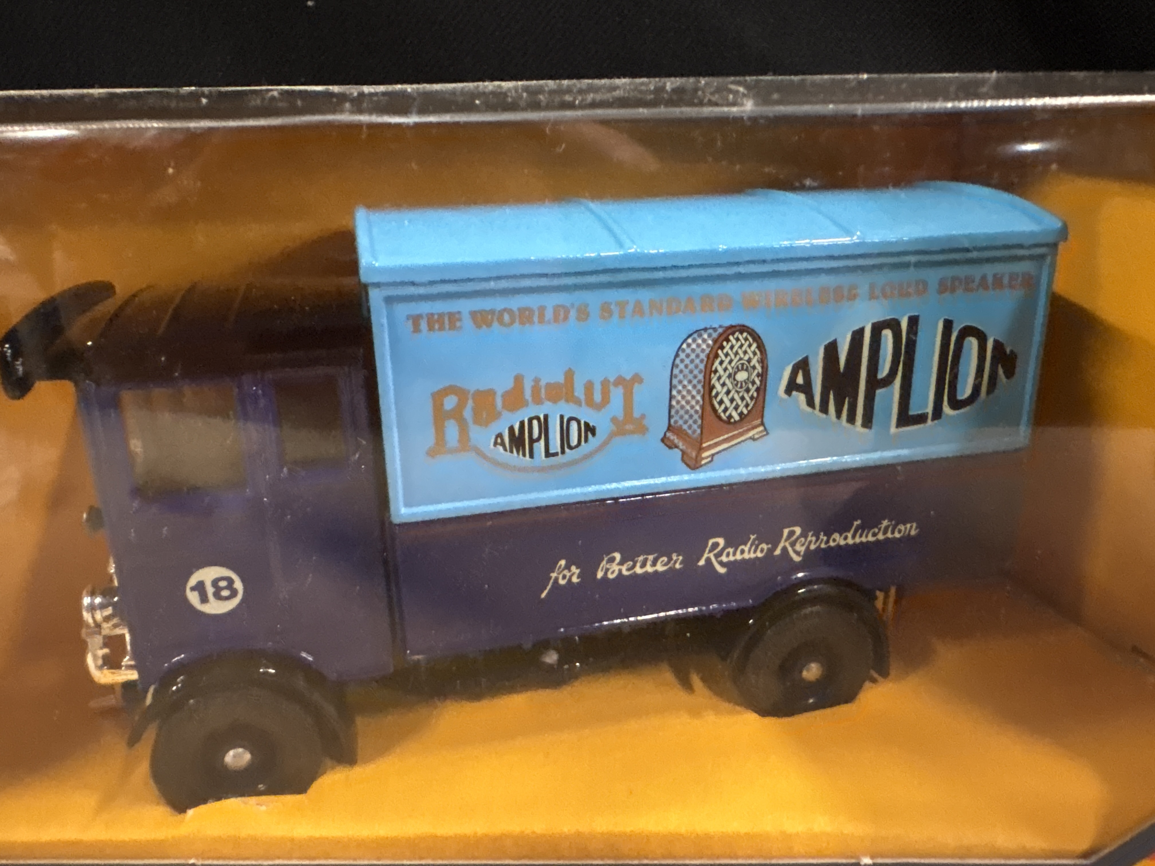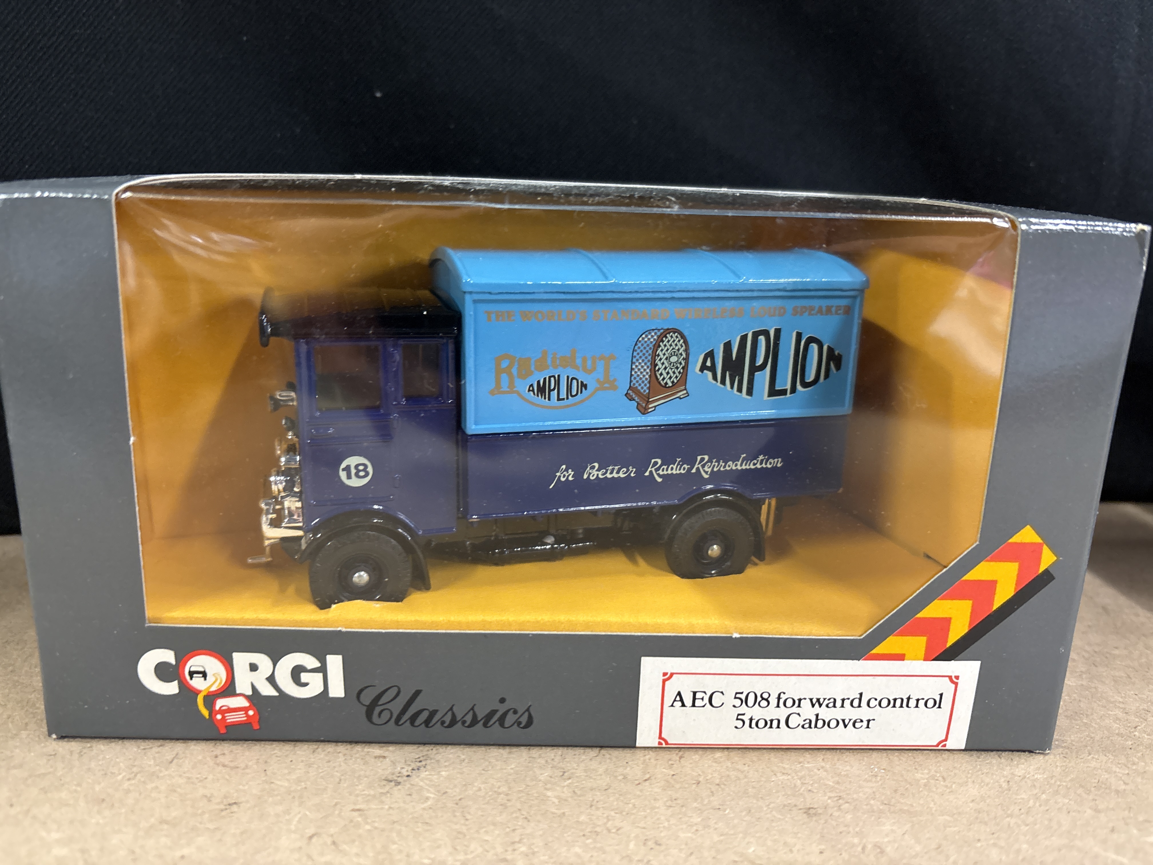 Produced by Corgi as part of the Corgi Classics series, this is a 1:43 scale model of an AEC 508 Forward Control 5 Ton Cabover truck (Product Code C897/5). The model is constructed from metal and features the vintage commercial livery for Radiolux Amplion, including the slogans “The World’s Standard Wireless Loud Speaker” and “for Better Radio Reproduction”. The colour scheme consists of a navy blue cab and lower chassis with a contrasting light blue upper cargo section and black fenders. The cab doors are marked with the number 18. This single item is presented in its original grey window box with the characteristic yellow internal display insert.