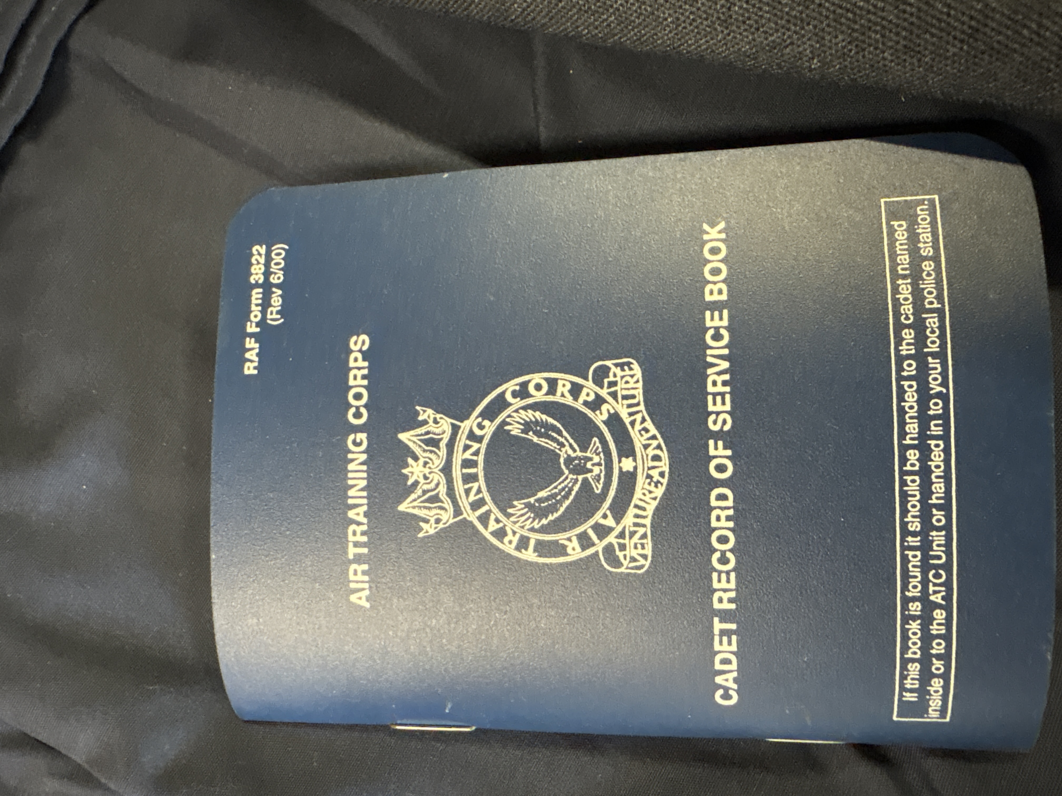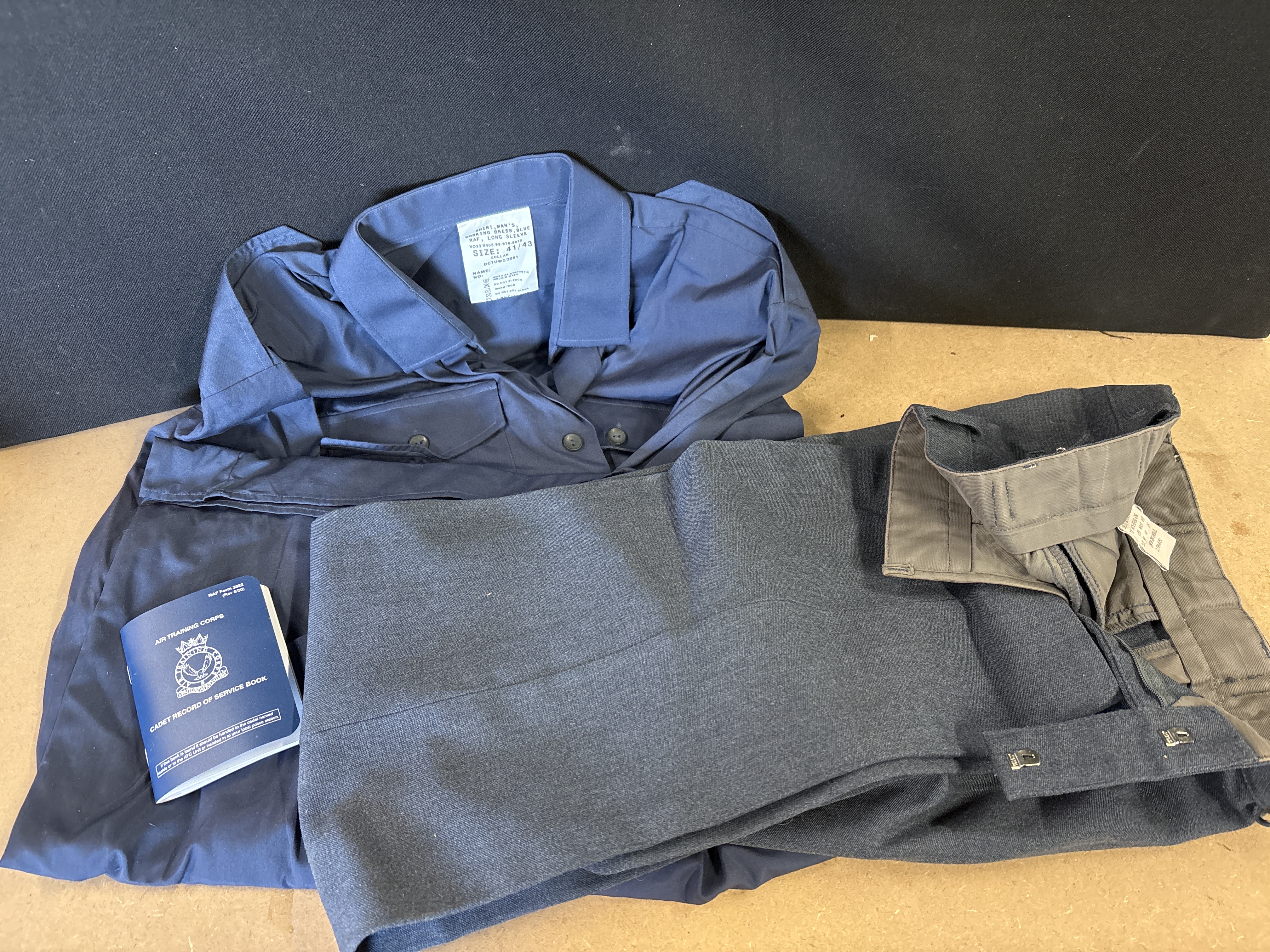 A group lot of three items of modern Royal Air Force (RAF) and Air Training Corps (ATC) interest. The lot comprises a man’s long-sleeve working dress shirt in RAF blue fabric, featuring pleated chest pockets with button-down flaps and epaulettes. The internal collar label identifies the garment as Shirt, Man’s, Working Dress, Blue, RAF, Long Sleeve, size 41/43, with NATO Stock Number 8405-99-978-5975. Accompanying the shirt is a pair of RAF blue-grey fabric dress trousers, labelled as Dress (Minimum Care) and manufactured by J. Compton Sons & Webb Ltd. The trousers are size 80/88/104 (Leg 80cm, Waist 88cm, Seat 104cm) with NSN 8405-99-130-6764, featuring a clasp and button waist closure and pleated front. The final item is an Air Training Corps Cadet Record of Service Book, RAF Form 3822 (Revision 6/00). The blue card cover displays the ATC crest with the motto Venture Adventure. This is the standard issue document used by cadets to record their service history, qualifications, and achievements.