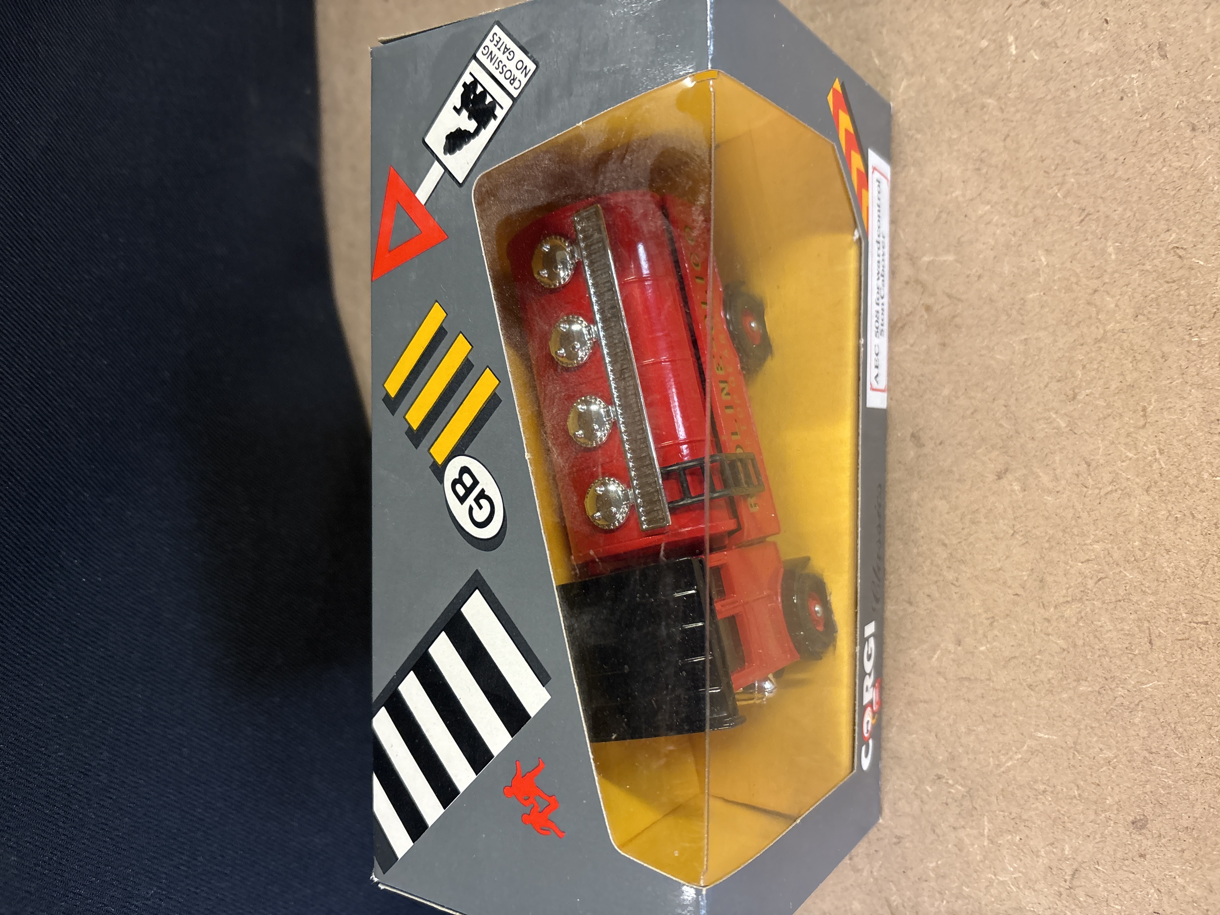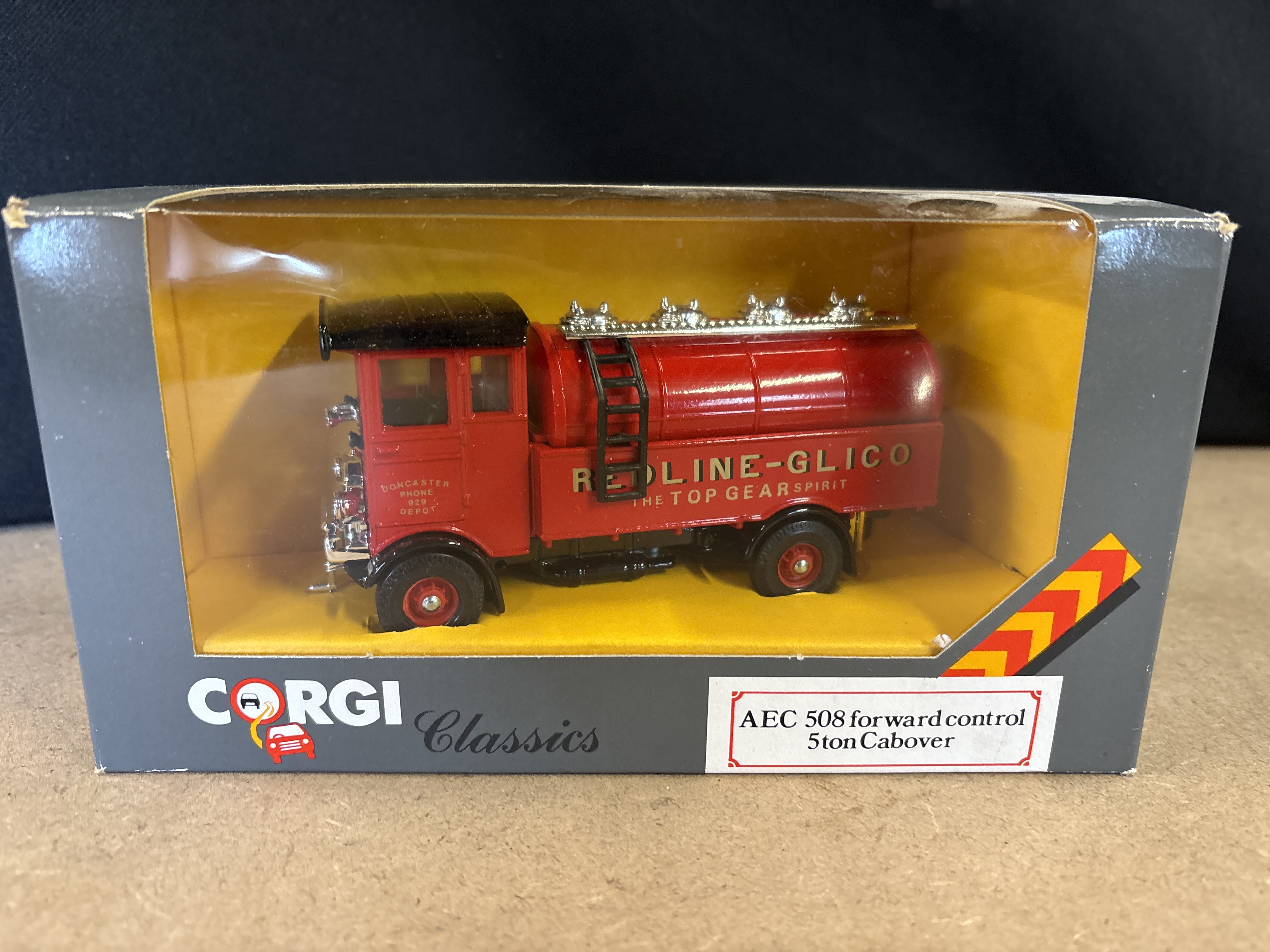 Produced by Corgi as part of the Corgi Classics series, this model represents an AEC 508 Forward Control 5-ton Cabover tanker truck. The vehicle is constructed from metal and finished in a red and black colour scheme. It features the Redline-Glico – The Top Gear Spirit livery on the tank sides, with additional detailing on the cab door reading Doncaster Phone 929 Depot. The model includes chrome-effect fixtures on the tank top and a black access ladder. This item is housed in its original grey Corgi Classics window display box, reference number C945/6.