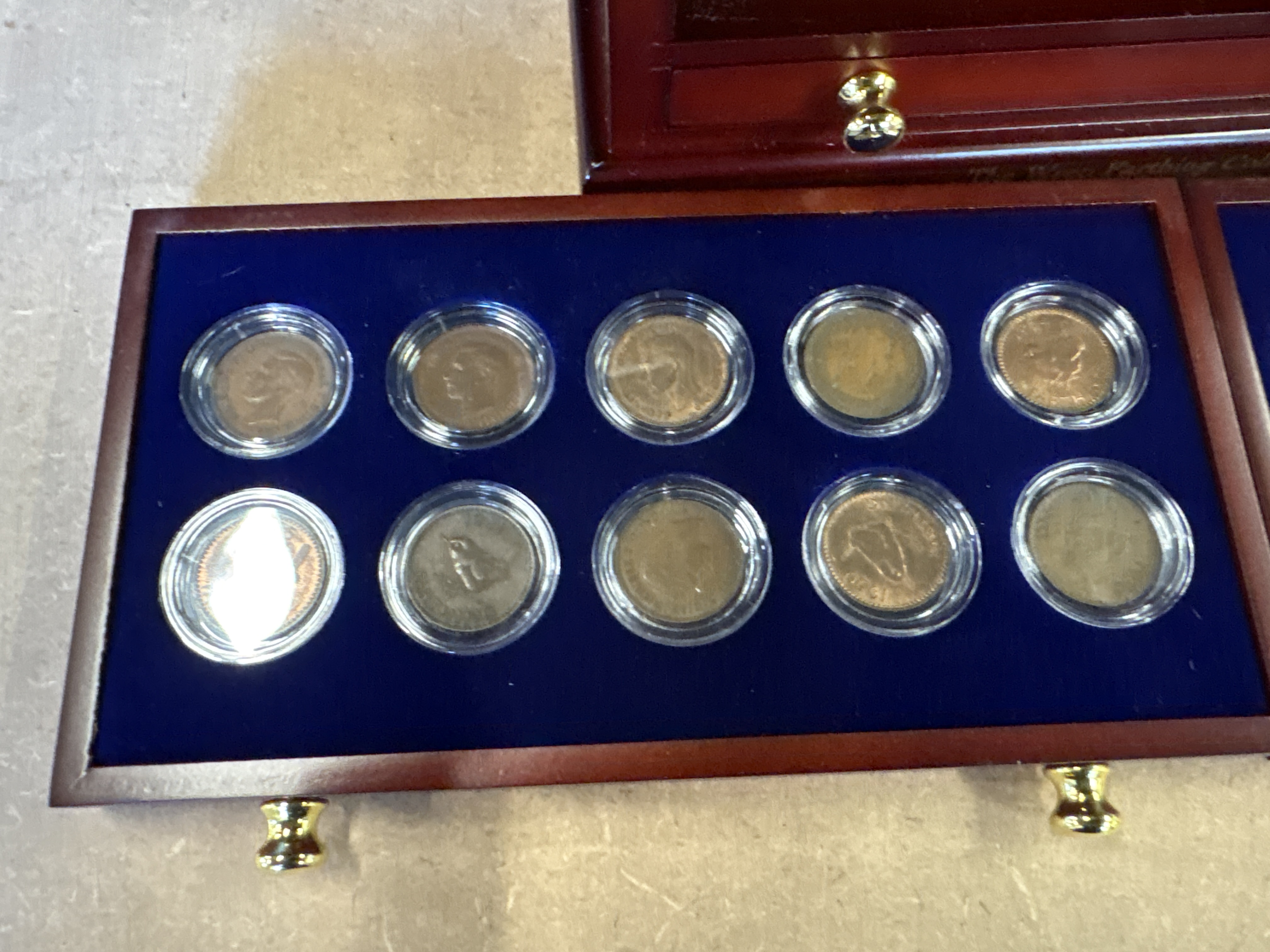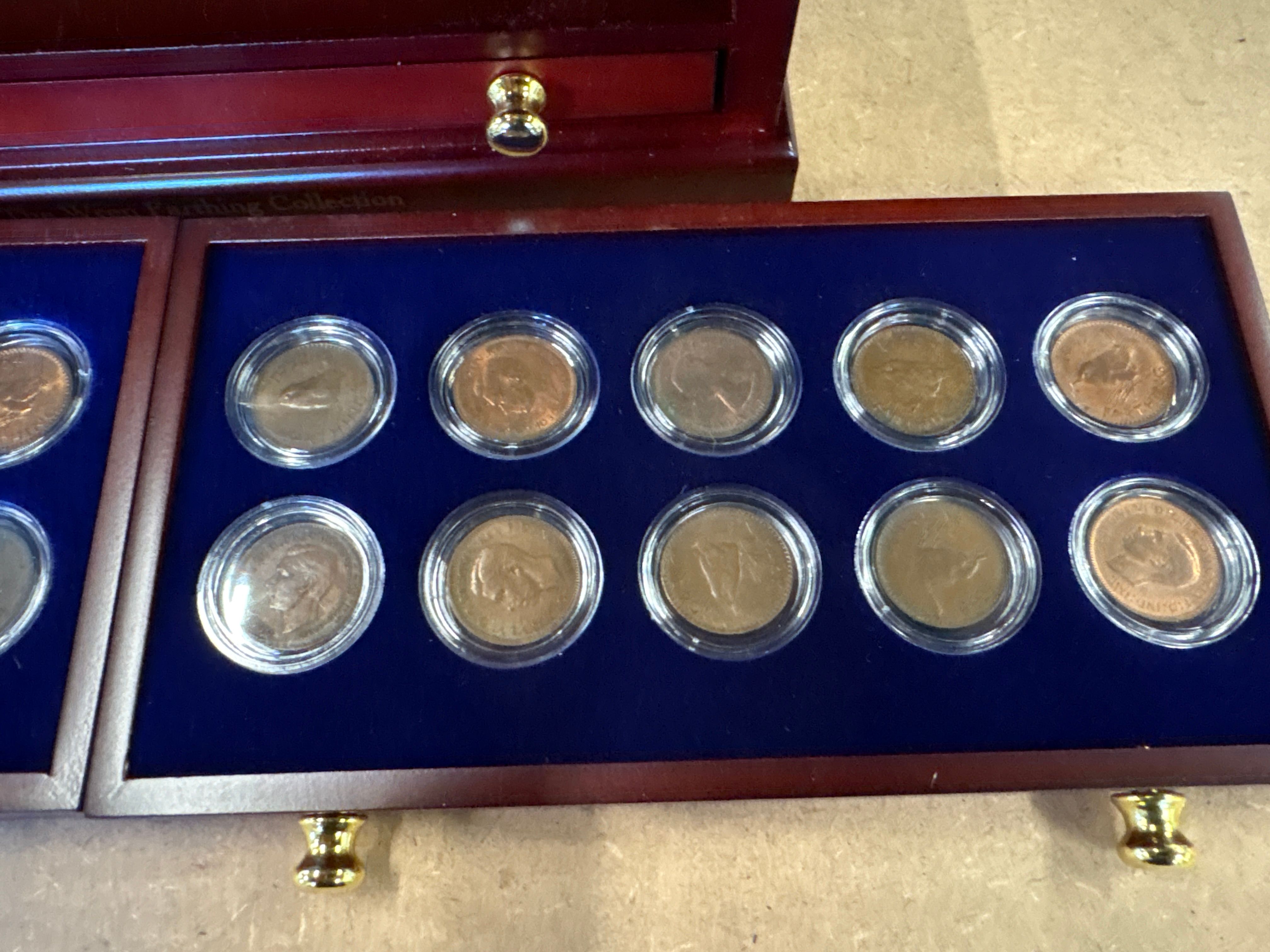 The Wren Farthing Collection comprising copper-toned coins in protective capsules housed within a mahogany-coloured wooden chest featuring blue velvet-lined trays and a bird figurine.