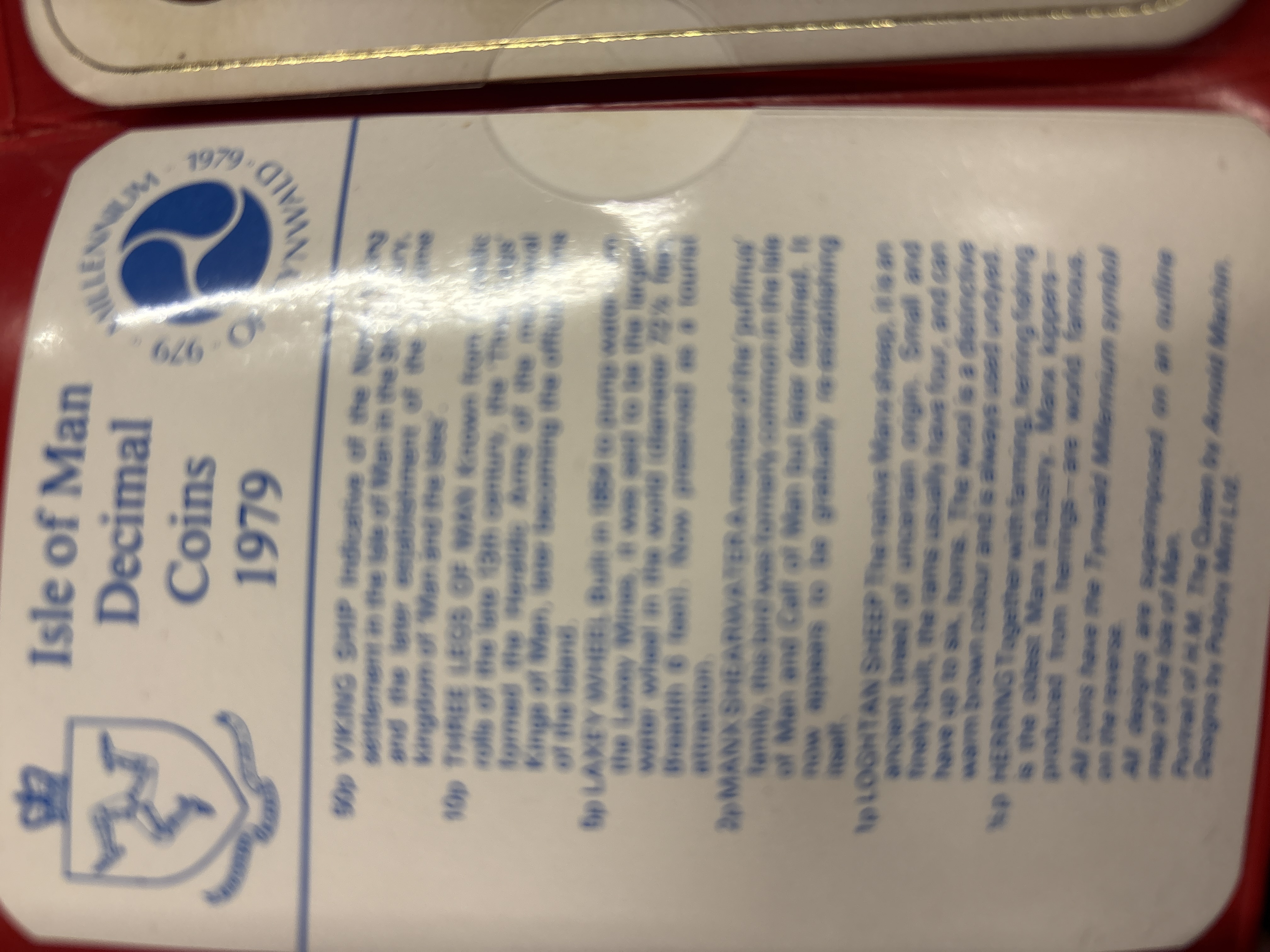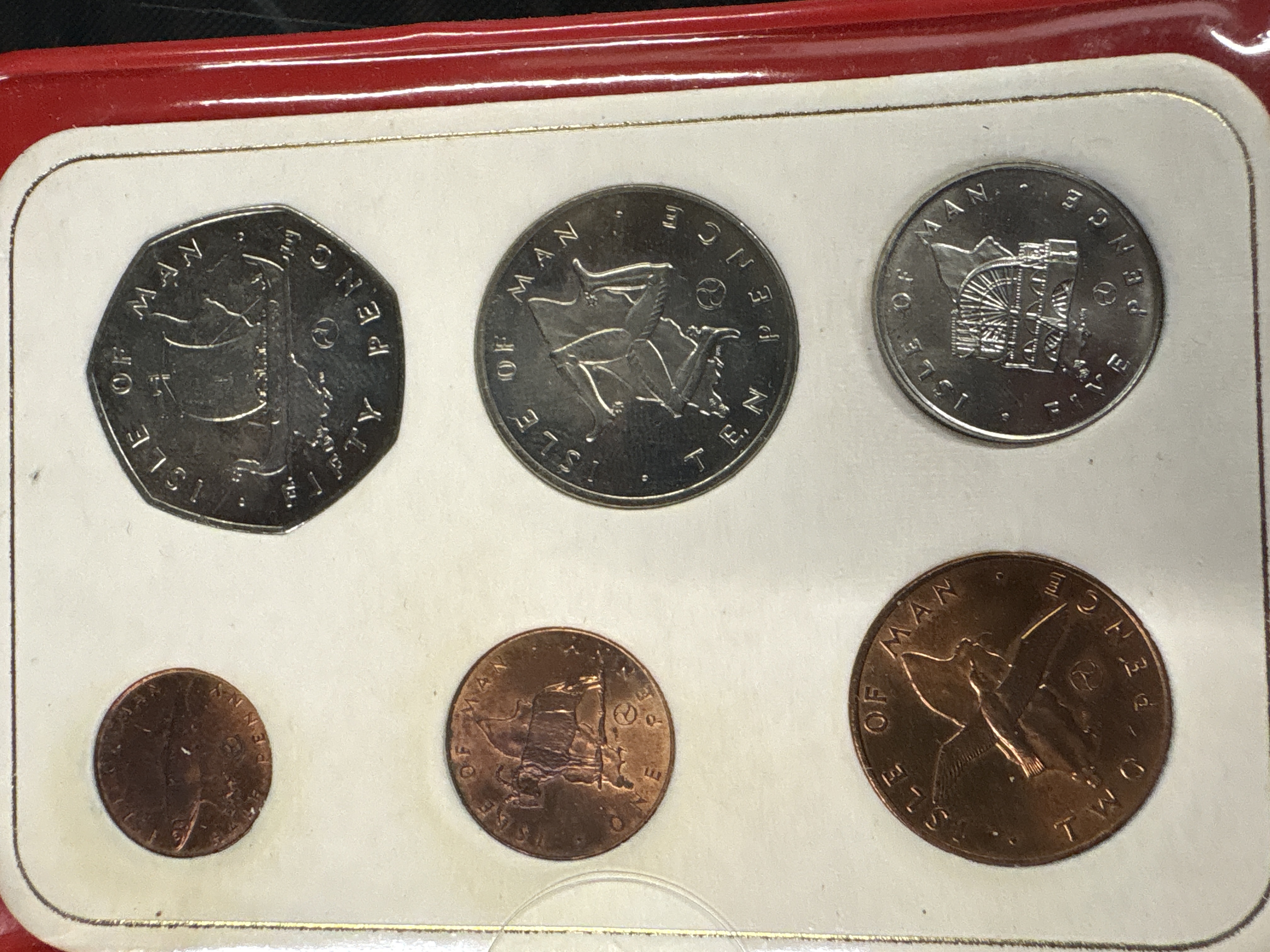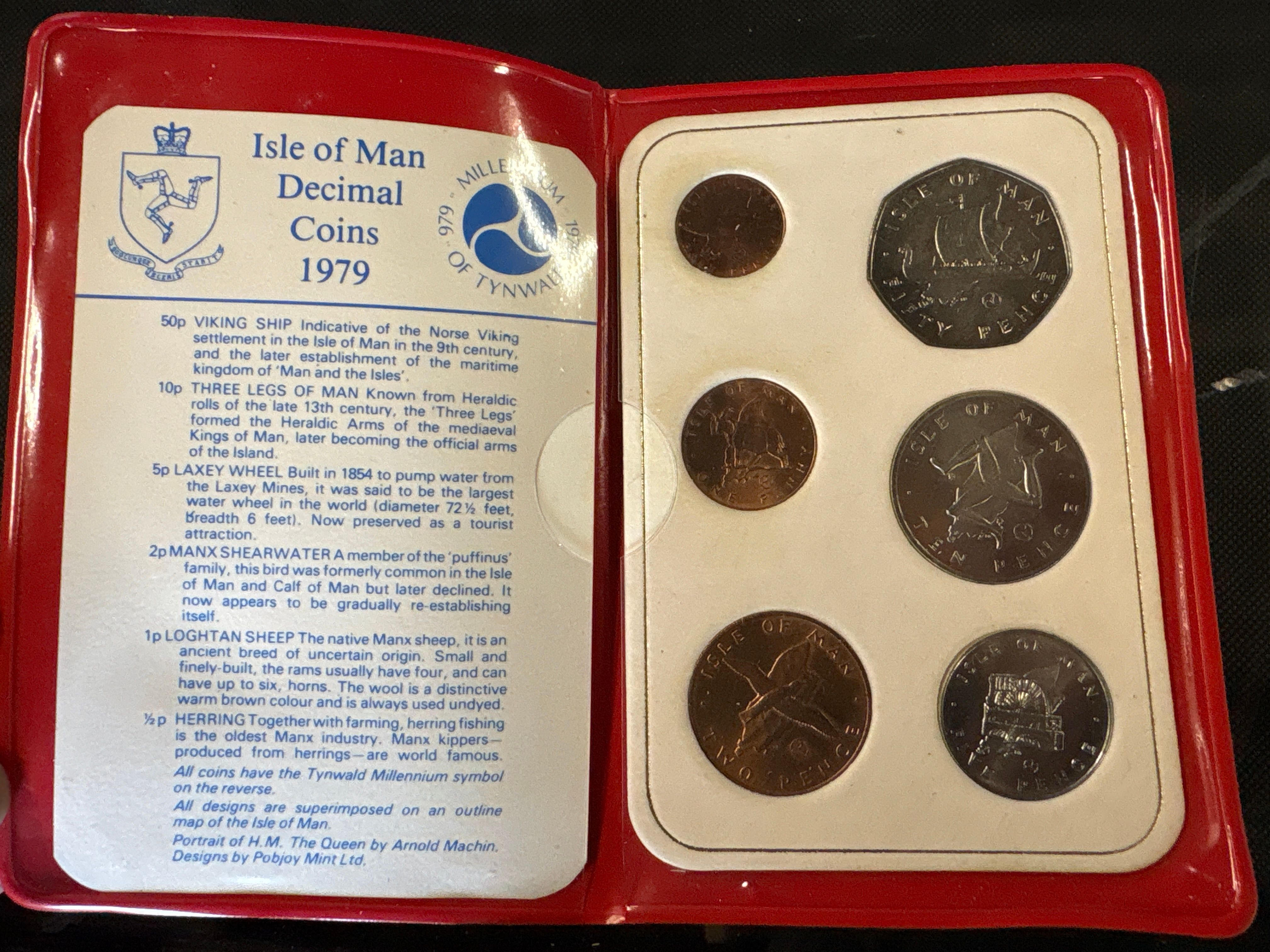 A Collection of Coins issued by the Pobjoy Mint to commemorate the Millennium of Tynwald. Obverse portrait by Arnold Machin. Reverse designs include Viking Ship, Three Legs of Man, Laxey Wheel, Manx Shearwater, Loghtan Sheep, and Herring types. All reverses feature the Tynwald Millennium logo. This set was issued to mark the 1000th anniversary of the Manx parliament.