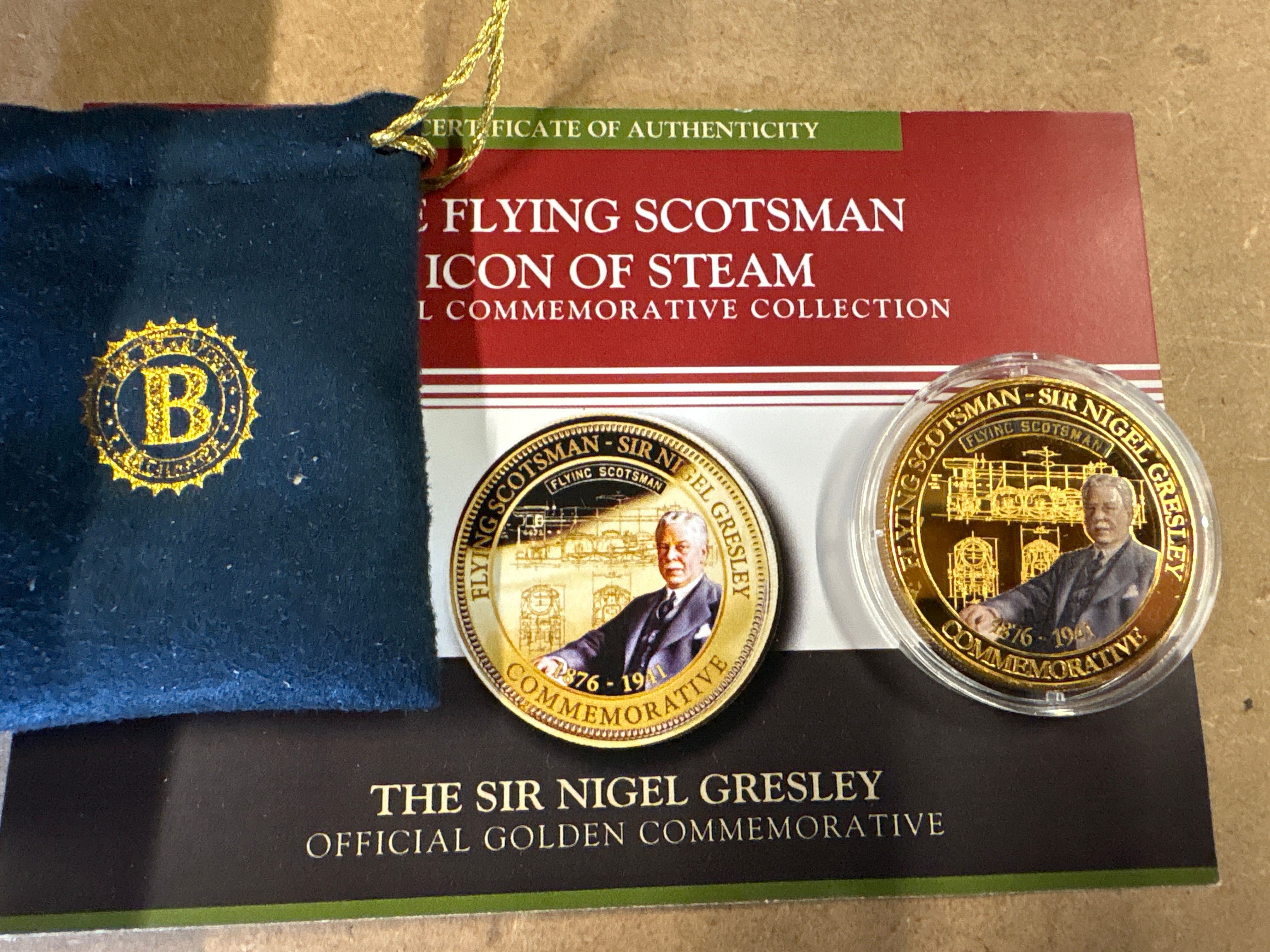 Private issue by The Bradford Exchange for the Icons of Steam Official Commemorative Collection. Sir Nigel Gresley / Technical Diagrams obverse. This gold layered commemorative medal is part of the Flying Scotsman coin series. Issued to honour the engineering legacy of Sir Nigel Gresley. Includes Certificate of Authenticity and branded fabric pouch.