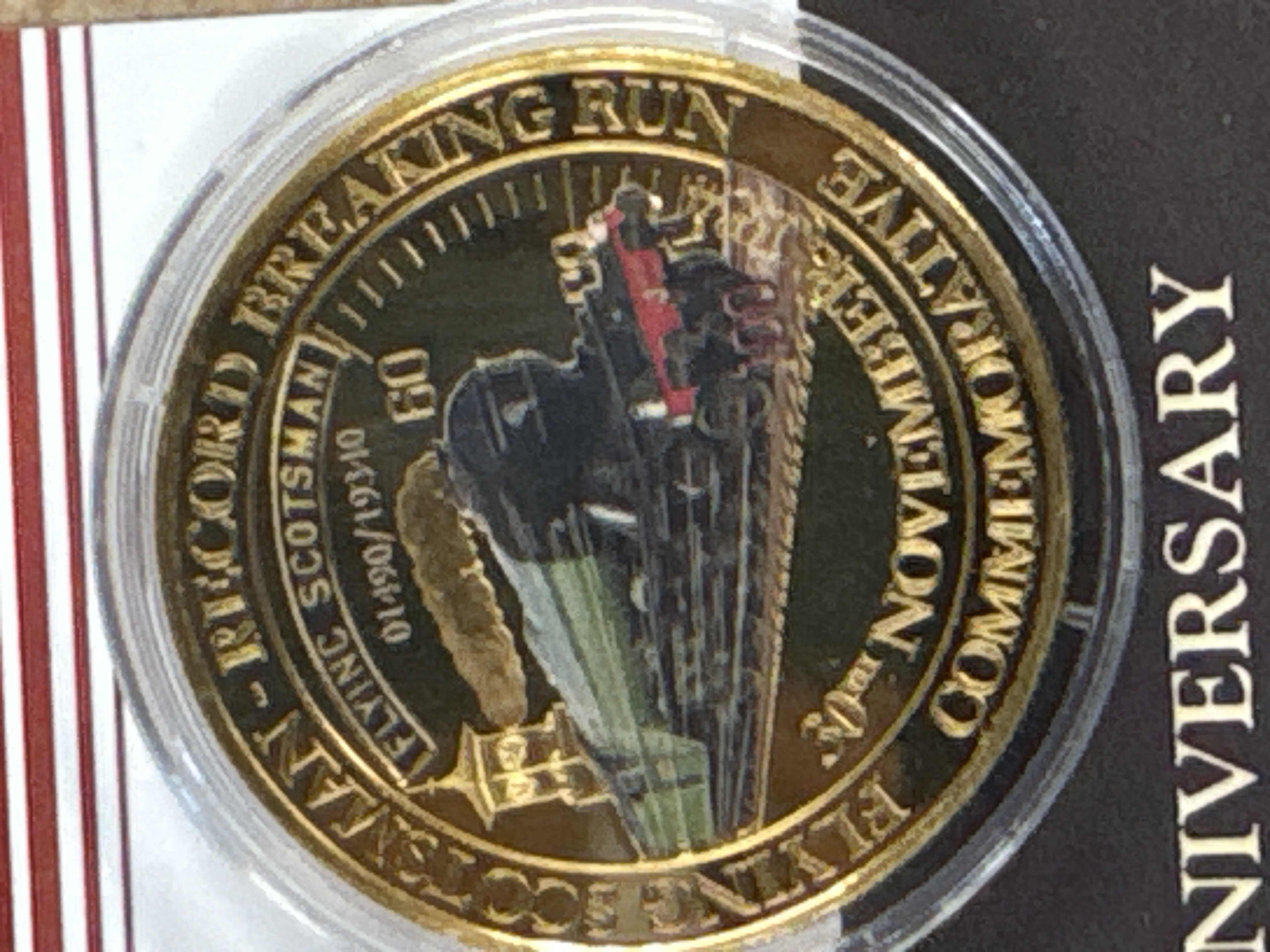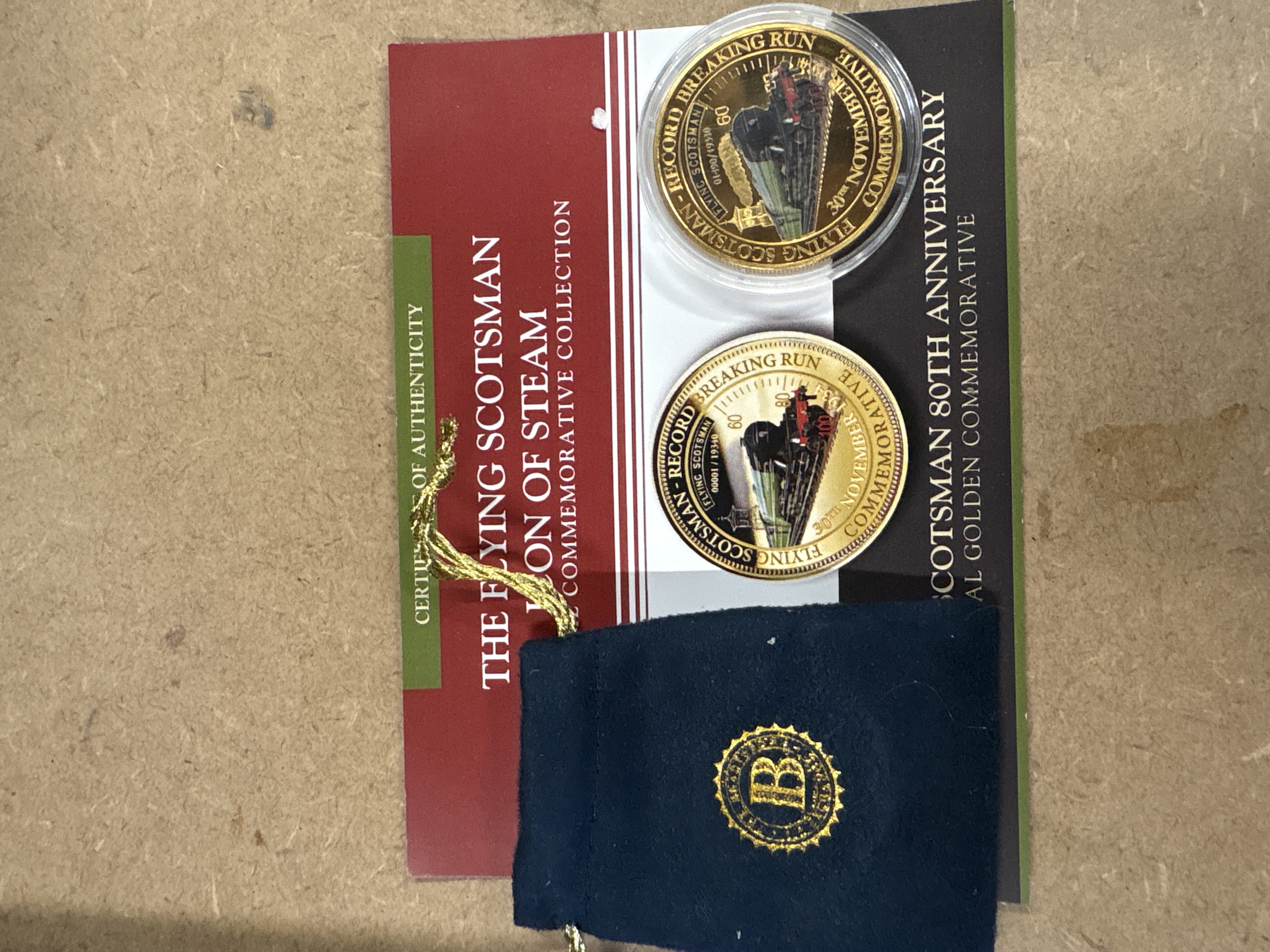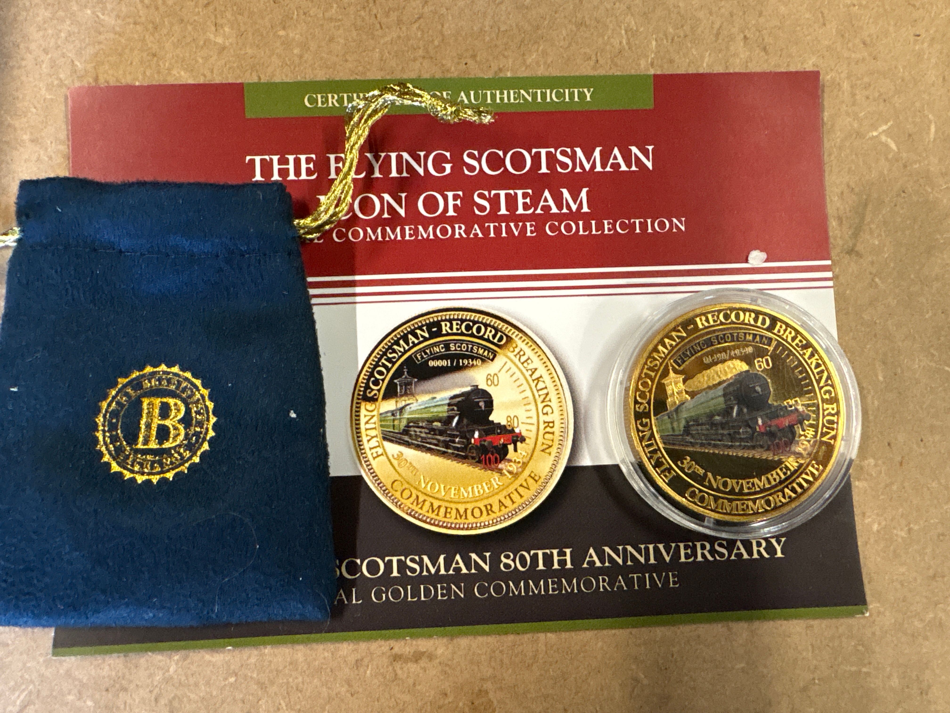 Issued by The Bradford Exchange as part of the Flying Scotsman Icon of Steam Special Commemorative Collection. Design type: Flying Scotsman / Record Breaking Run. Features a colourised obverse, a speed indicator scale, and serial number 01490 / 19340. Accompanied by a Certificate of Authenticity and a blue velvet-style presentation pouch with an embroidered emblem. Commemorates the 80th anniversary of the 1934 speed record.