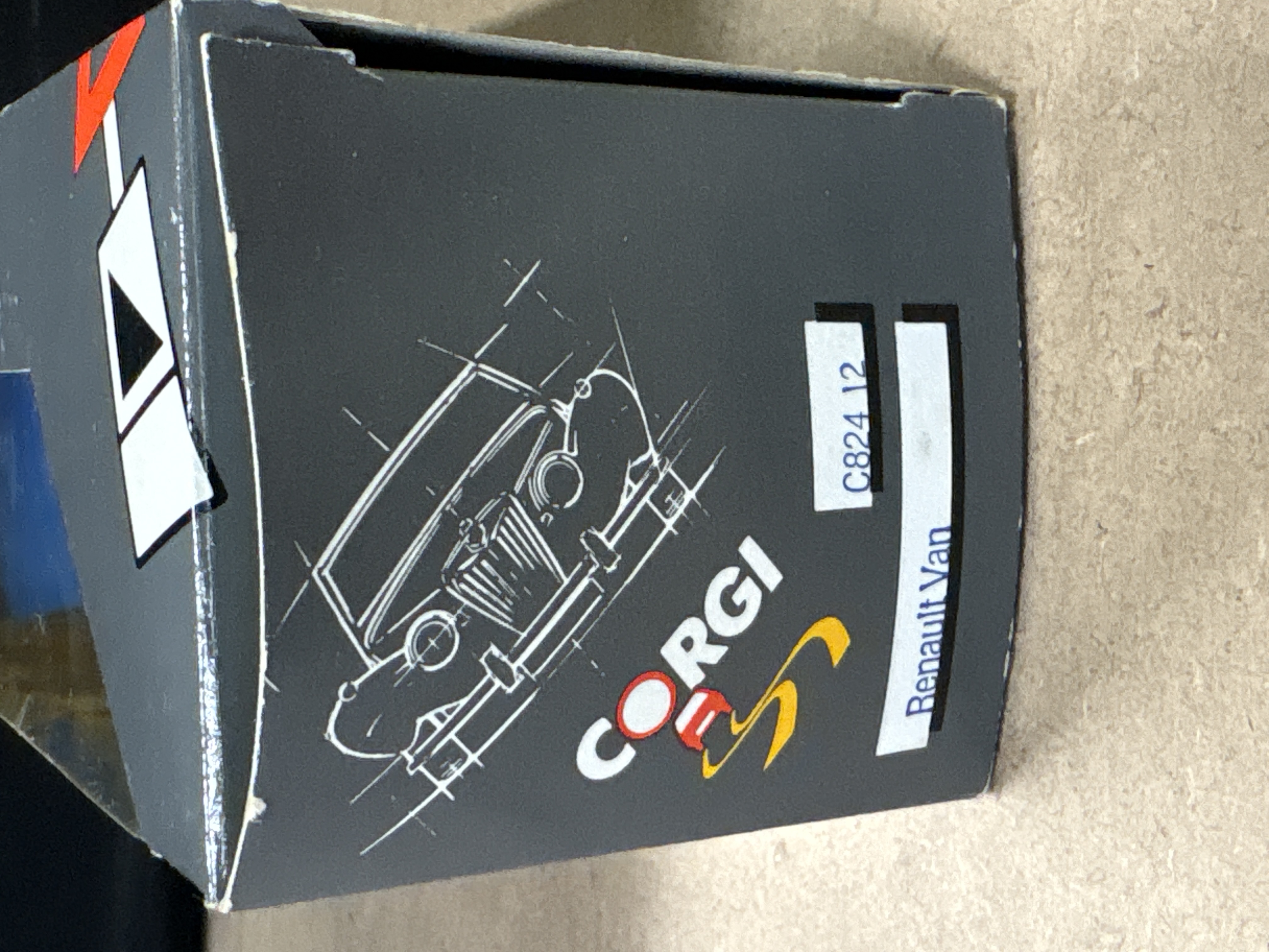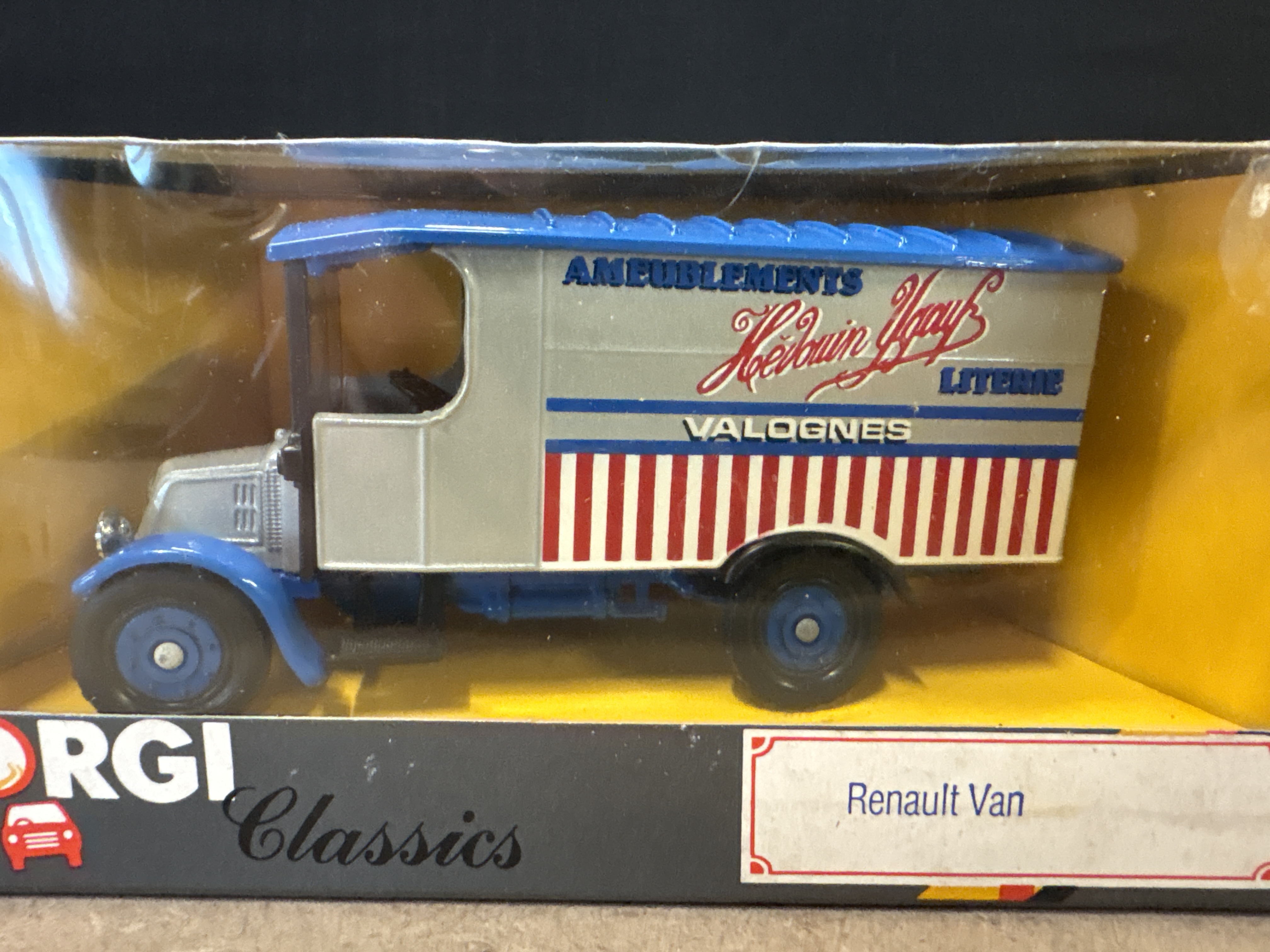 A Corgi Classics 1926 Renault Van, model number C824/12, manufactured in England during the mid-1980s. This metal model is finished in a silver and blue colour scheme, featuring detailed livery for Ameublements Herbin-Youf Literie Valognes with red and white vertical stripes on the side panels. The vehicle includes a blue roof and wings, with free-rolling wheels. The item is presented in its original grey Corgi Classics window display box.