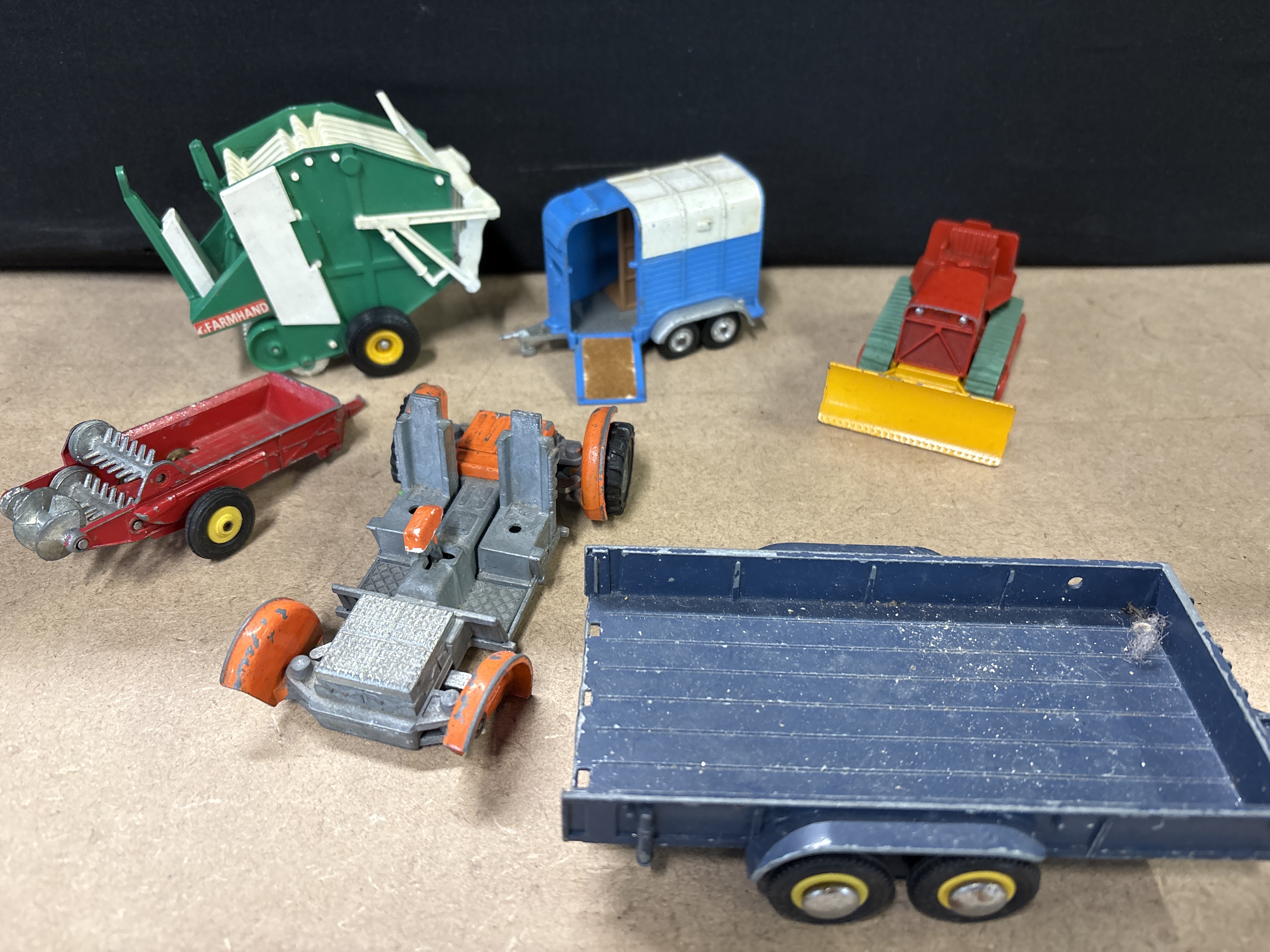 A collection of 6 vintage metal farm and construction models primarily manufactured by Britains Ltd and Matchbox (Lesney). This lot includes a Vermeer / Farmhand round baler featuring an opening rear section and authentic decals, a Britains manure spreader with a rotating drum mechanism linked to the wheels, and a Britains horse trailer finished in blue with a white roof and a functional fold-down loading ramp. The set also features a Matchbox Lesney No. 8 Caterpillar crawler tractor with an adjustable front blade and green rubber tracks, a Britains blue low-loader flatbed trailer, and an incomplete orange and grey tractor chassis. All items are constructed from metal, consistent with mid-century die-cast production. This group represents a diverse range of agricultural equipment and machinery from leading British toy manufacturers. No original packaging is included.