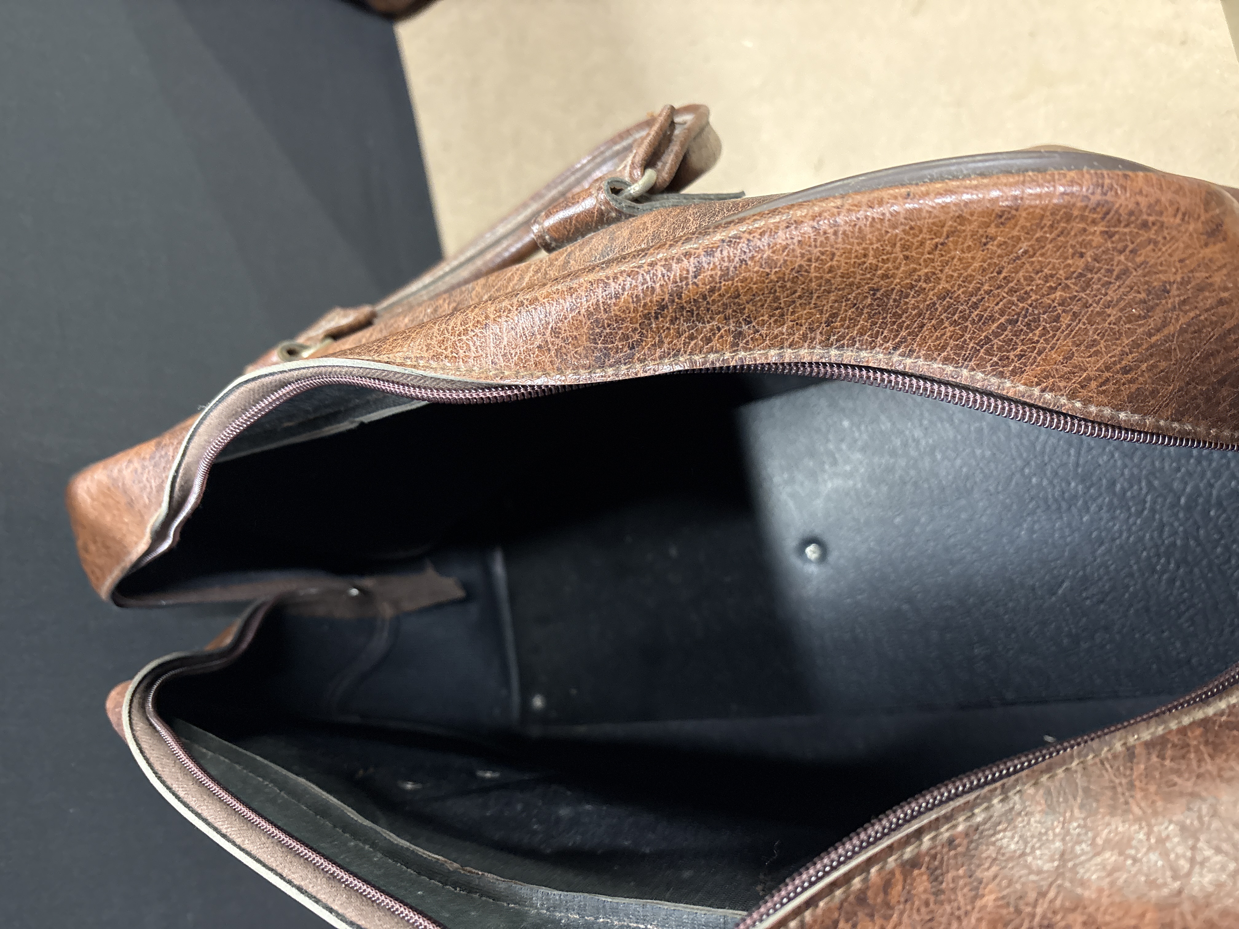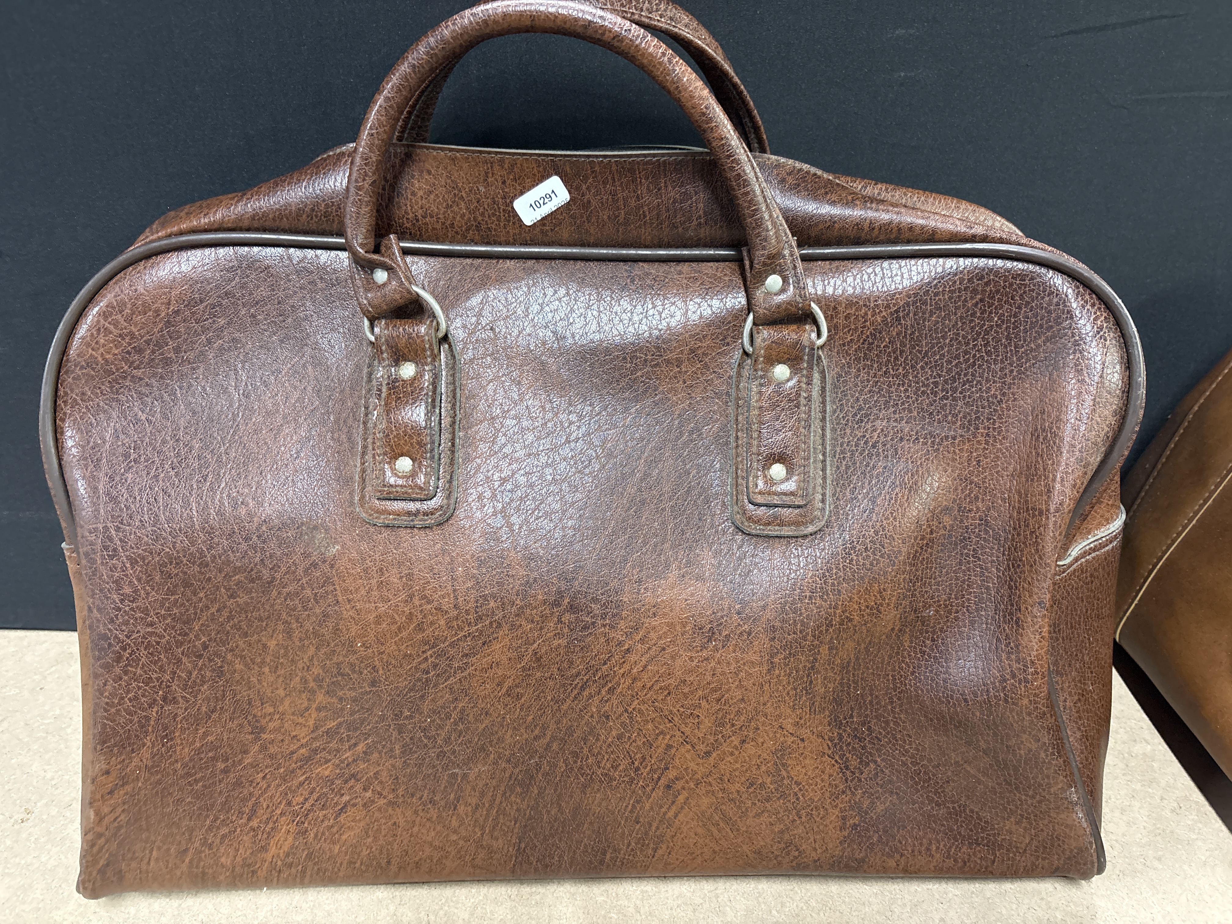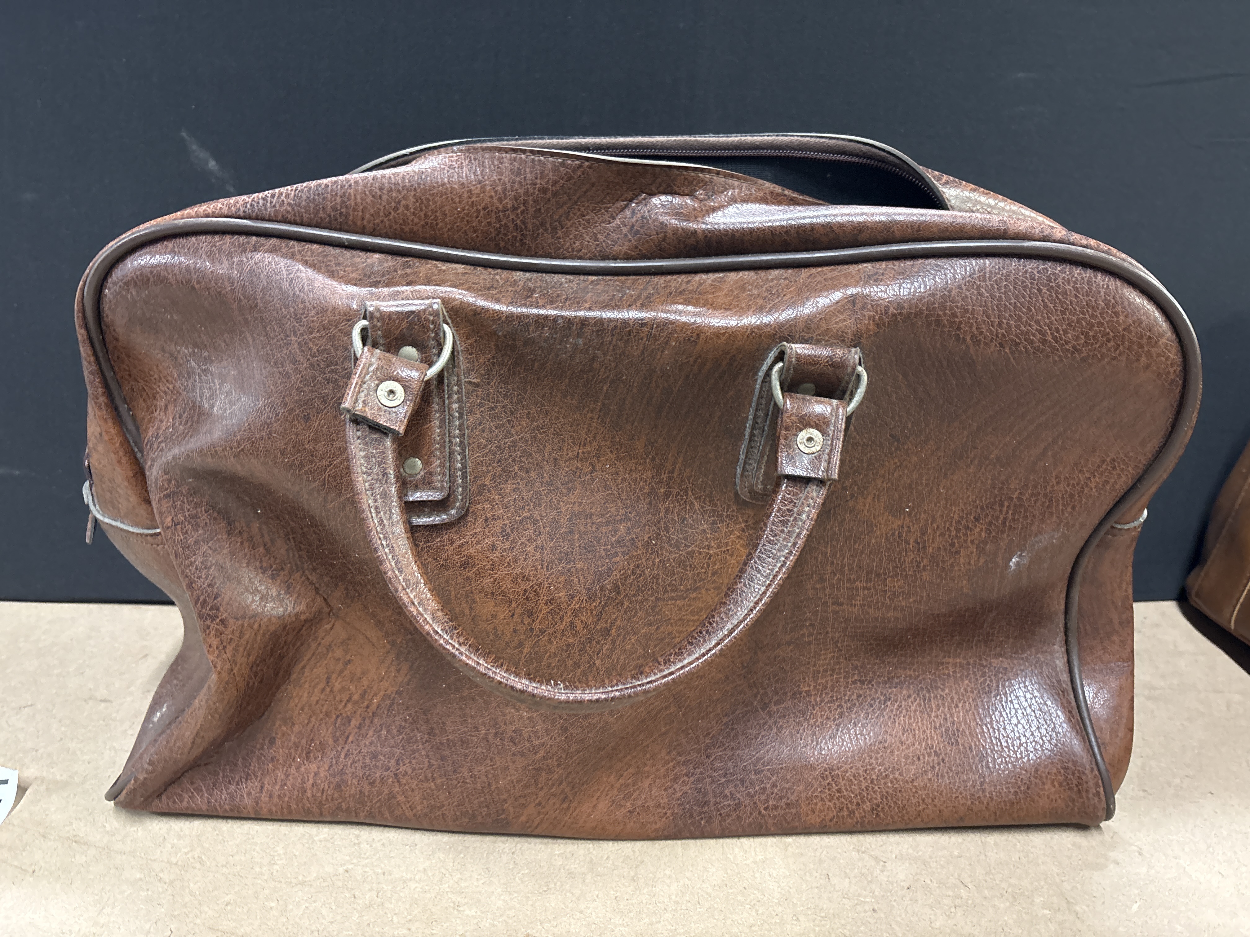 A large brown leather carry bag featuring a textured finish, twin handles, and a zippered main compartment.