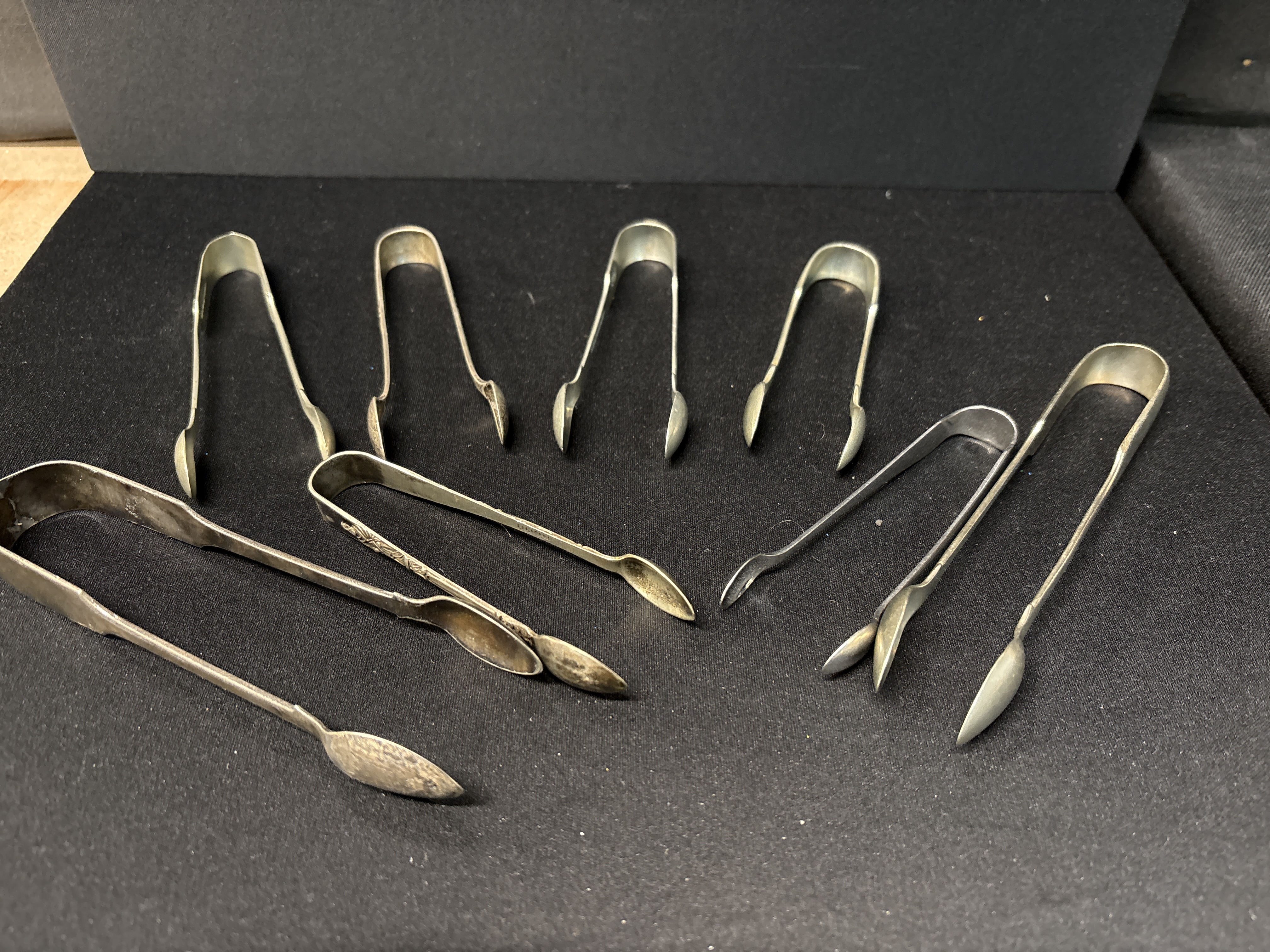 A varied collection of eight silver-plated sugar tongues, primarily dating from the late 19th to early 20th centuries. The group features a range of traditional bow-form designs, including examples with spoon, claw, and shell-shaped nips. Decorative motifs across the collection include ornate chased and embossed floral and scrollwork patterns characteristic of the Victorian and Edwardian eras, alongside more minimalist, polished designs. One example is attributed to Wingfield, typical of the period’s domestic serving ware. These pieces were designed for the formal service of sugar cubes within a traditional tea service. Various lengths, approximately 10cm to 15cm.