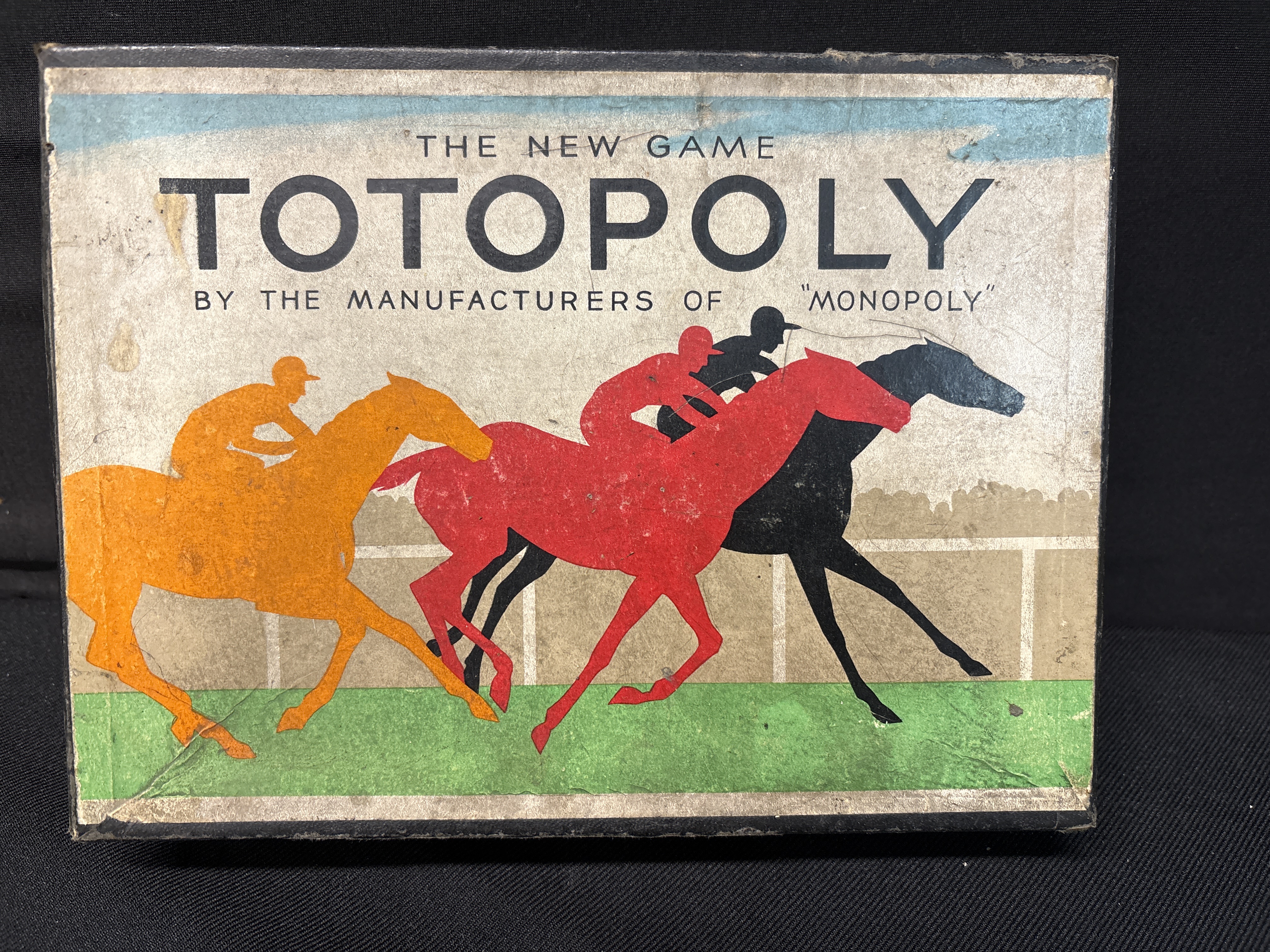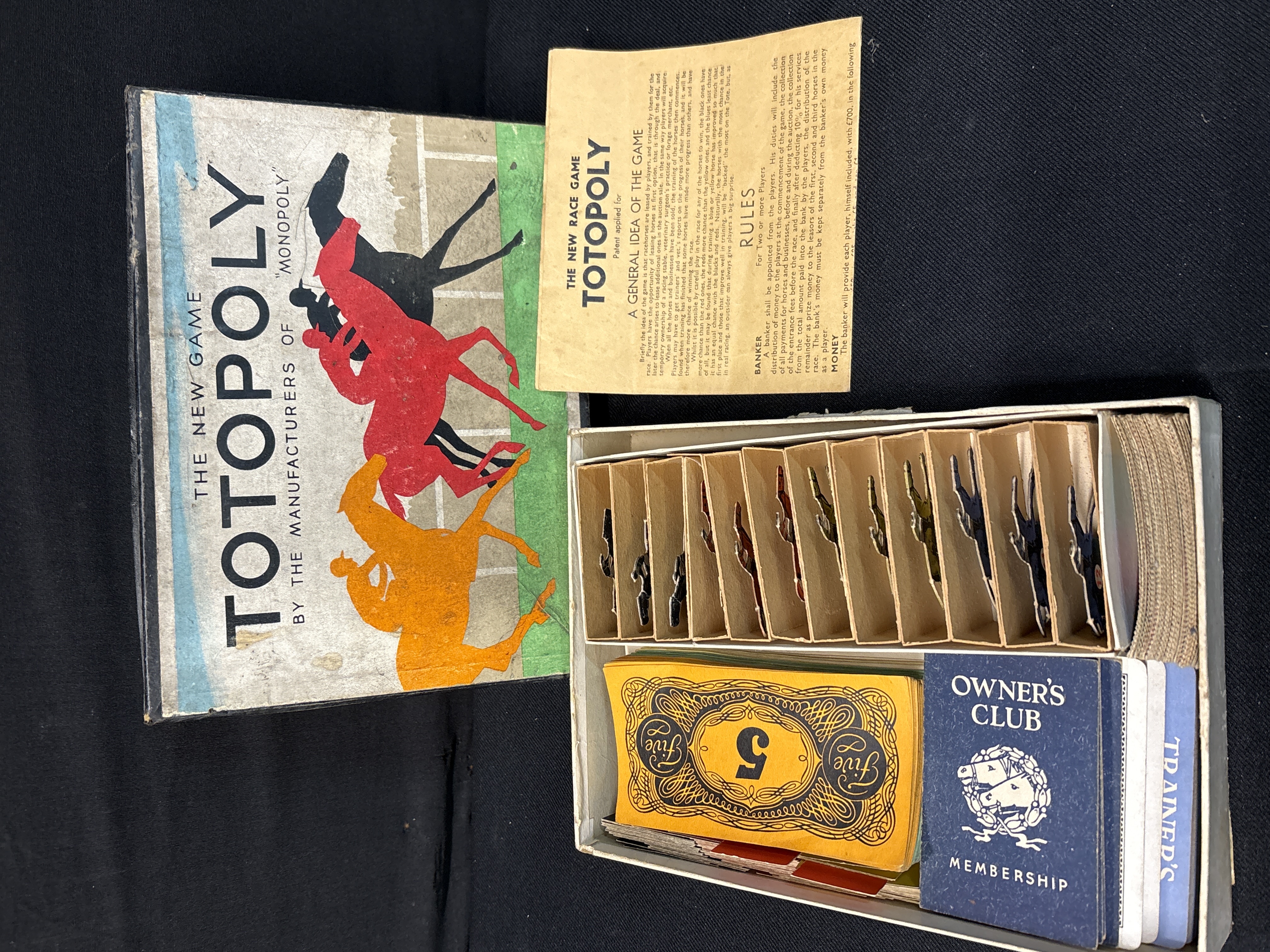 A rare early example of the vintage Totopoly horse racing board game, manufactured by John Waddington Ltd. of Leeds. This first edition set, marketed as “The New Game” by the manufacturers of “Monopoly,” dates to approximately 1938, as evidenced by the “Patent applied for” inscription on the original rule sheet. The game is housed in its original illustrated cardboard box and includes a collection of hand-painted lead horse and jockey playing pieces organised within a compartmentalised internal tray. The lot features a stack of yellow “Five” denomination play currency, “Owner’s Club Membership” cards, and “Trainer’s” cards. This set represents a significant piece of mid-20th-century leisure history, capitalising on the success of Monopoly with a sophisticated equestrian theme.