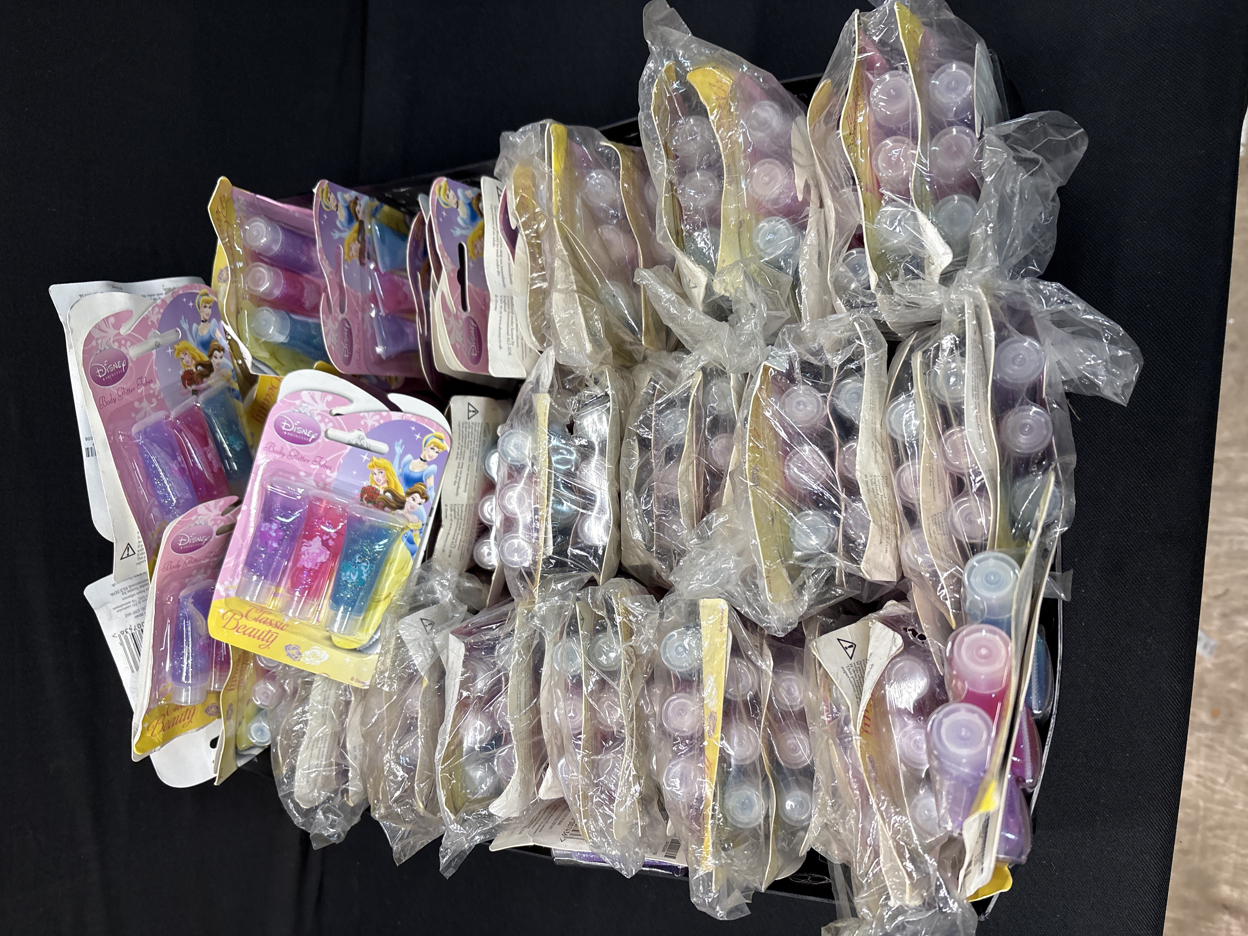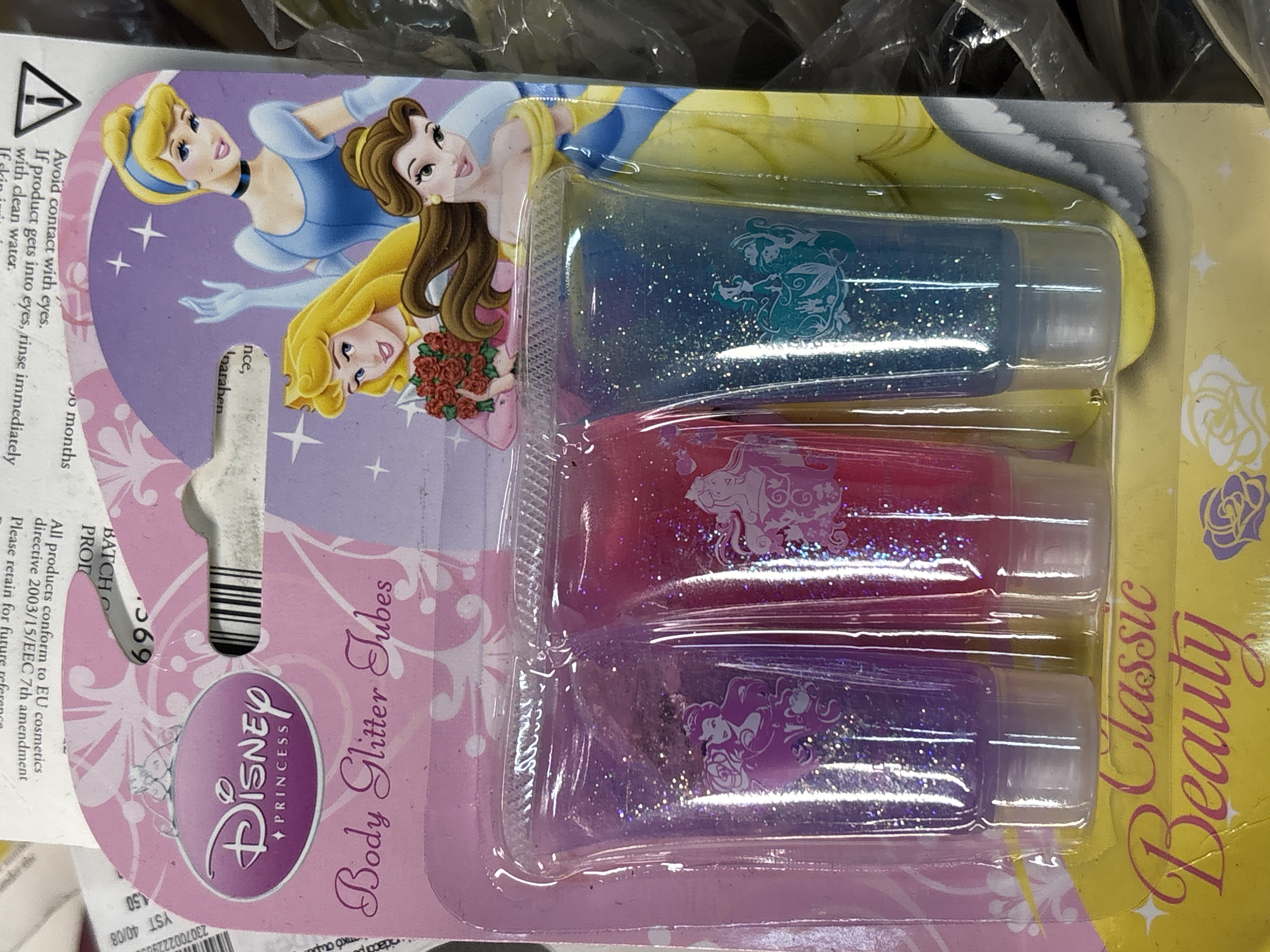A substantial quantity of Disney Princess Classic Beauty body glitter sets, manufactured by Townley Girl. Each individual retail blister pack contains three plastic tubes of glitter in shimmering blue, pink, and purple colours. The card backings feature vibrant graphics of the Disney characters Cinderella, Belle, and Aurora. The packaging carries the official Disney Princess logo and states that the product conforms to the EU cosmetics directive 2003/15/EEC. A batch code of 669 is printed on the card, and a partial barcode label indicates a date of circa 2008. This large amount of Disney body glitter is presented as new-old-stock, with many units still contained within their secondary clear plastic protective bags.