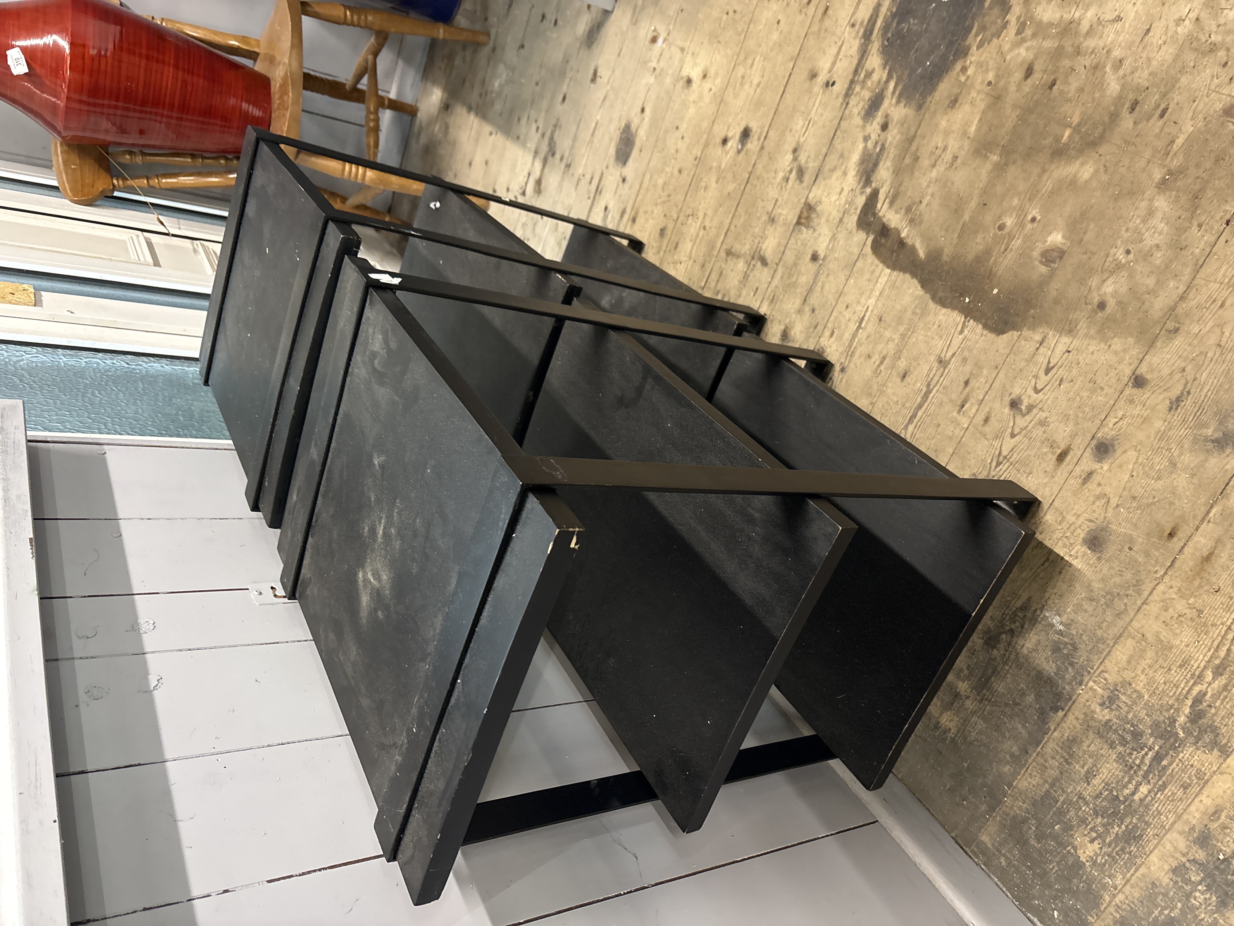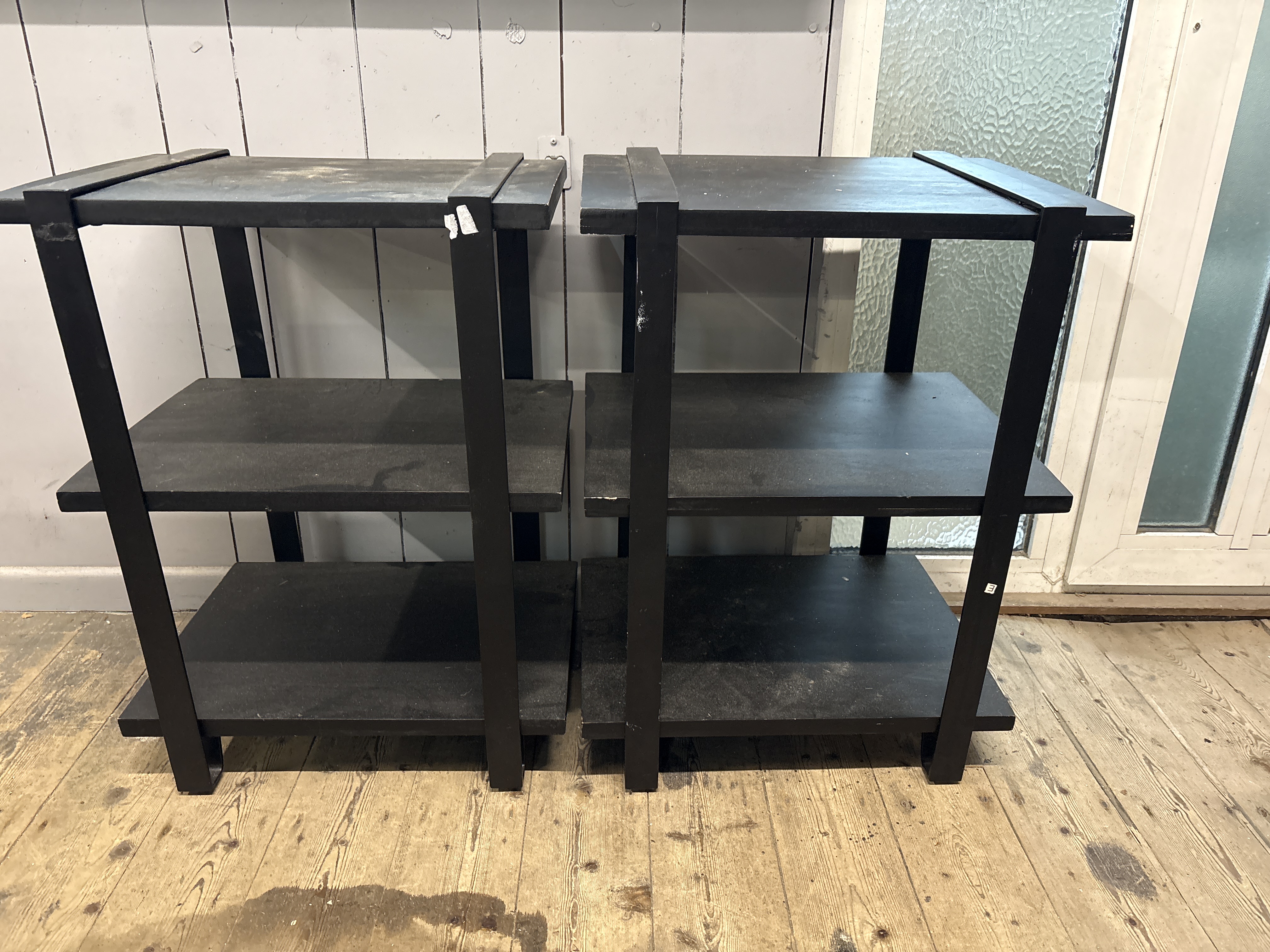 A pair of Furinno Turn-S-Tube three-tier shelving units. These minimalist display stands are wood and metal framed, featuring a geometric design where the vertical frame members wrap over the top shelf. Each unit provides three levels of storage or display space finished in a matte black. Small white adhesive inventory labels are visible on the frames.