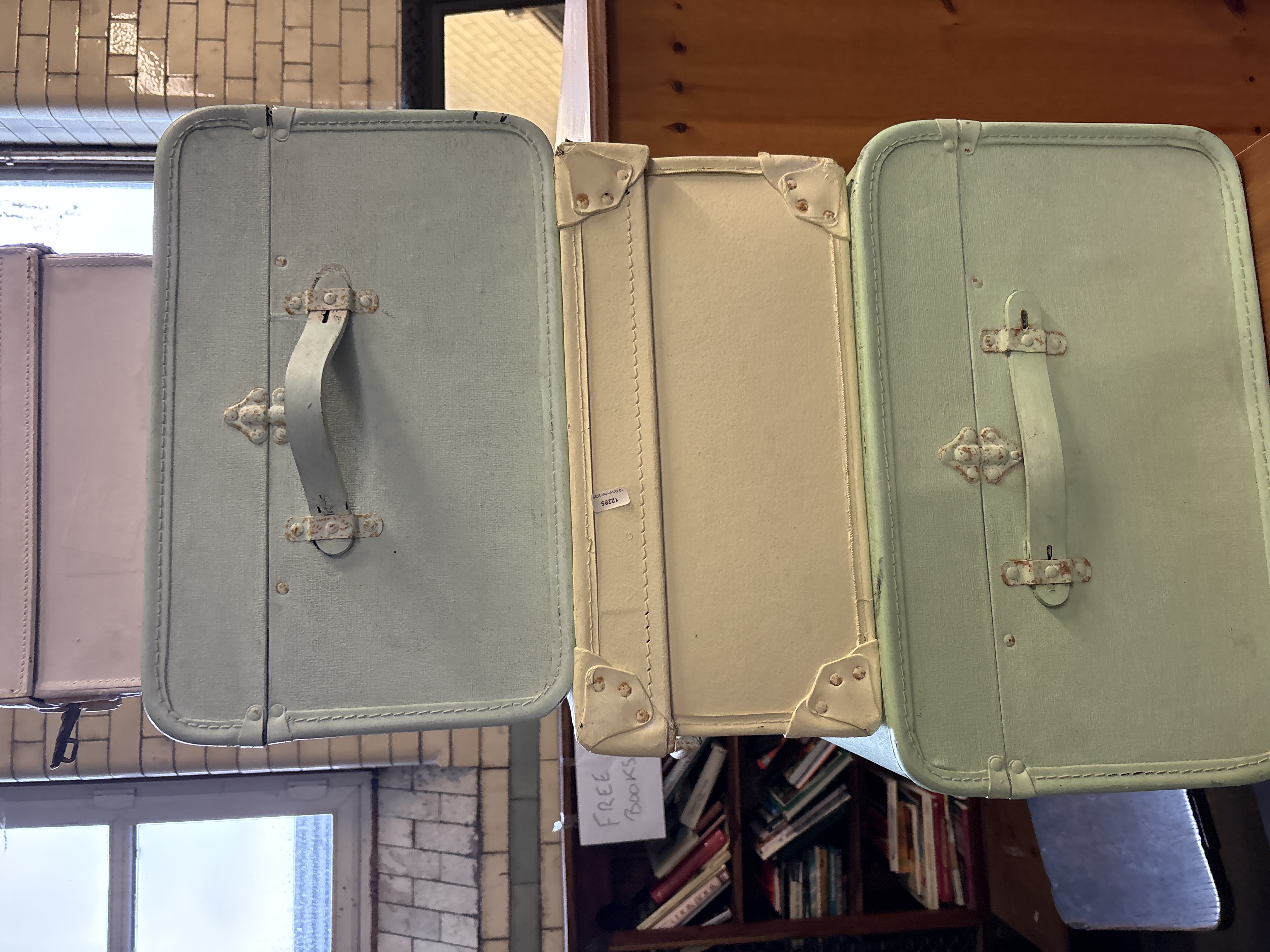 This collection comprises a set of four vintage hard-sided suitcases, specifically curated as a set of paints display suitcases for decorative use. The group features a coordinated palette of pastel shades, including lavender, light blue, off-white, and mint green. Each piece has been finished with a uniform textured exterior cladding and features colour-matched carry handles. The suitcases are constructed in the traditional mid-century manner with reinforced corners and metal hardware, including dual outer latches and central locking mechanisms. These items are ideal for use as retail props, theatrical sets, or shabby chic interior storage solutions. No manufacturer labels or serial numbers are present, indicating a custom refurbished finish applied to original vintage shells.